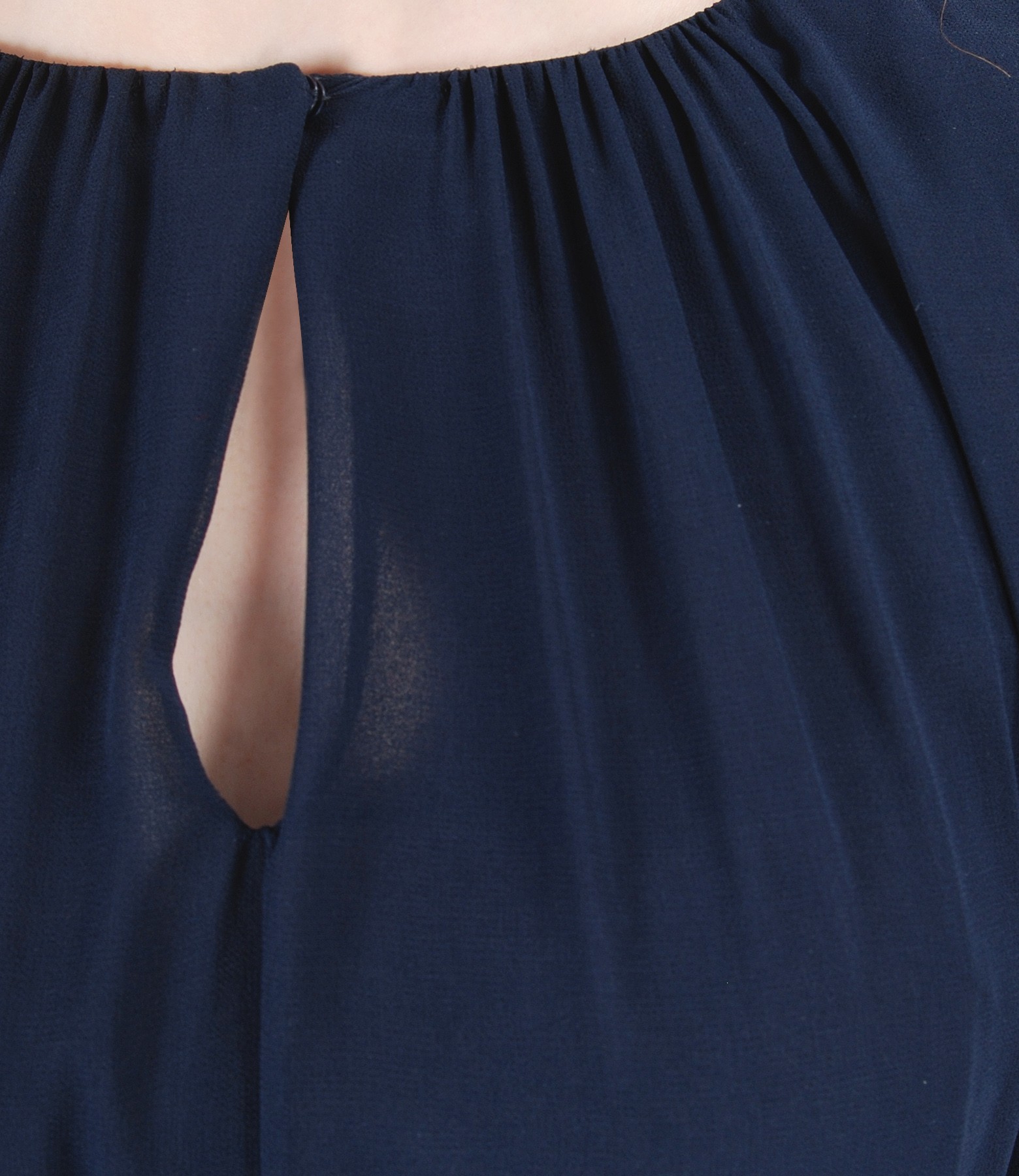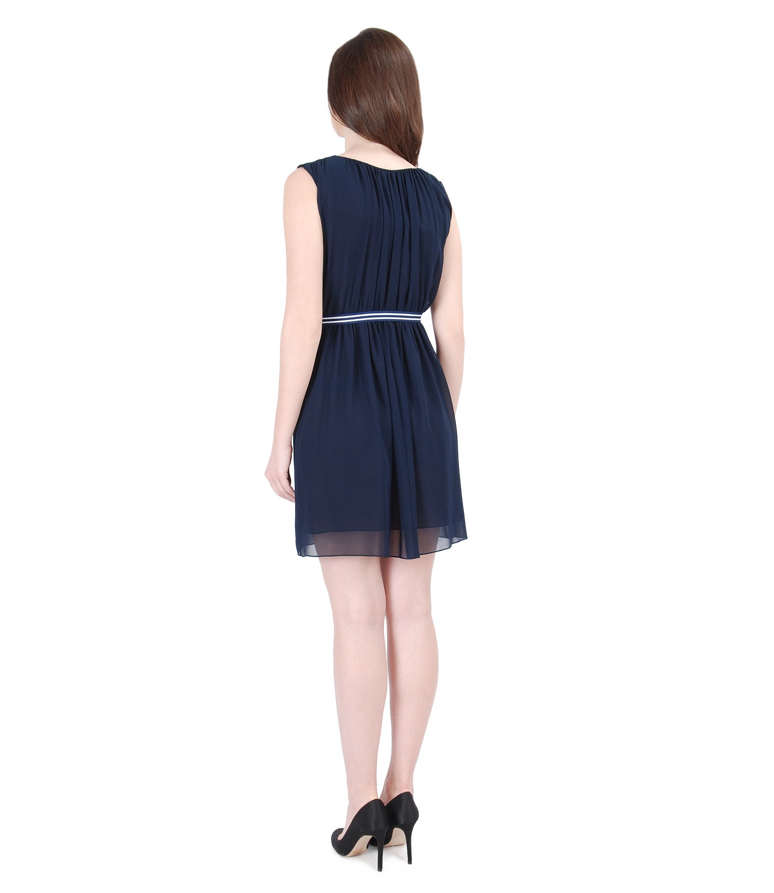 Veil dress, doubled, with round low-cut neck with dodge closed with a staple, elasticized waist and front and back folds. Tightens with a detachable waist belt.