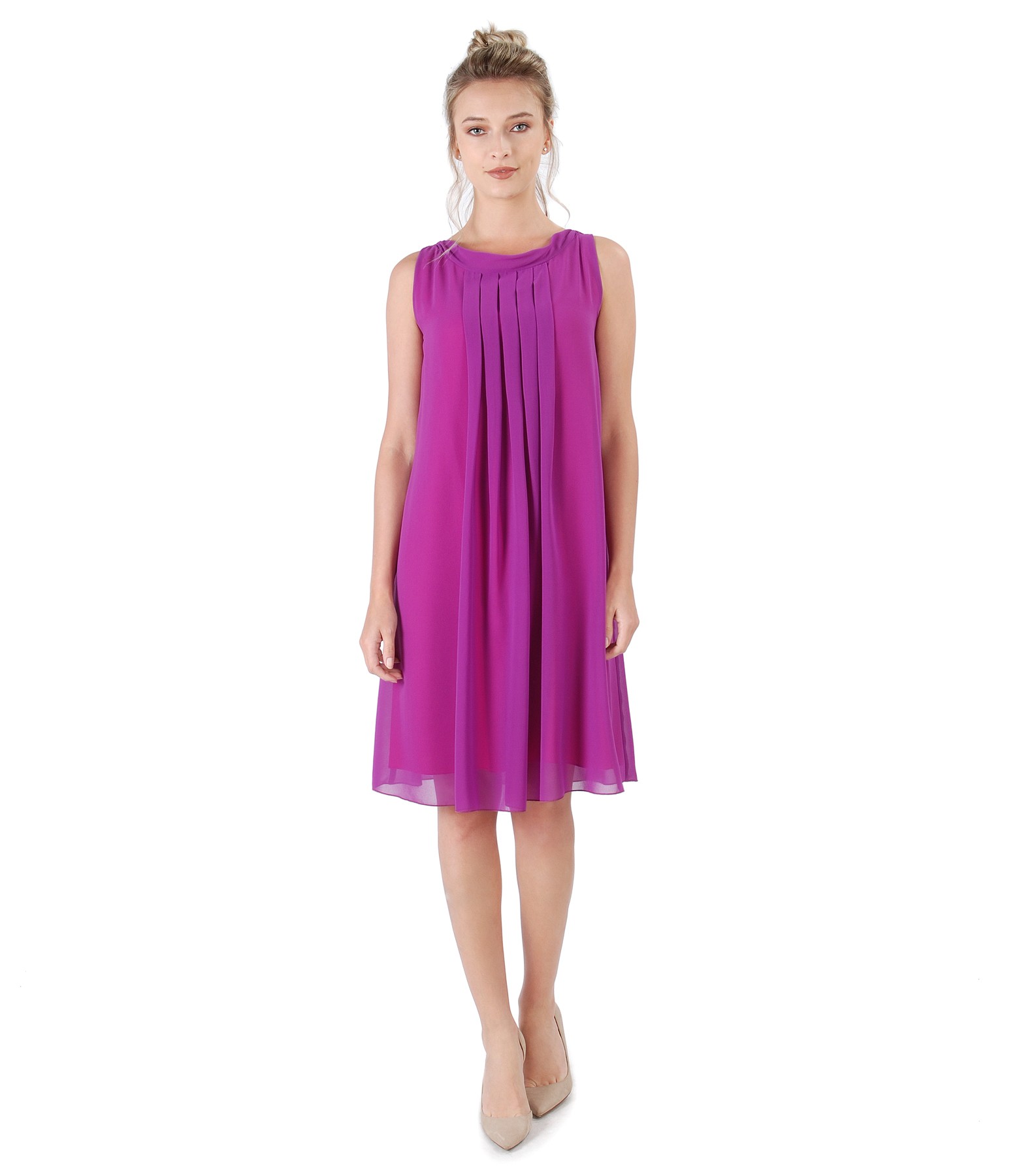 Casual veil dress, without sleeves, with front folds and trim on the low-cut neck. Has no closing system.