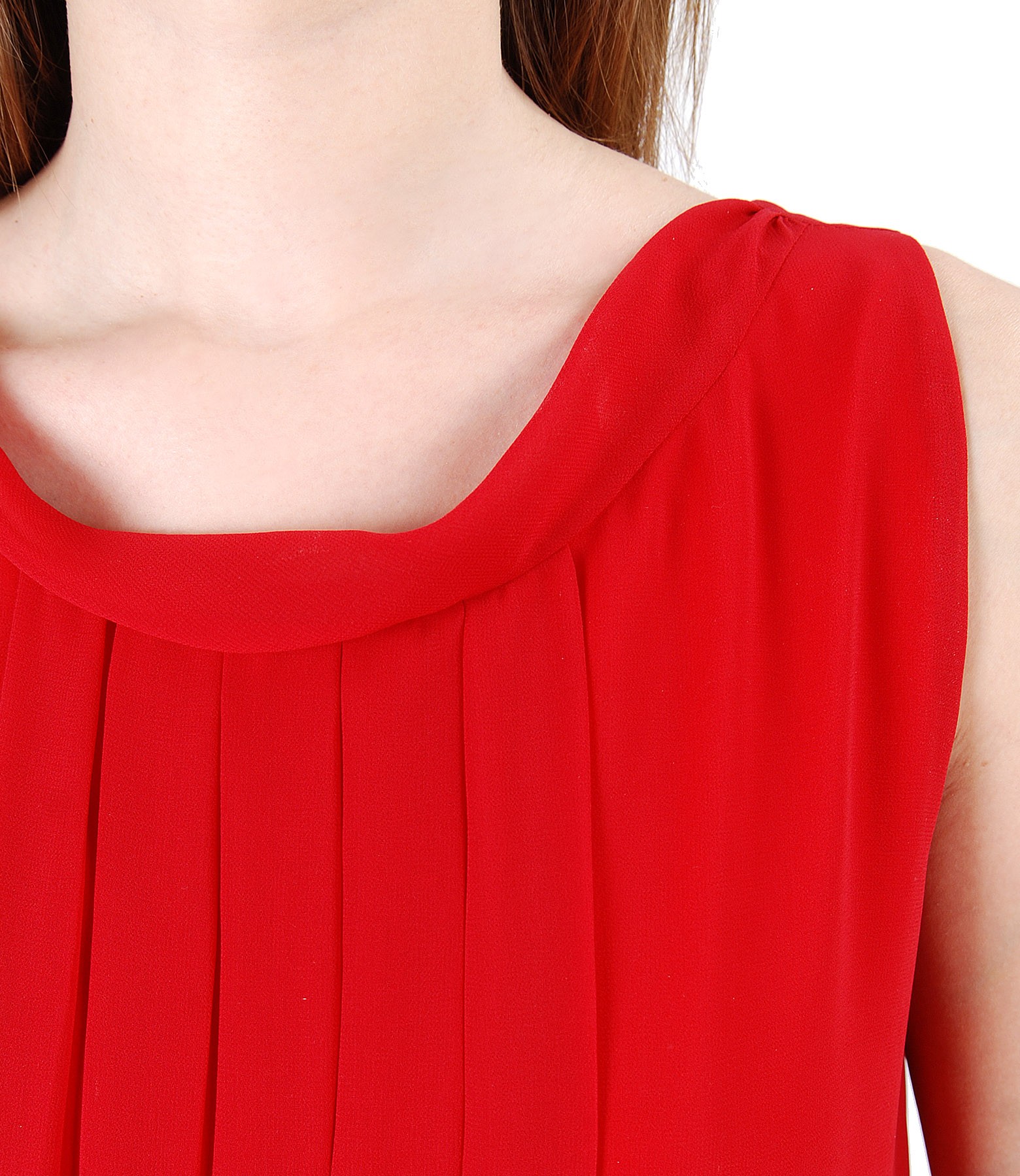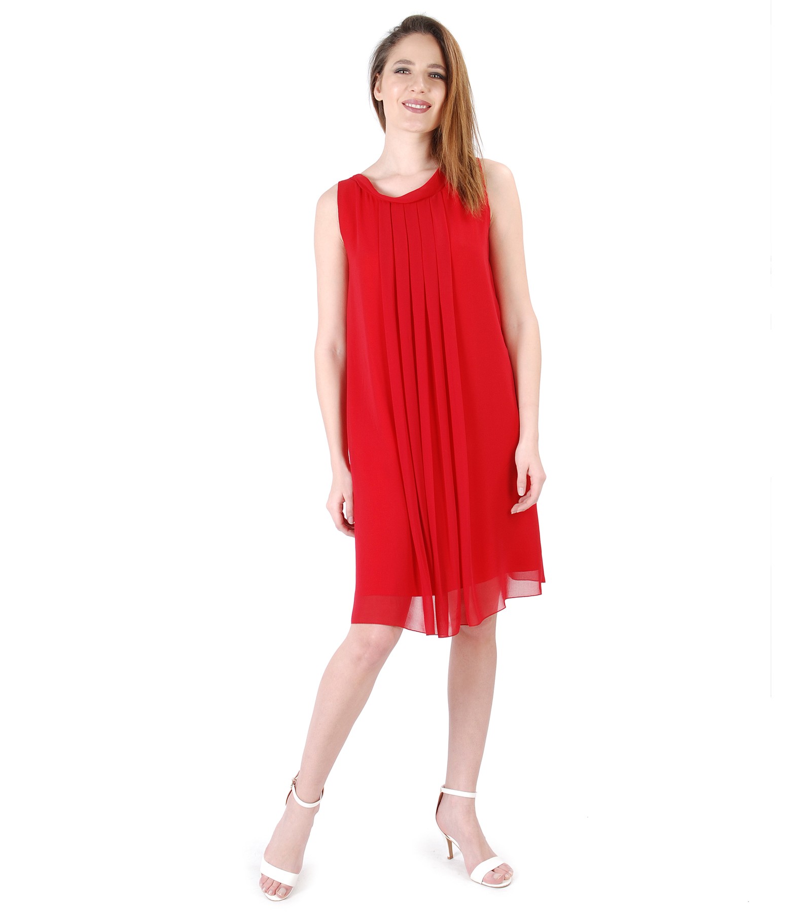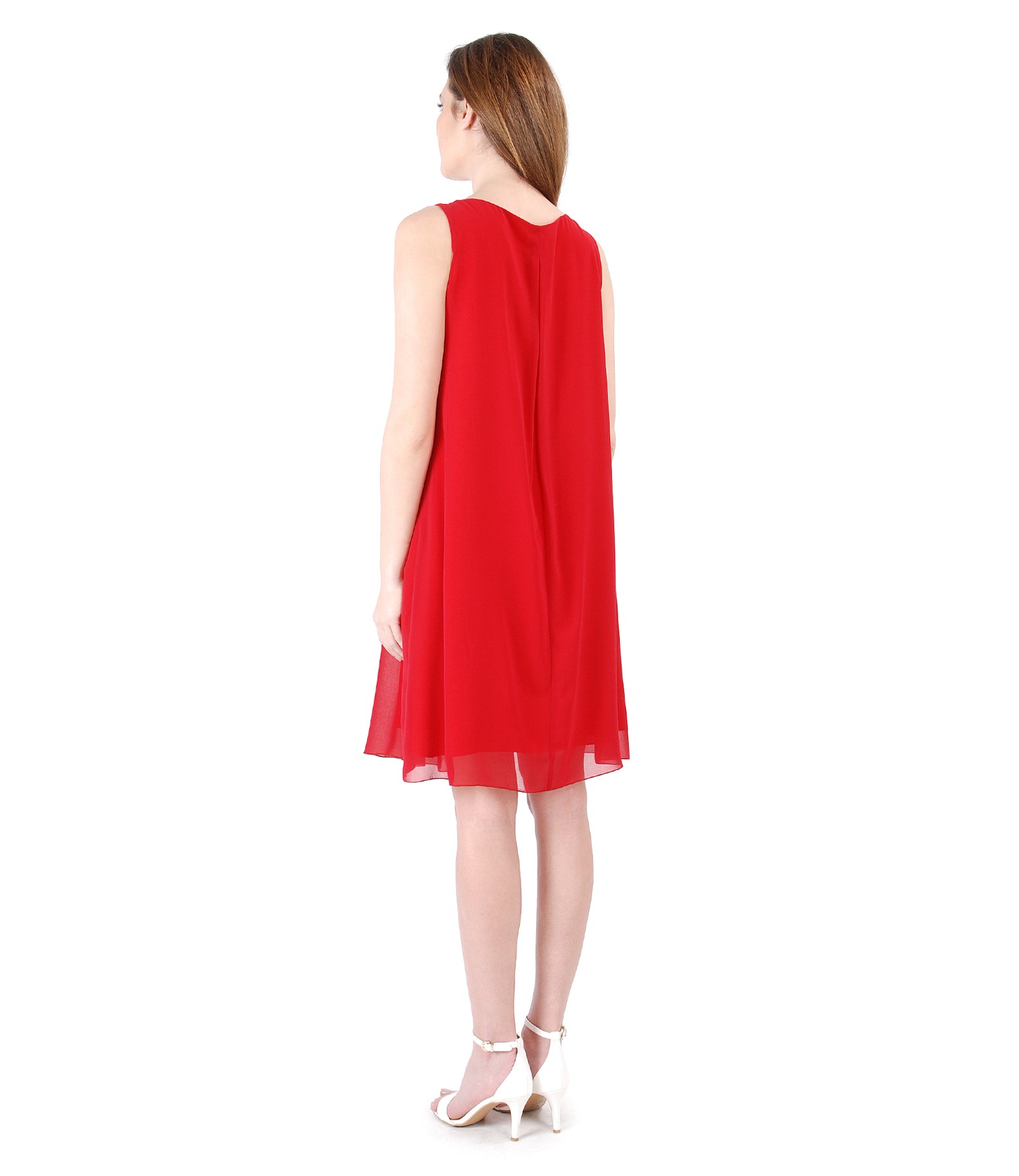 Casual veil dress, without sleeves, with front folds and trim on the low-cut neck. Has no closing system.