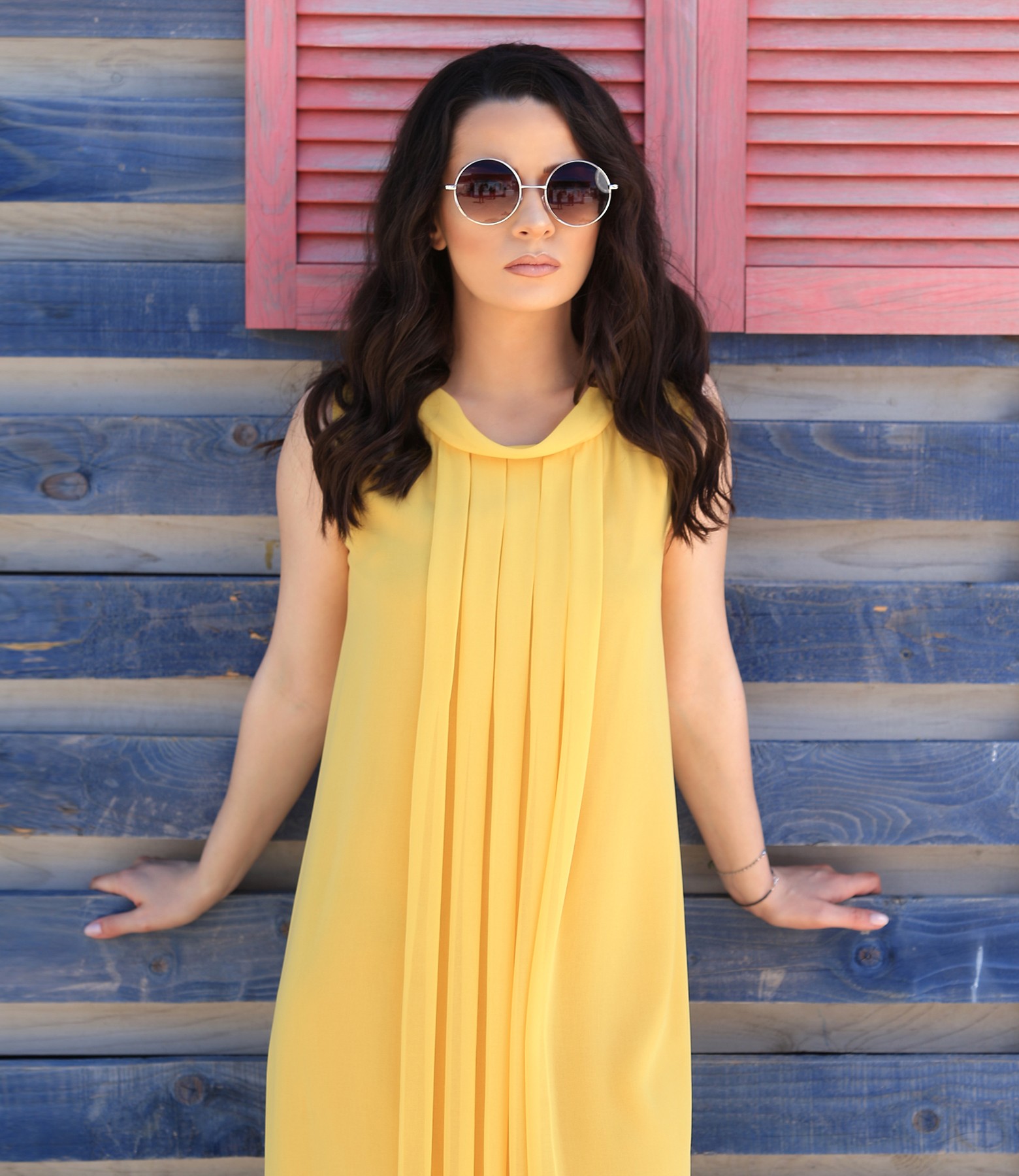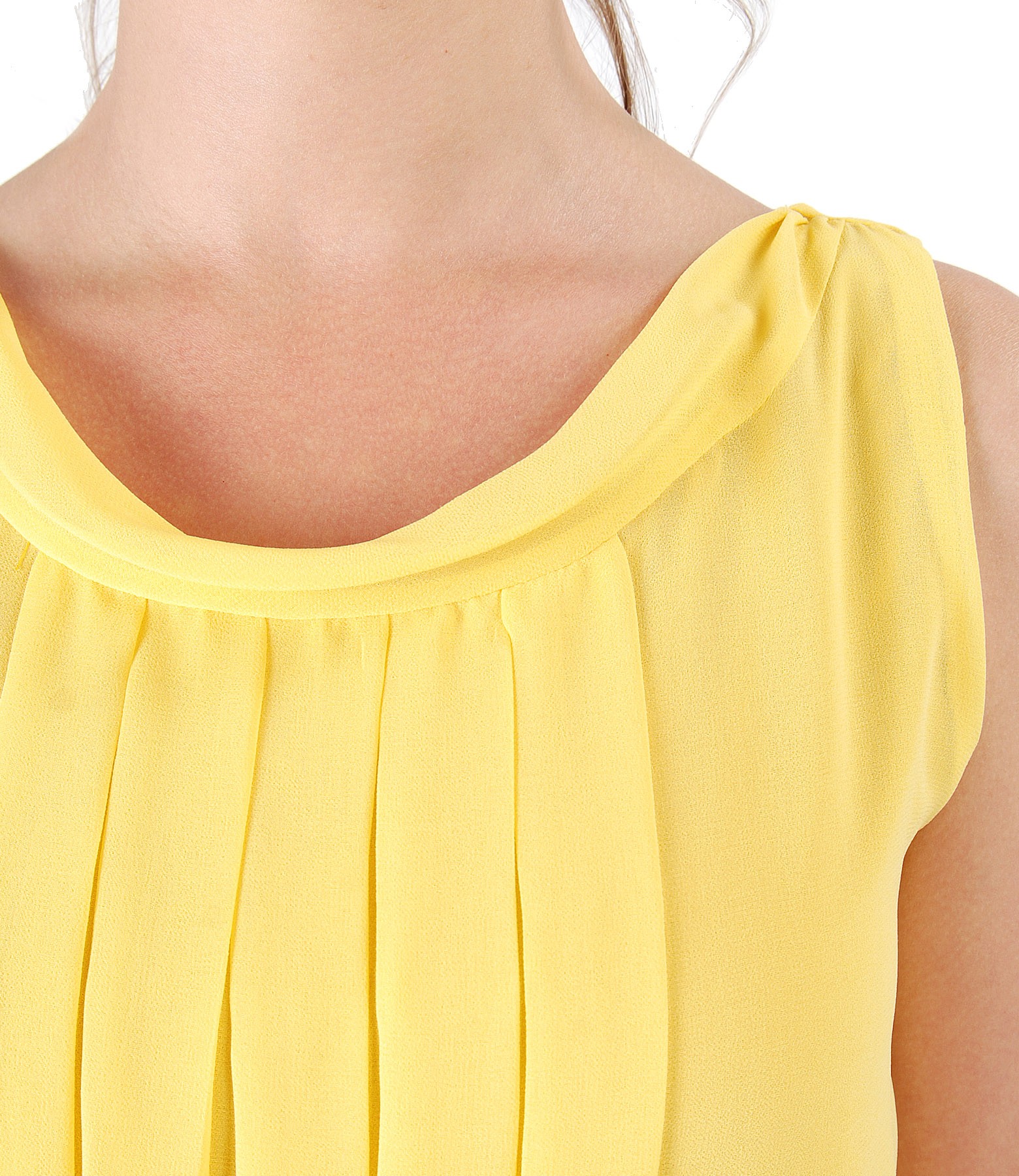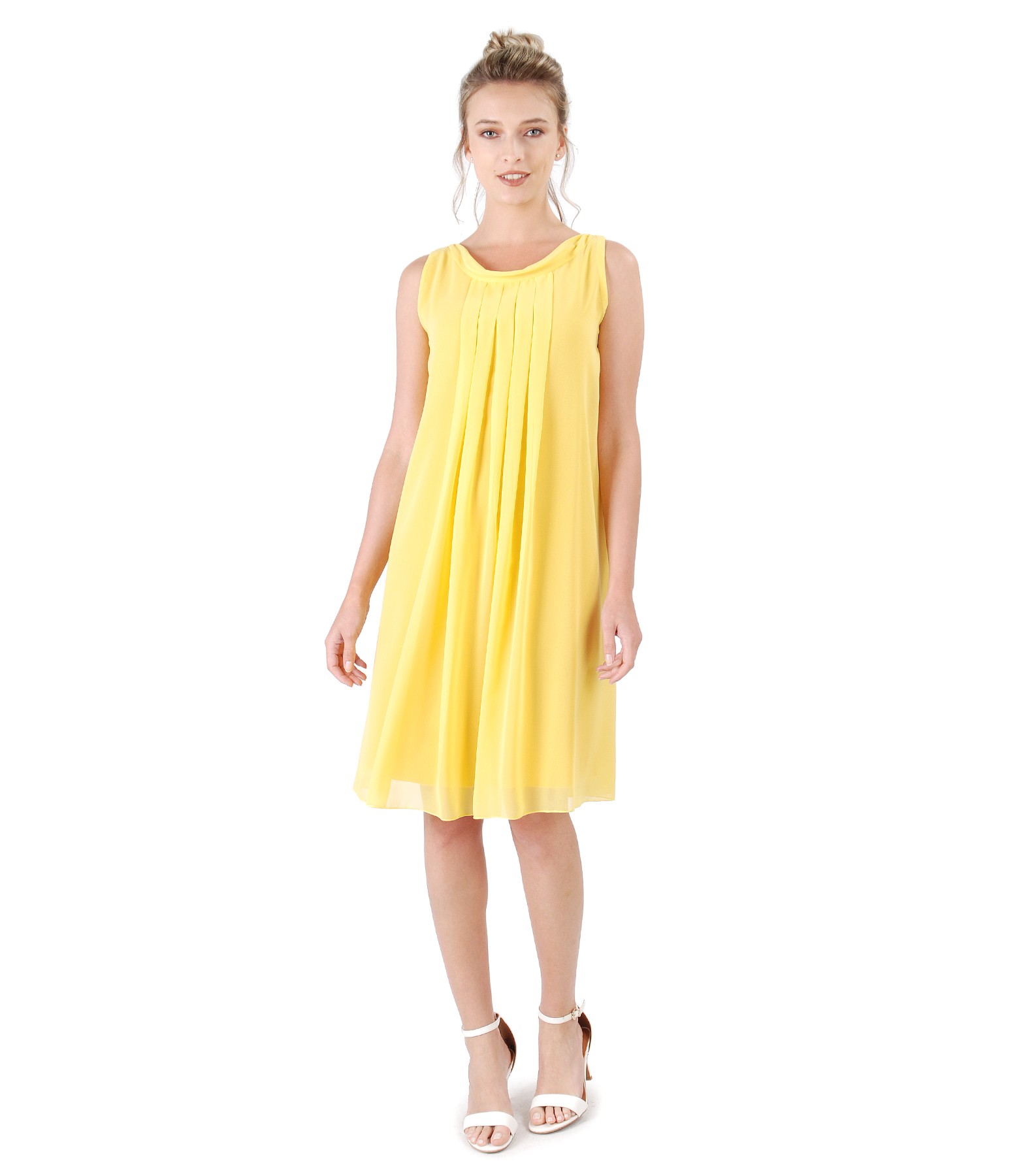 Casual veil dress, without sleeves, with front folds and trim on the low-cut neck. Has no closing system.