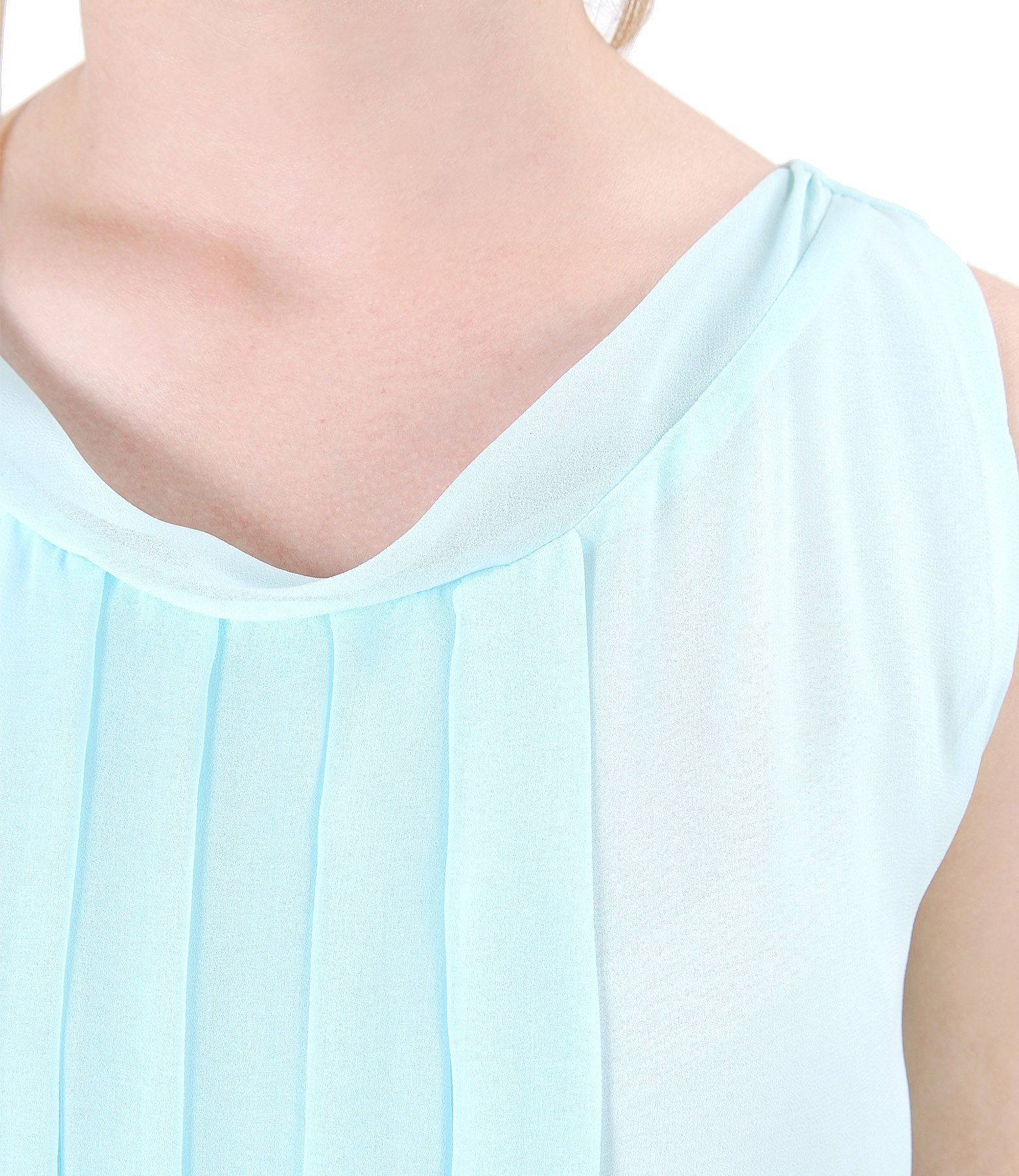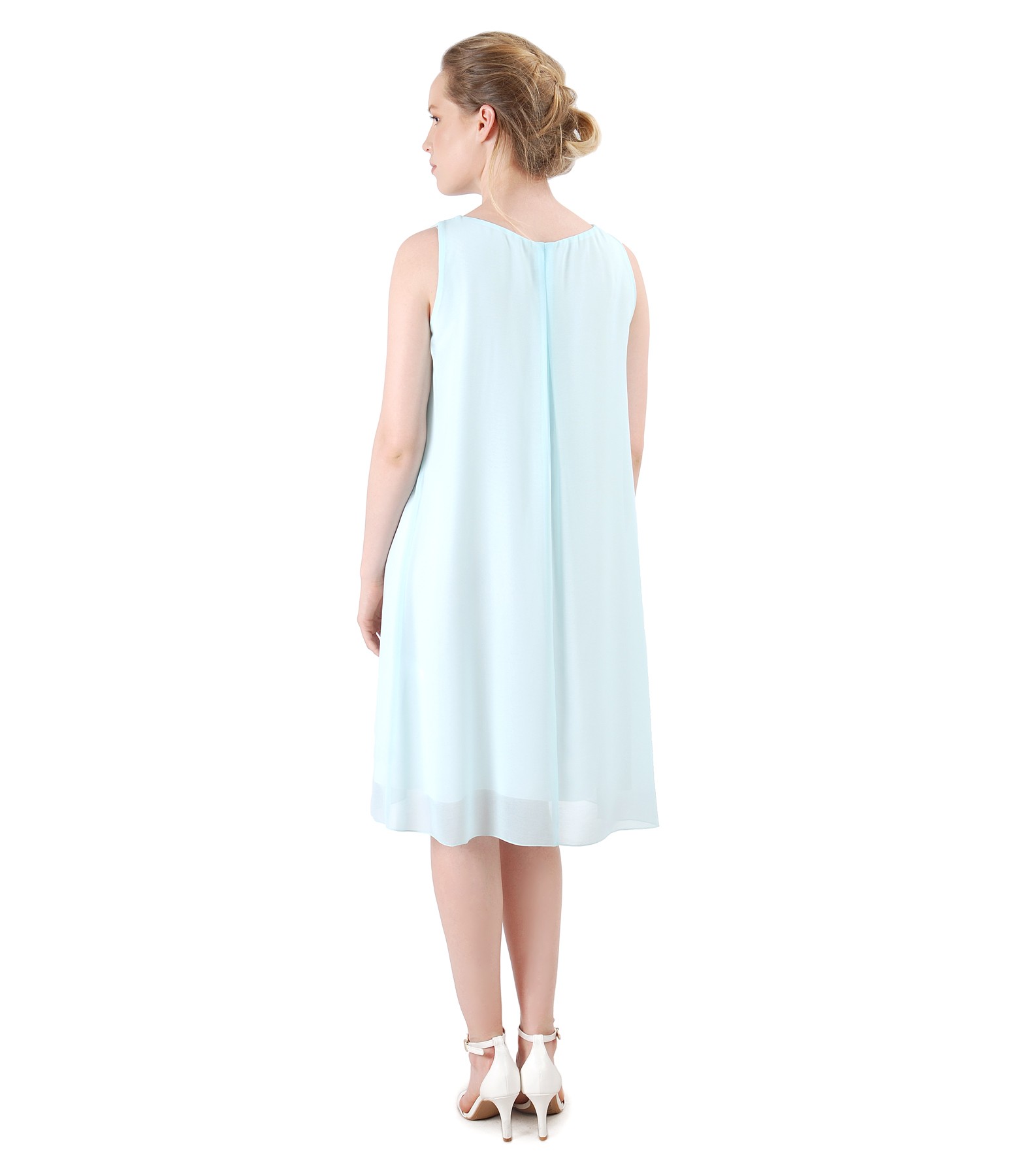 Casual veil dress, without sleeves, with front folds and trim on the low-cut neck.