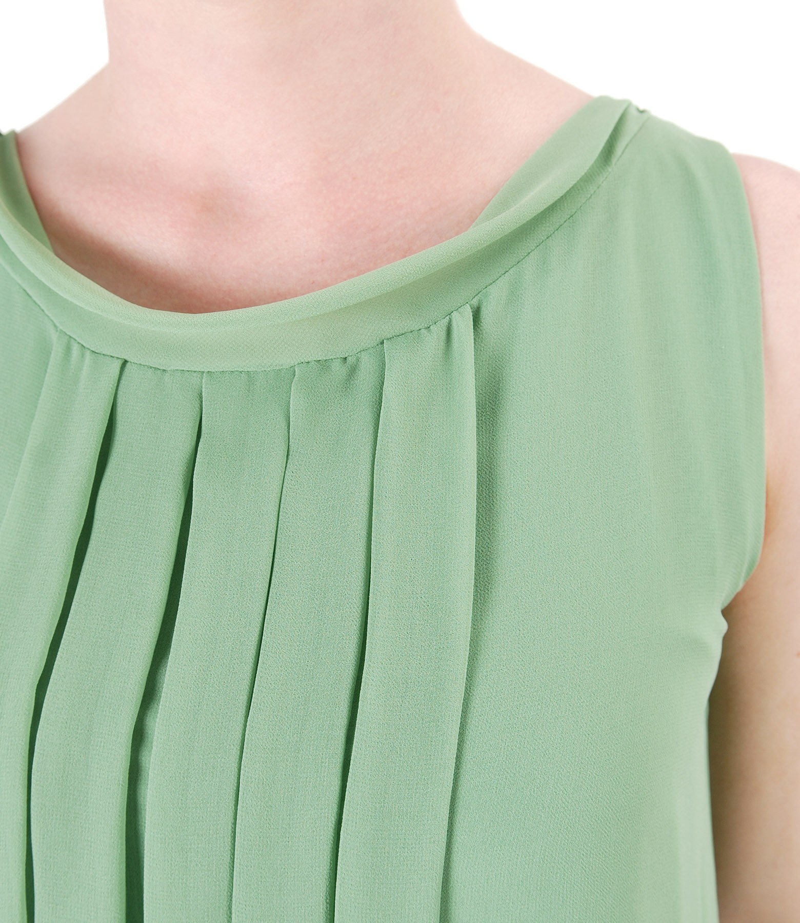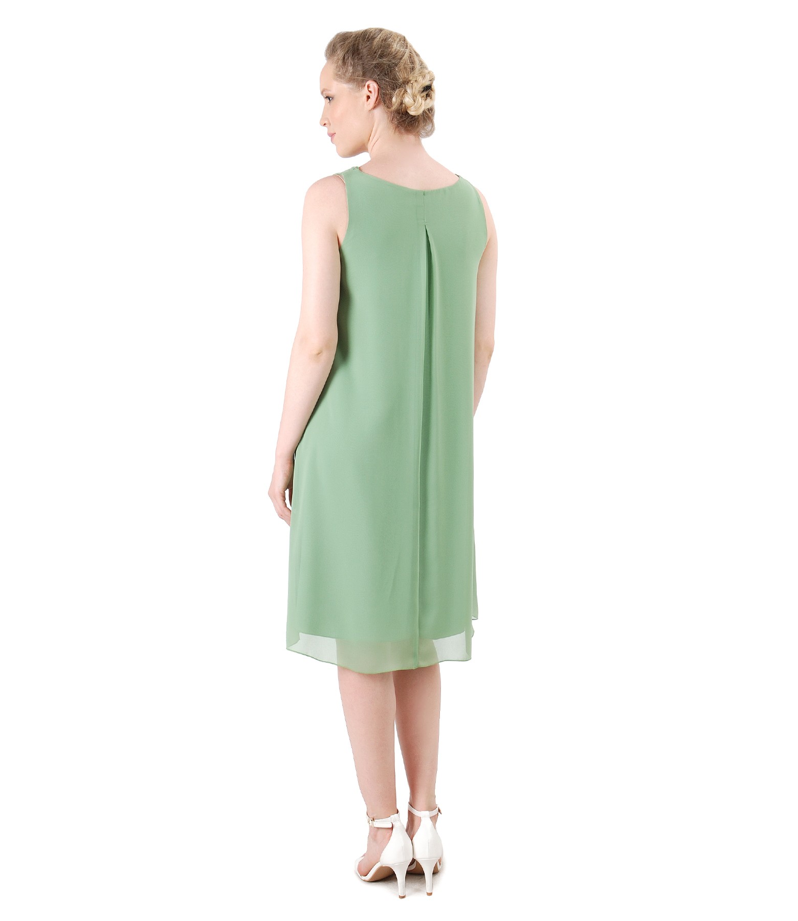 Casual veil dress, without sleeves, with front folds and trim on the low-cut neck. Has no closing system.