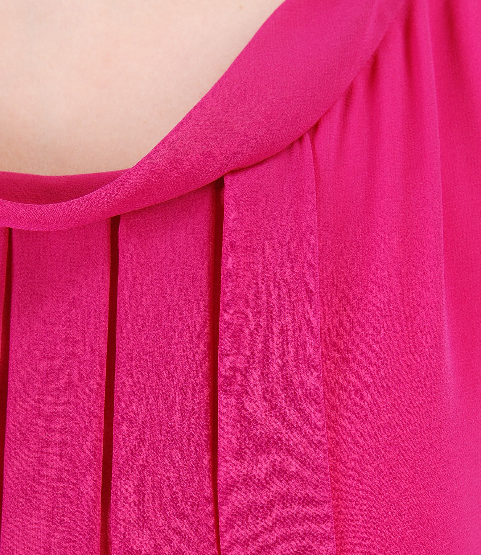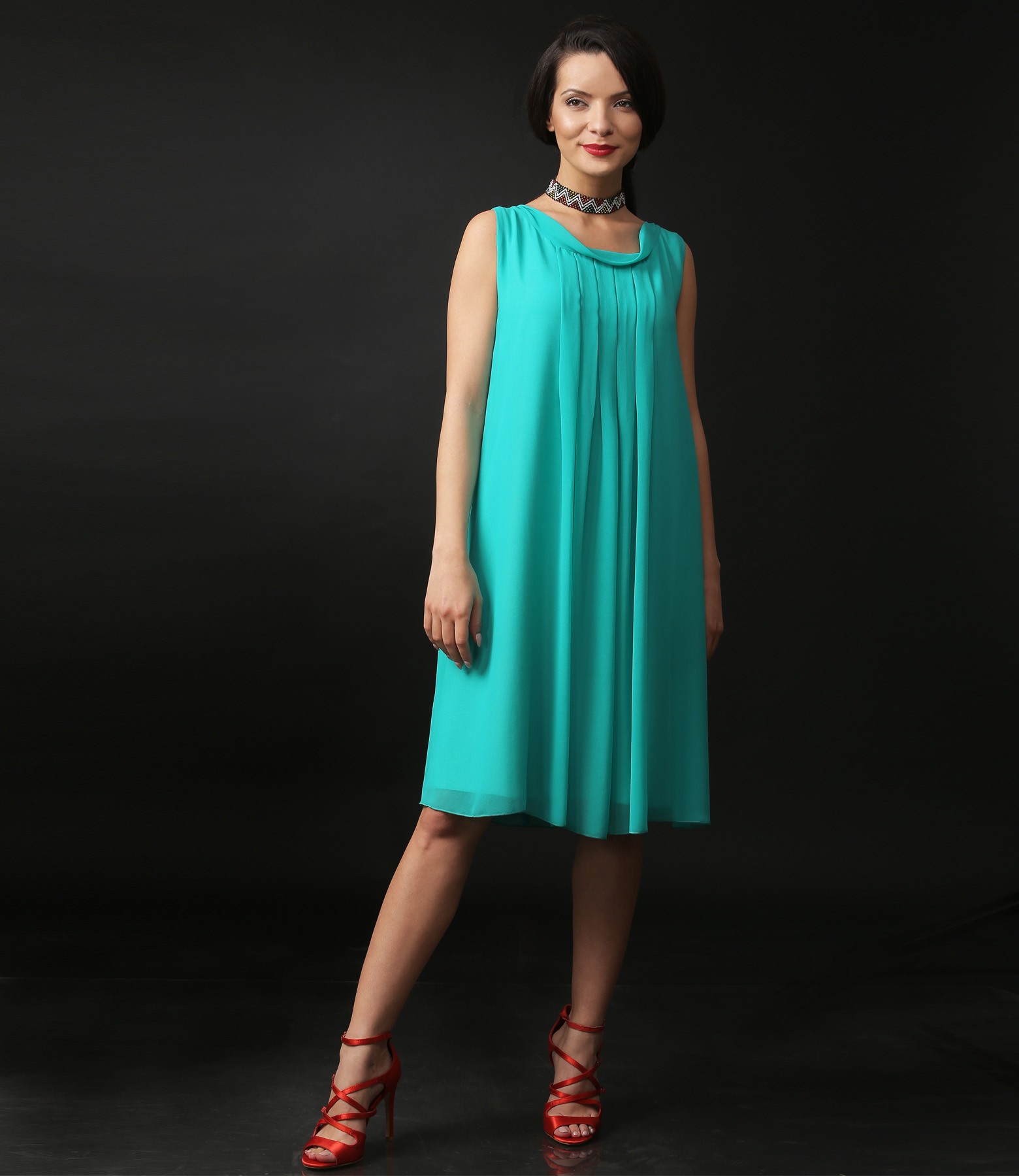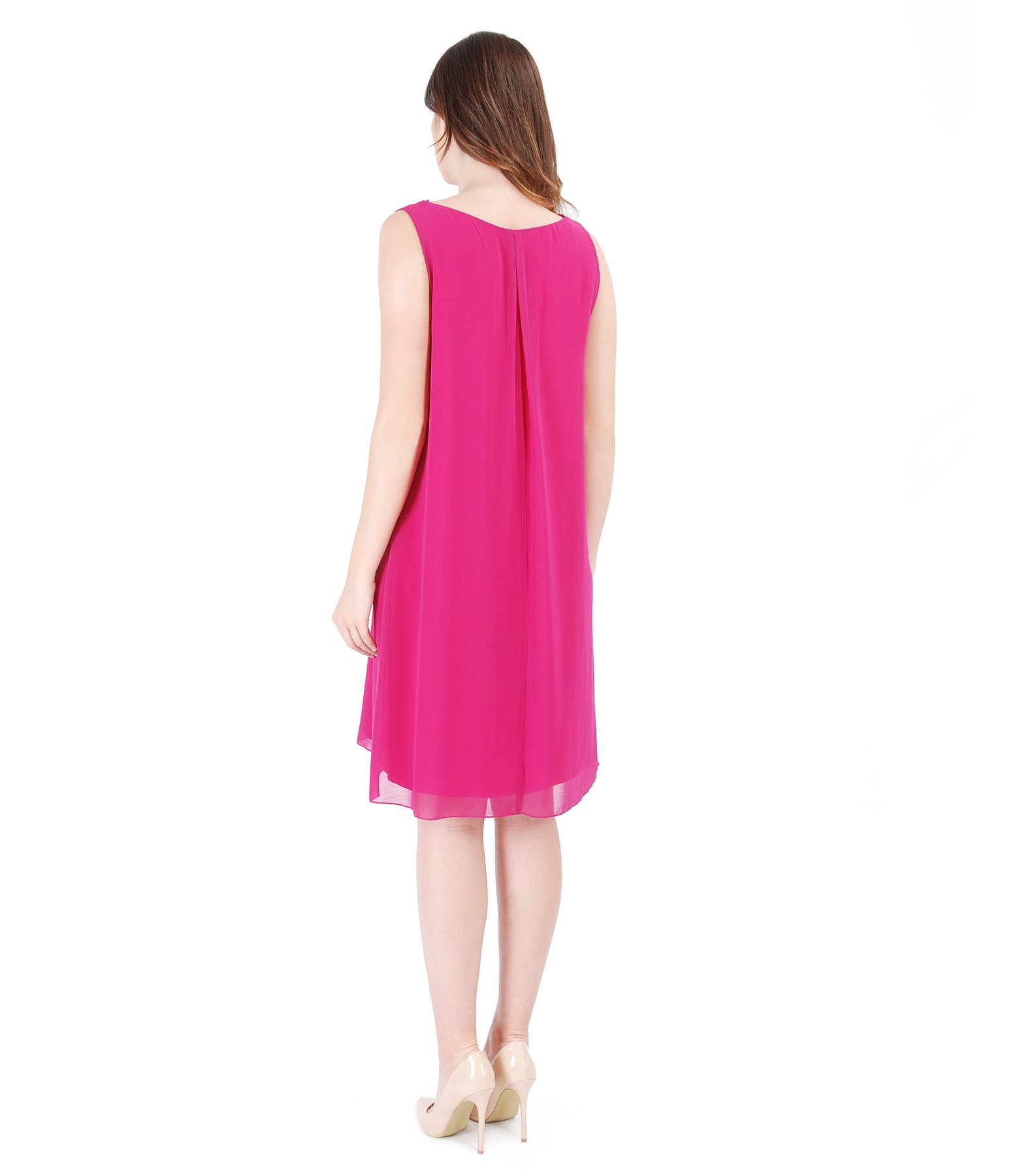 Casual veil dress, without sleeves, with front folds and trim on the low-cut neck. Have no closing system.