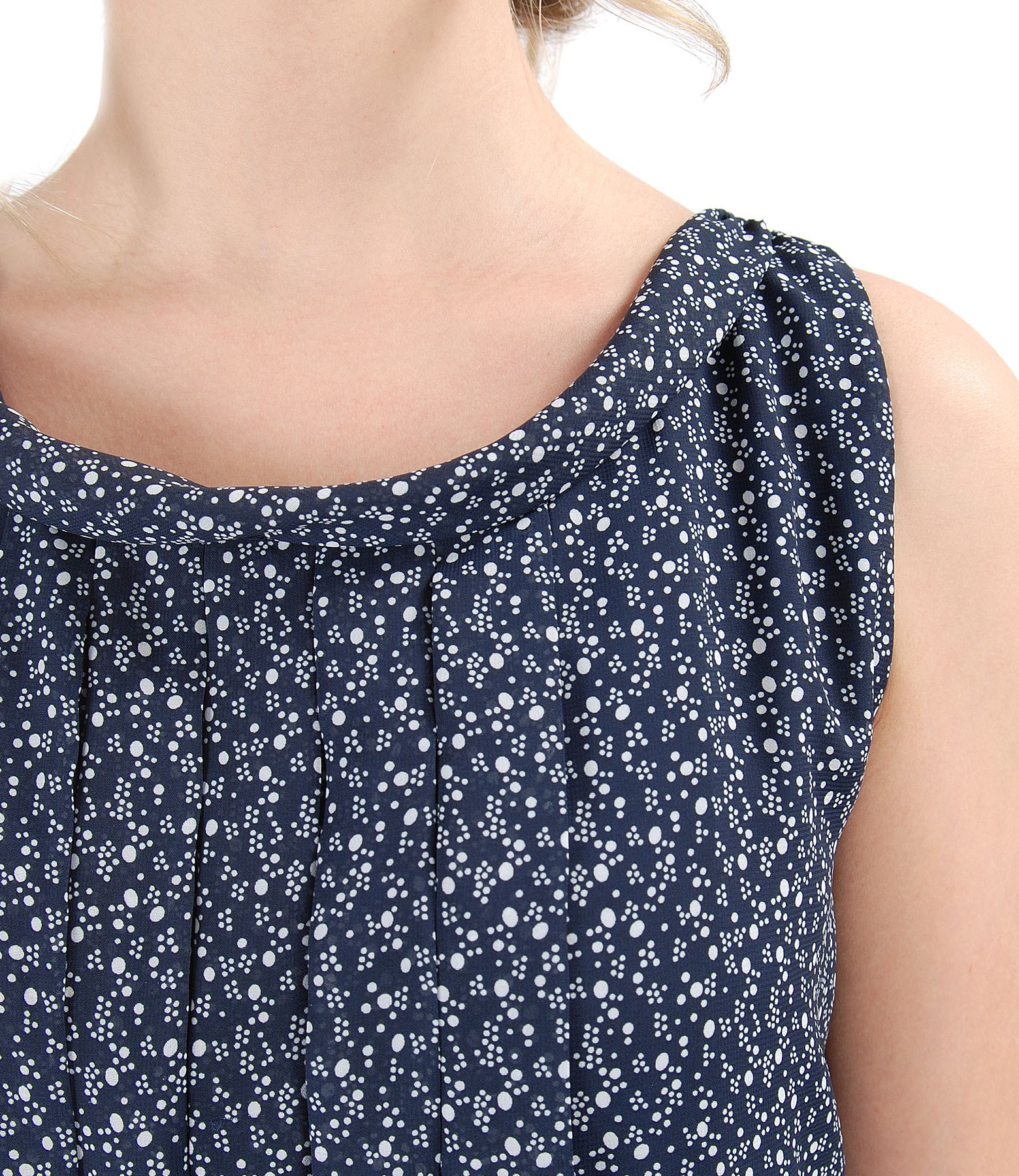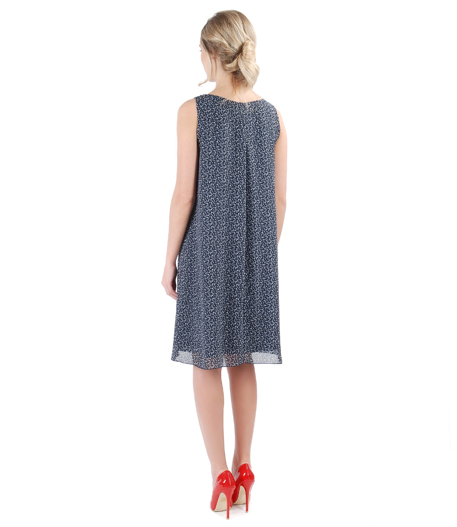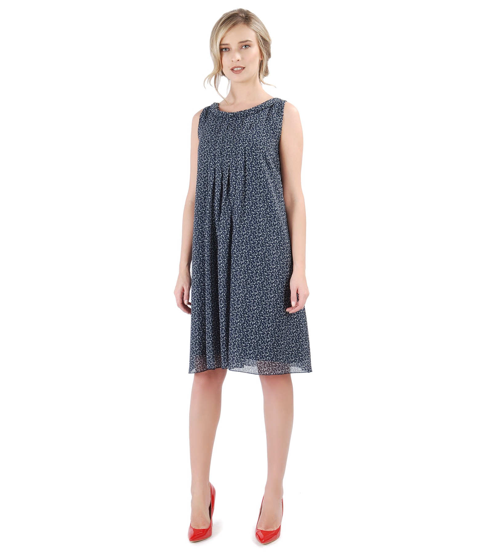 Casual dress made of printed with lace corner veil, padded with viscose, without sleeves, with front folds and trim on the low-cut neck. Have no closing system.
