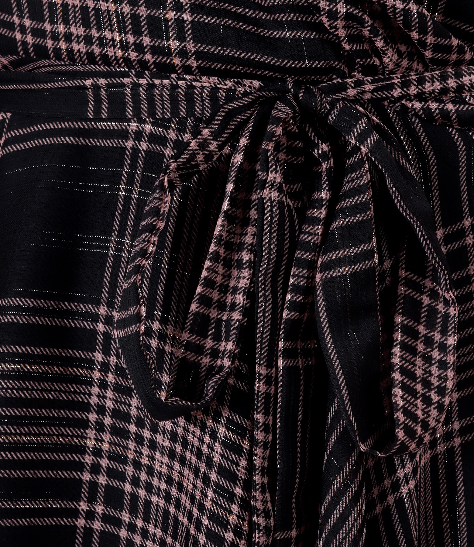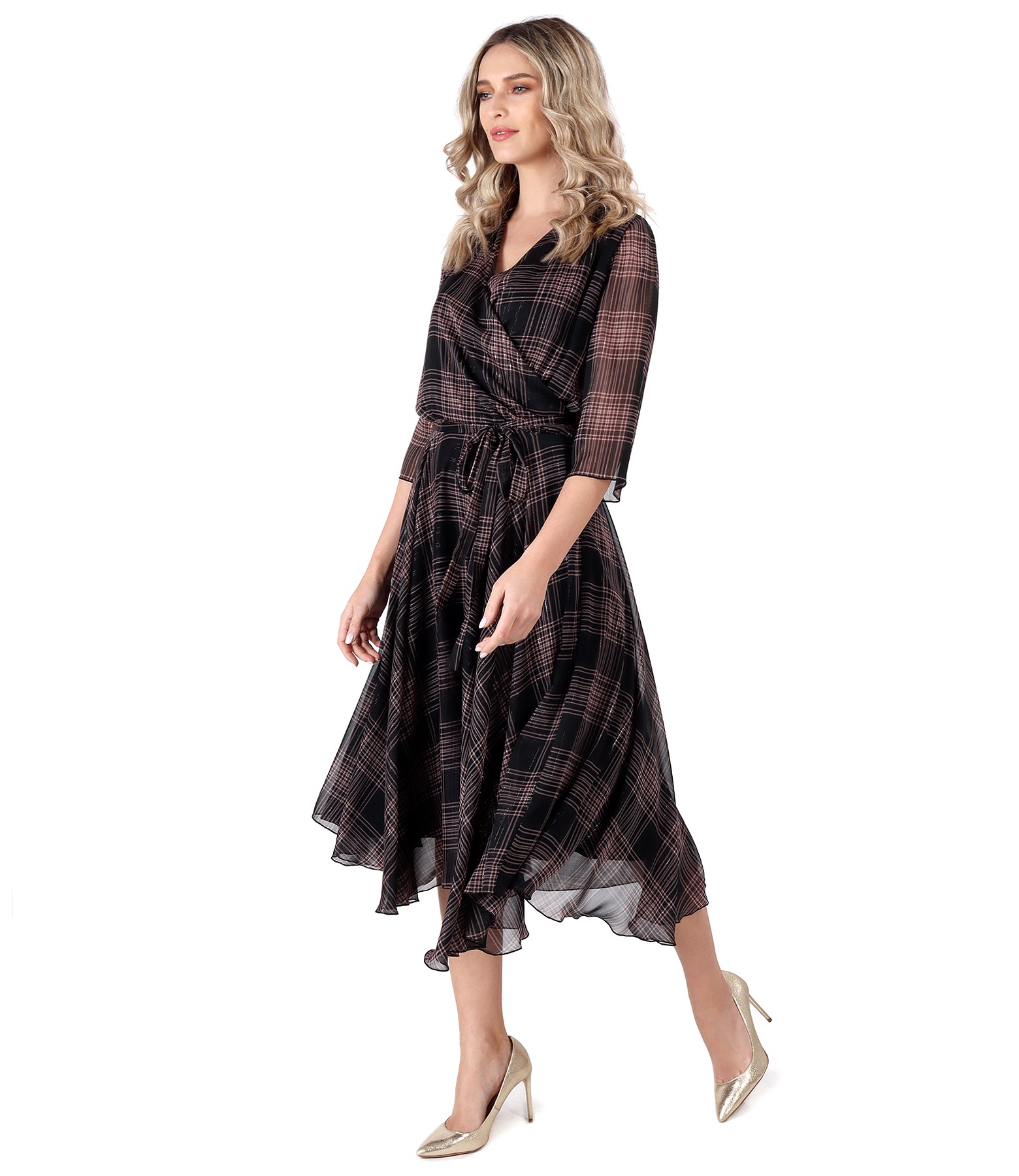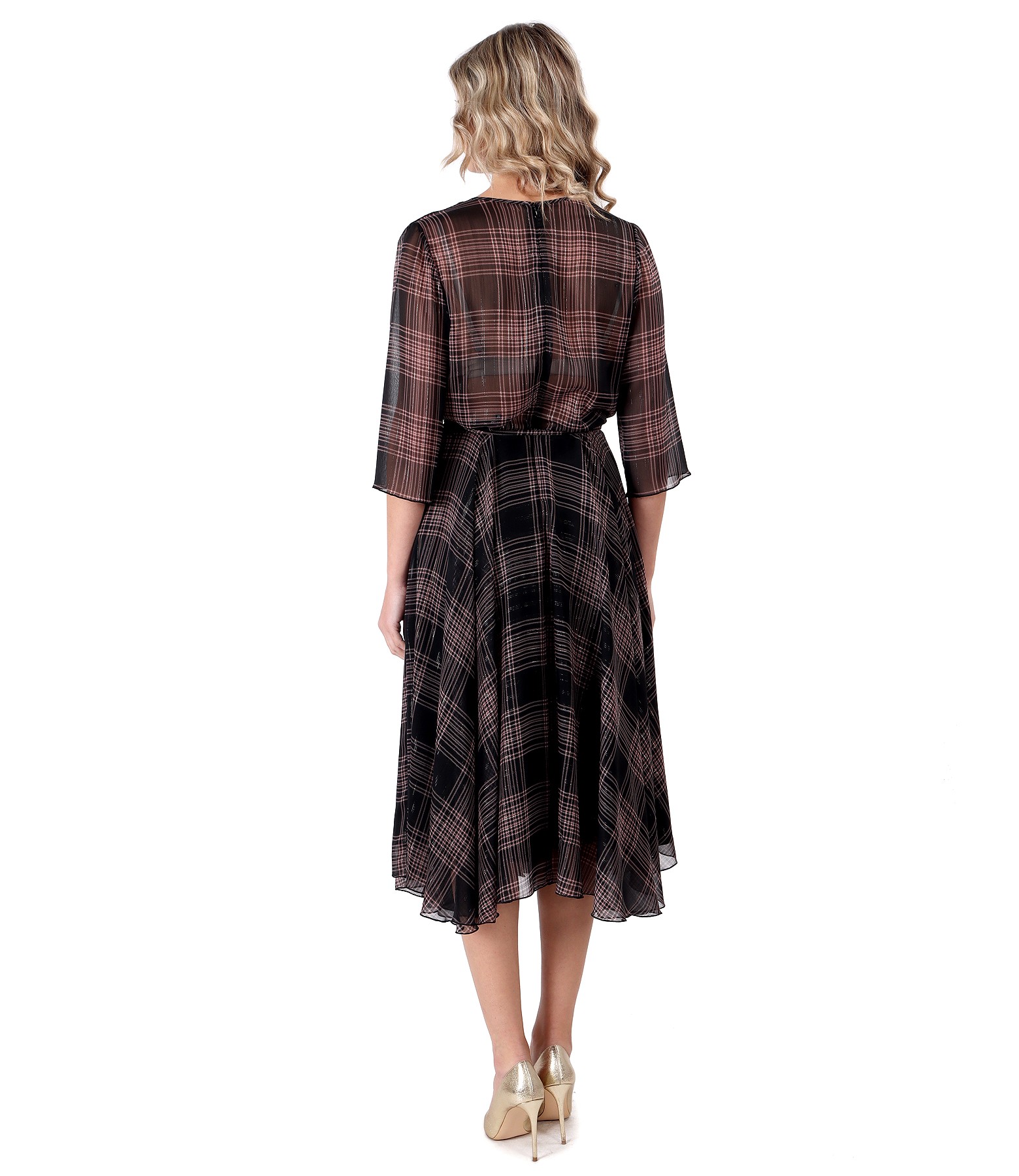 Evening veil dress with plaid and golden thread,padded with viscose,with 3/4 sleeves,chest spent and waist cord. It closes with a hidden zipper on the middle back.