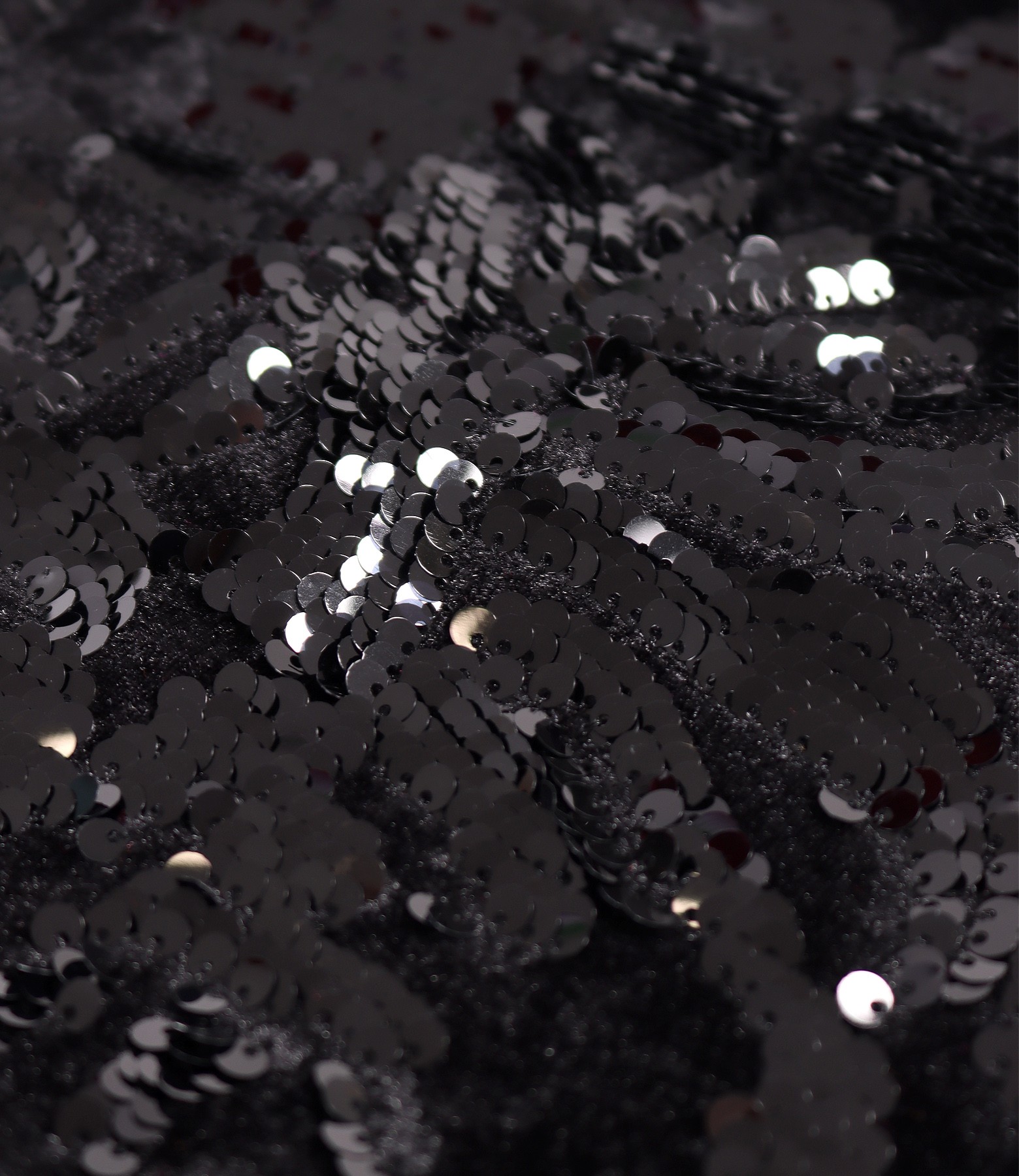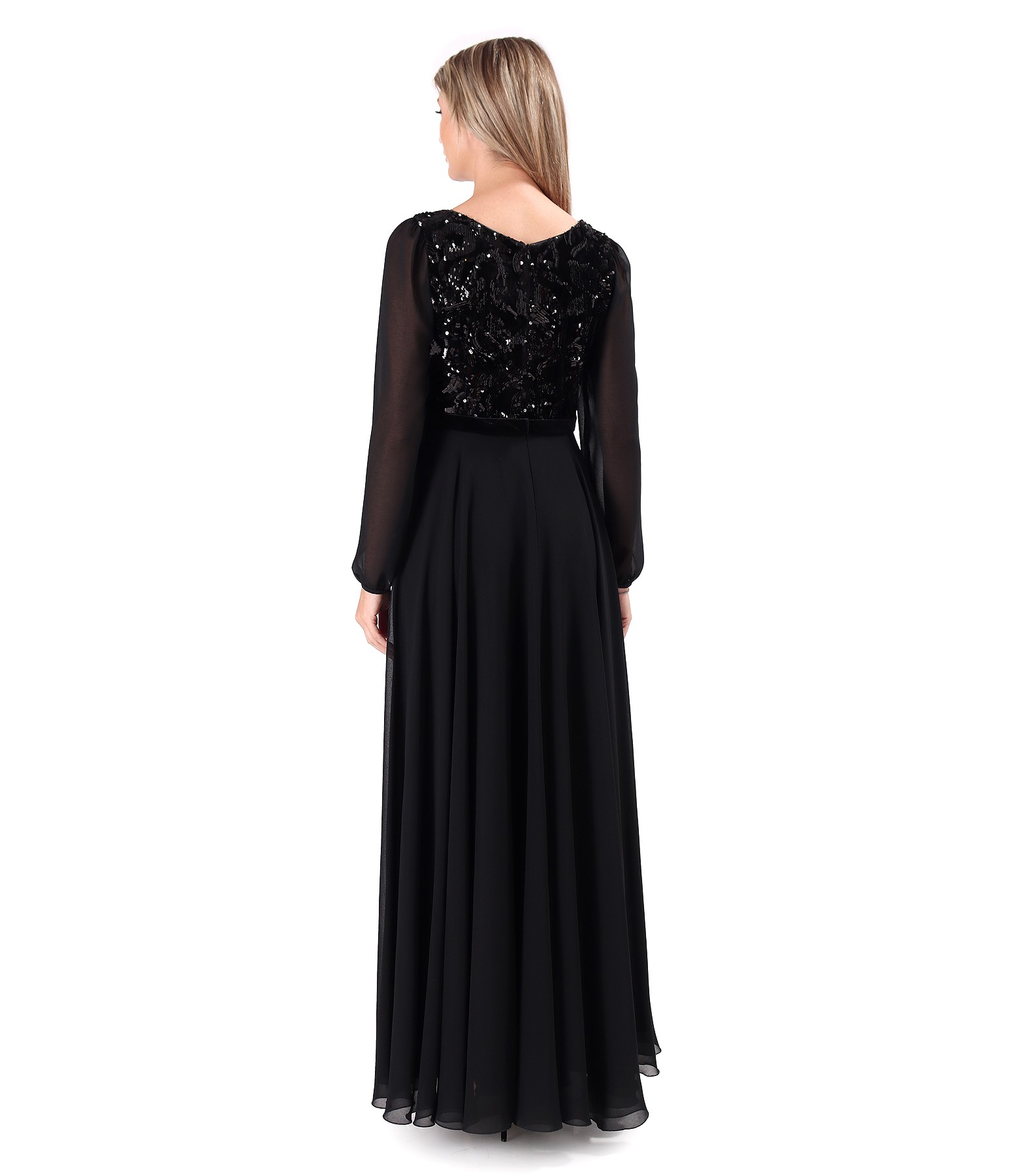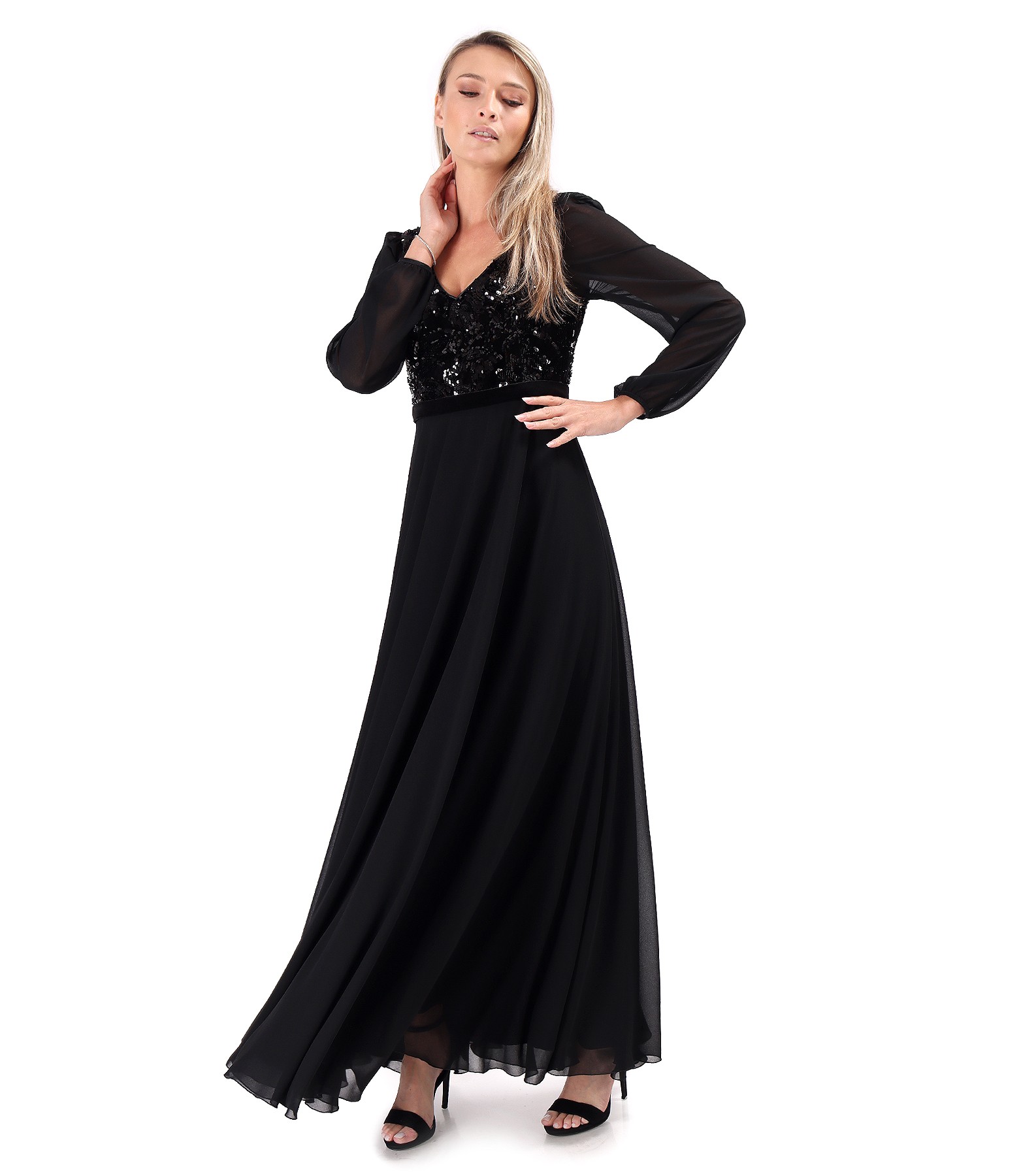 Veil dress with sequins corsage, padded, with long sleeves and V low-cut neck. Closes with hidden zipper on the middle back.