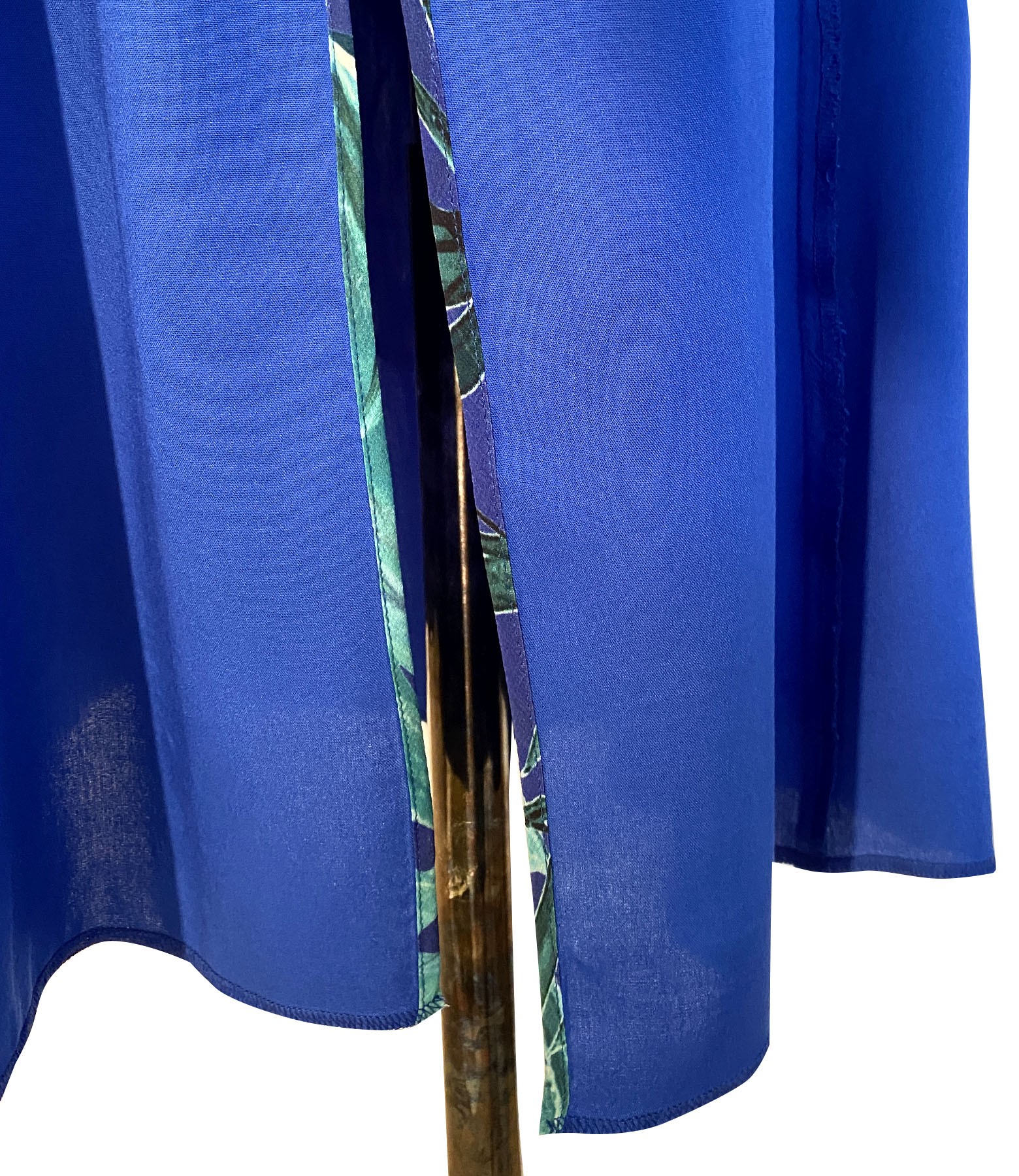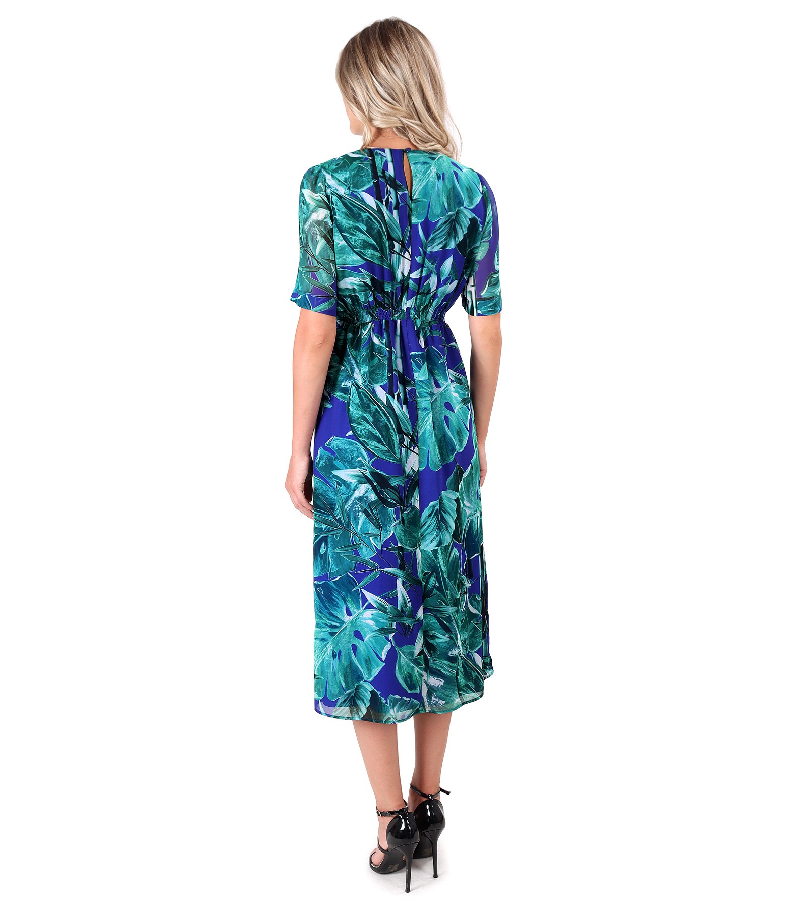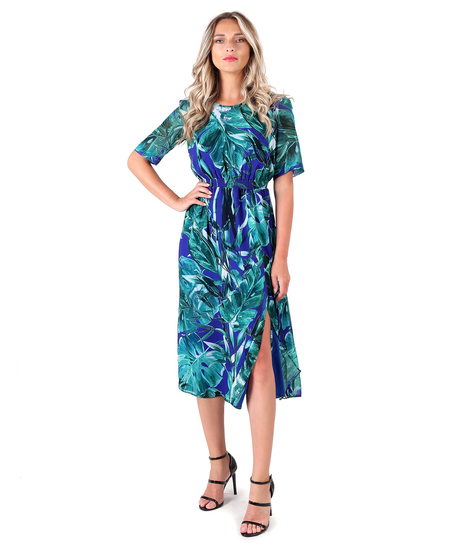 Printed veil dress with floral motifs, doubled with viscose, with short sleeves, elastic round neckline at the waist and slit on the front.