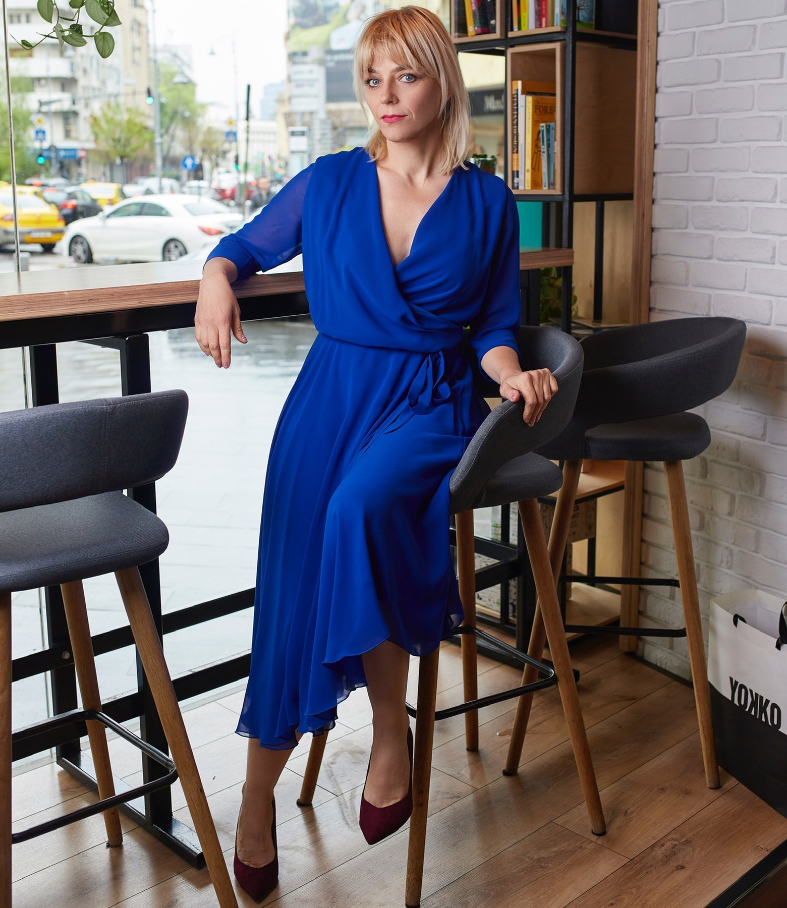 Satin veil evening dress, padded with viscose, with 3/4 sleeves and waist belt. Closes with hidden zipper on the middle back.