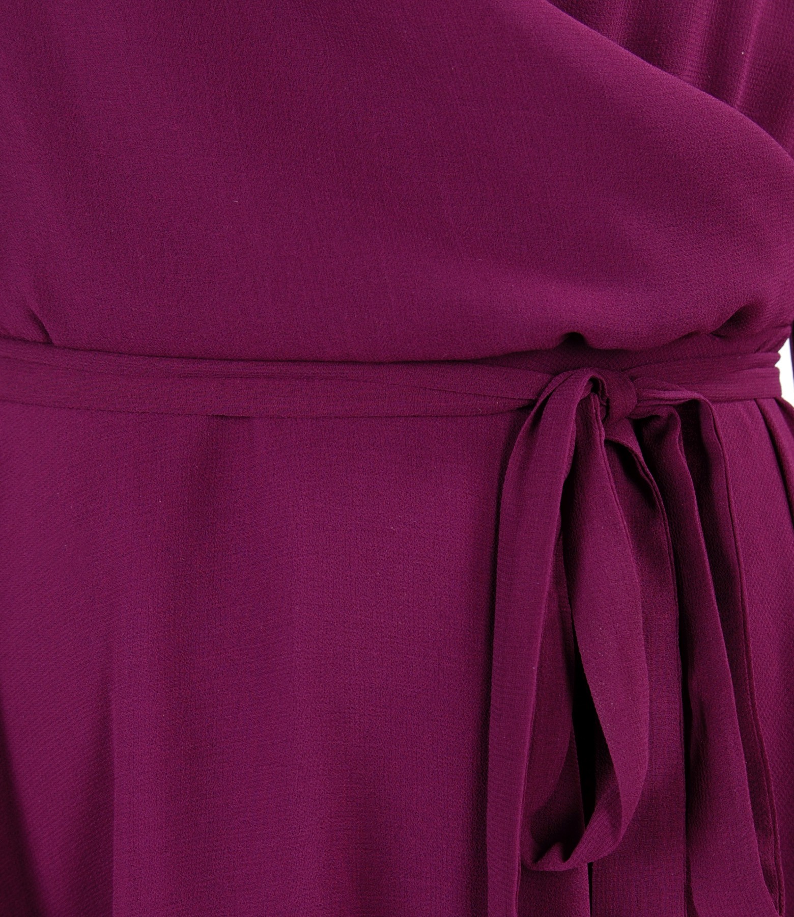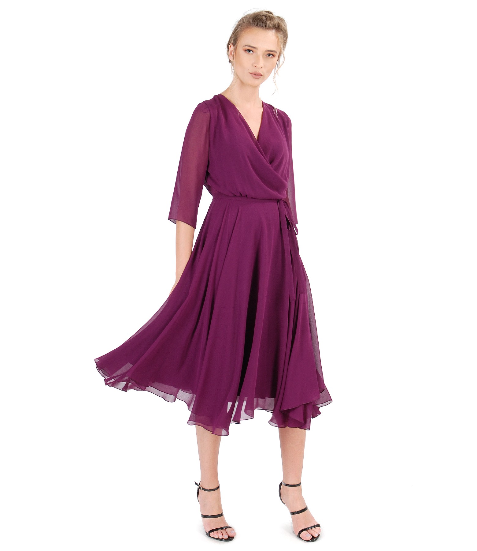 Satin veil evening dress, padded with viscose, with 3/4 sleeves and waist belt. Closes with hidden zipper on the middle back.