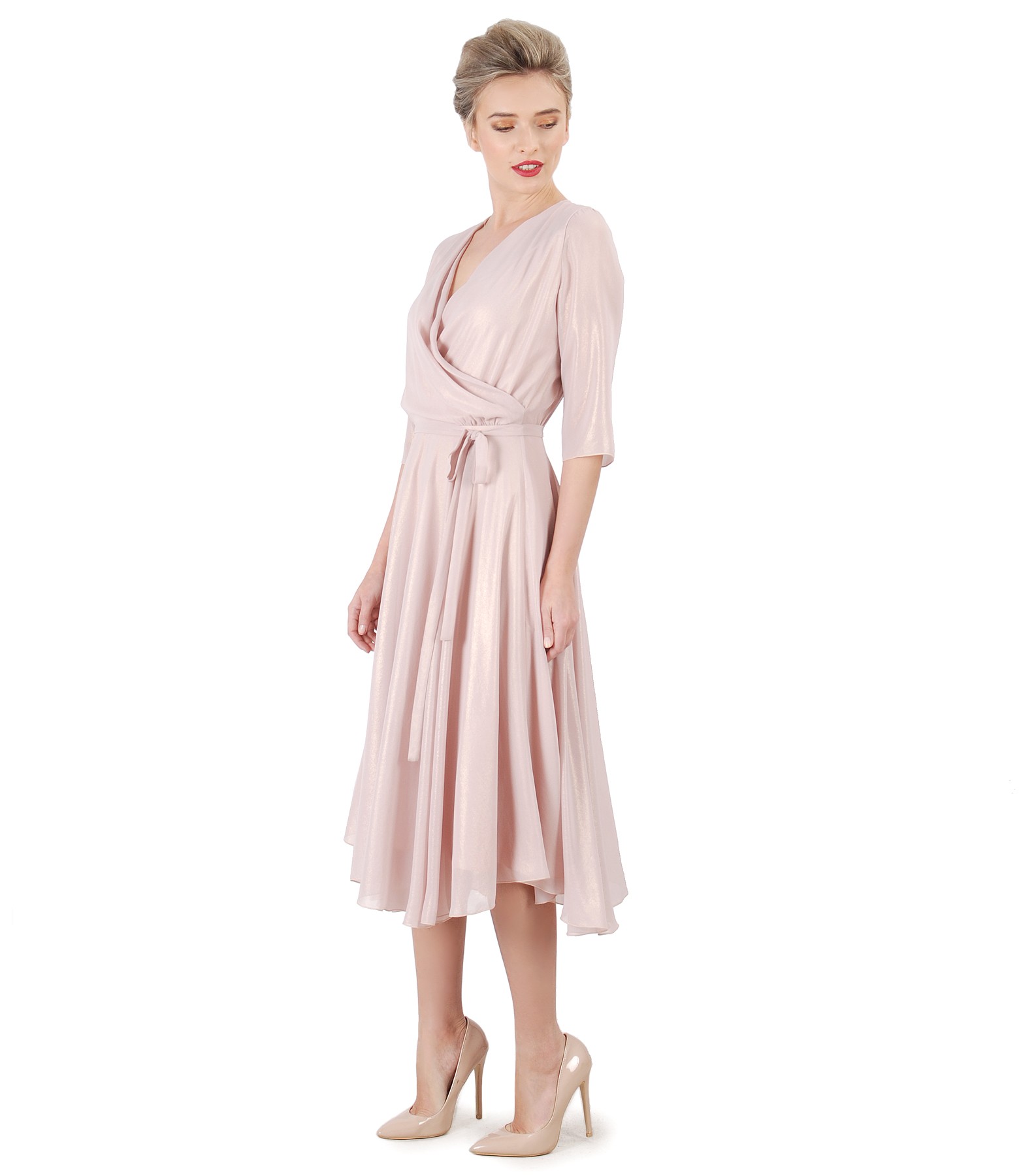 Satin veil evening dress, padded with viscose, with 3/4 sleeves and waist belt. Closes with hidden zipper on the middle back.