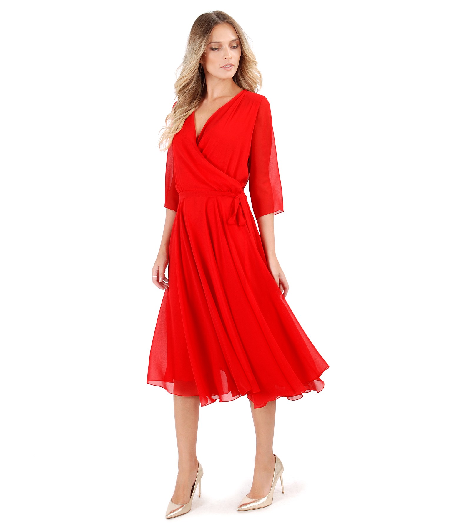 Satin veil evening dress, padded with viscose, with 3/4 sleeves and waist belt. Closes with hidden zipper on the middle back.