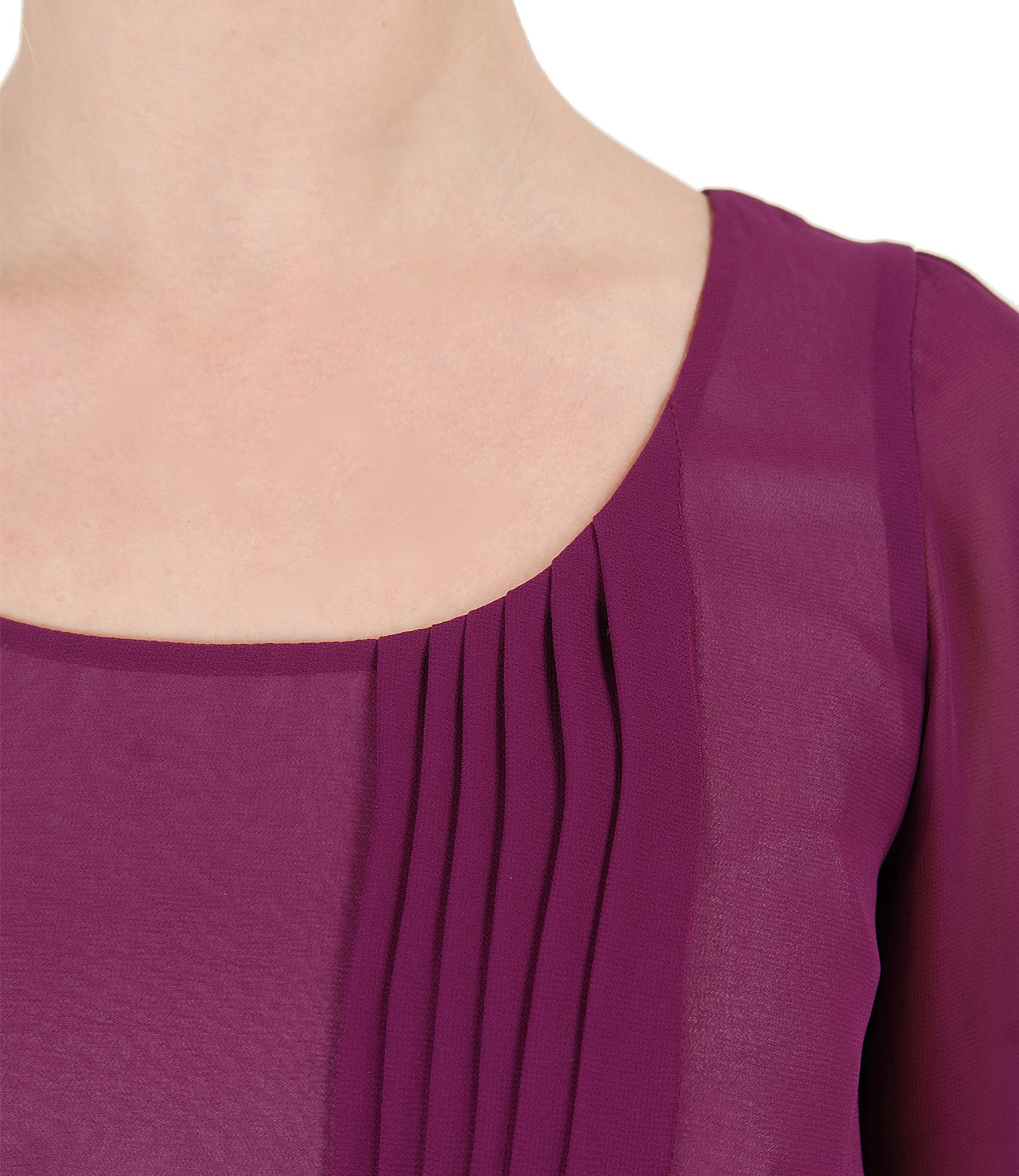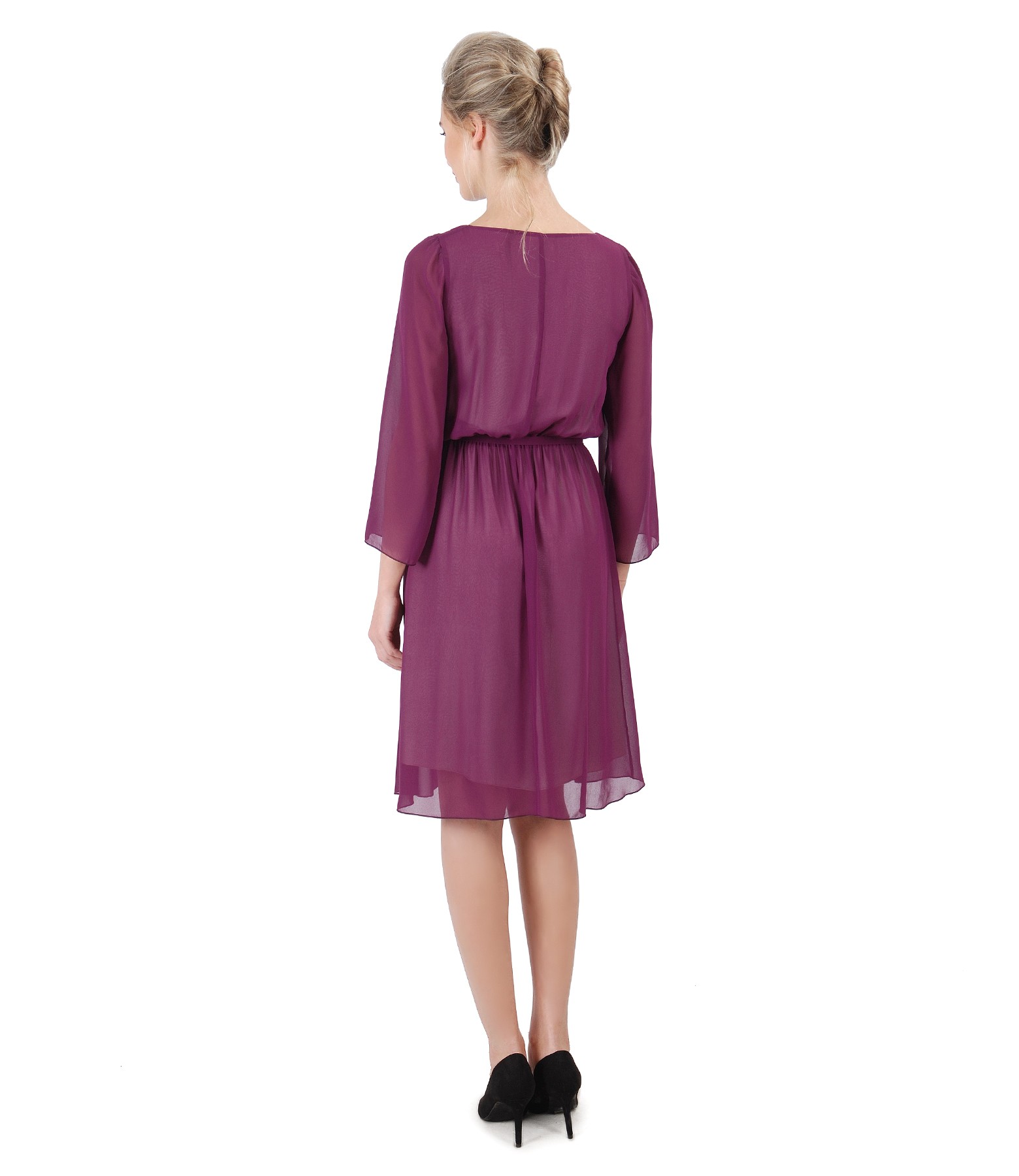 Evening dress, padded with viscose, 3/4 sleeves, with front folds and waist belt embellished with crystals. Have no closing system.