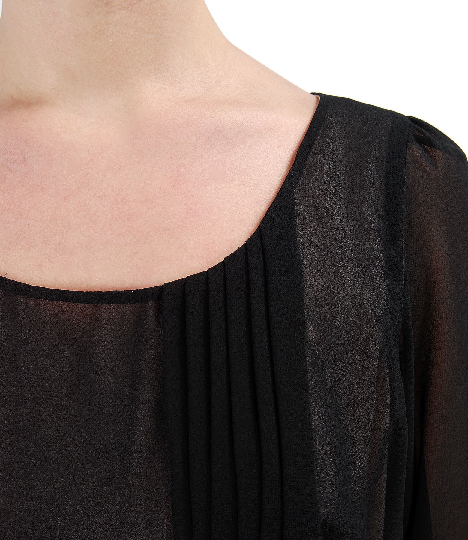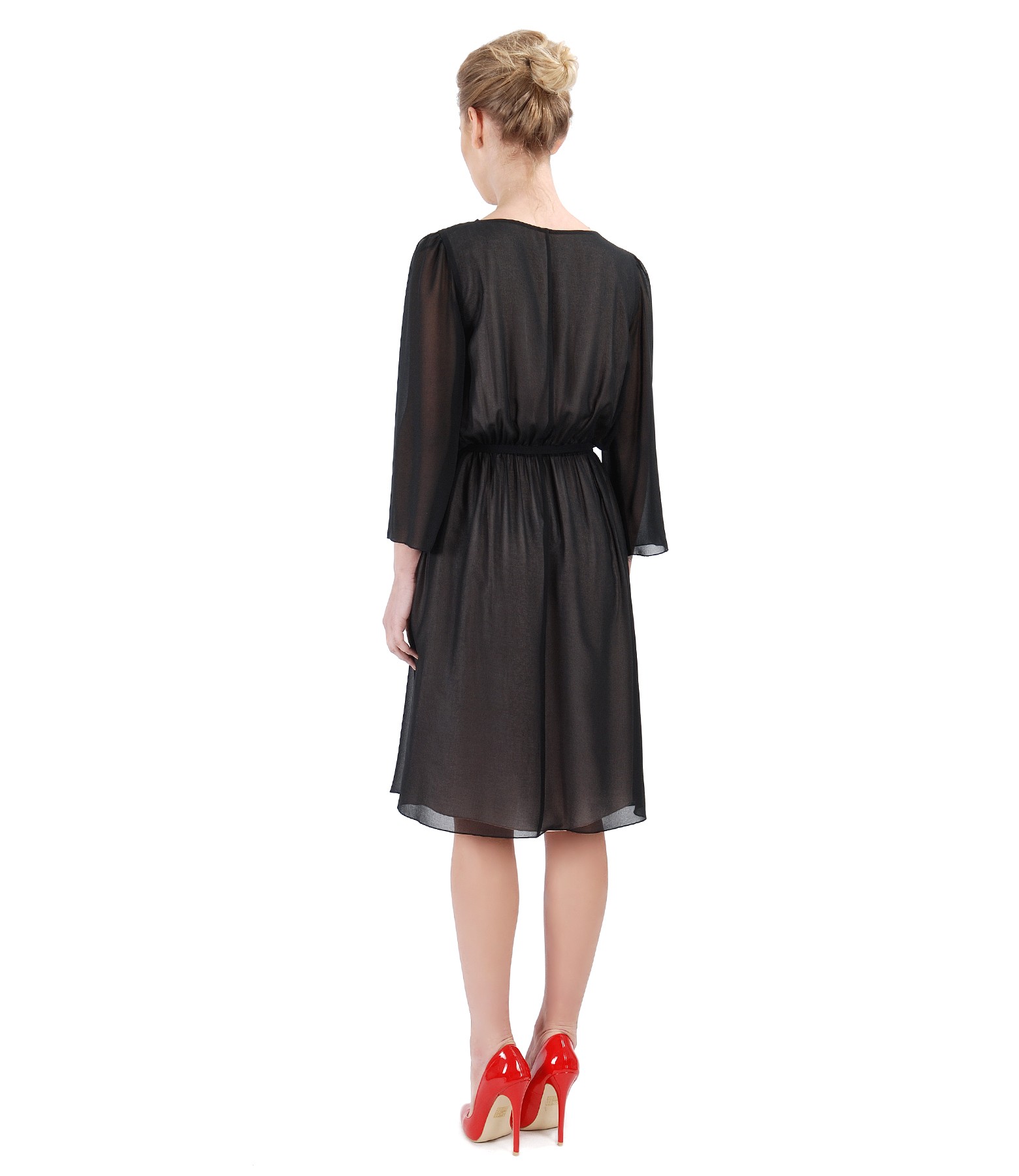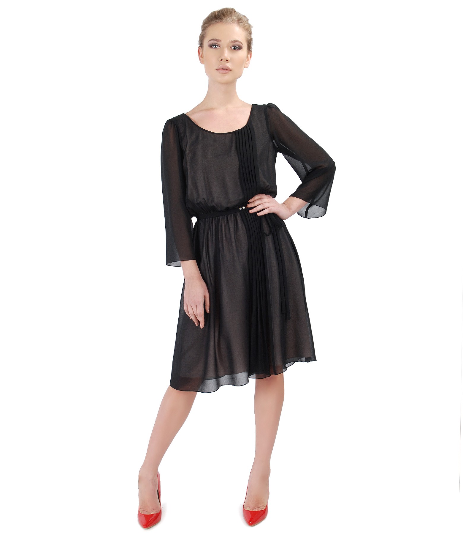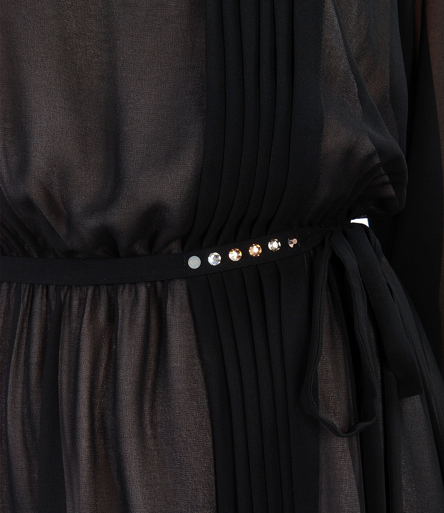 Evening dress, padded with viscose, 3/4 sleeves, with front folds and waist belt embellished with crystals. Have no closing system.