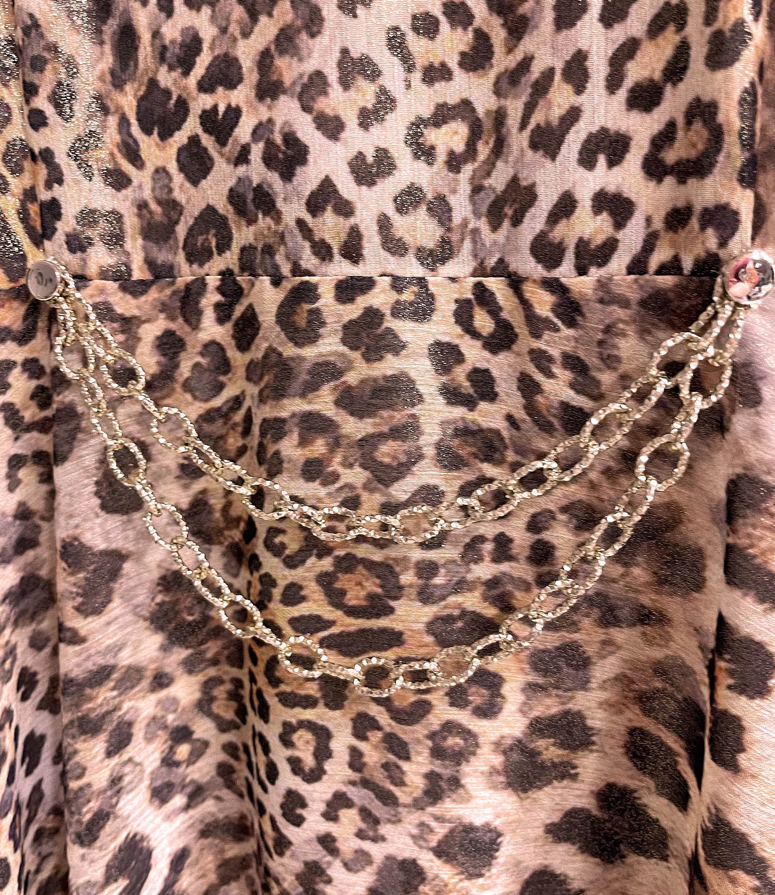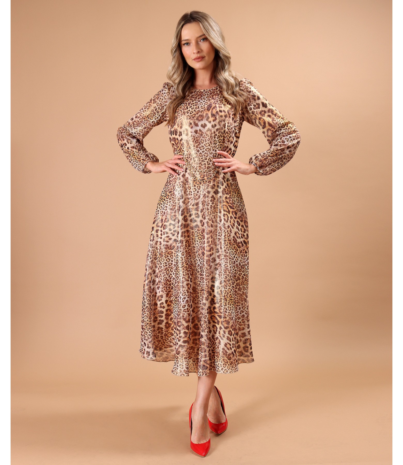 Midi dress in animal print veil with lurex thread, lined with viscose, with long, loose sleeves with gathered ends, round neckline, and decorative gold chain at the waist. It closes with a hidden zipper at the center back.