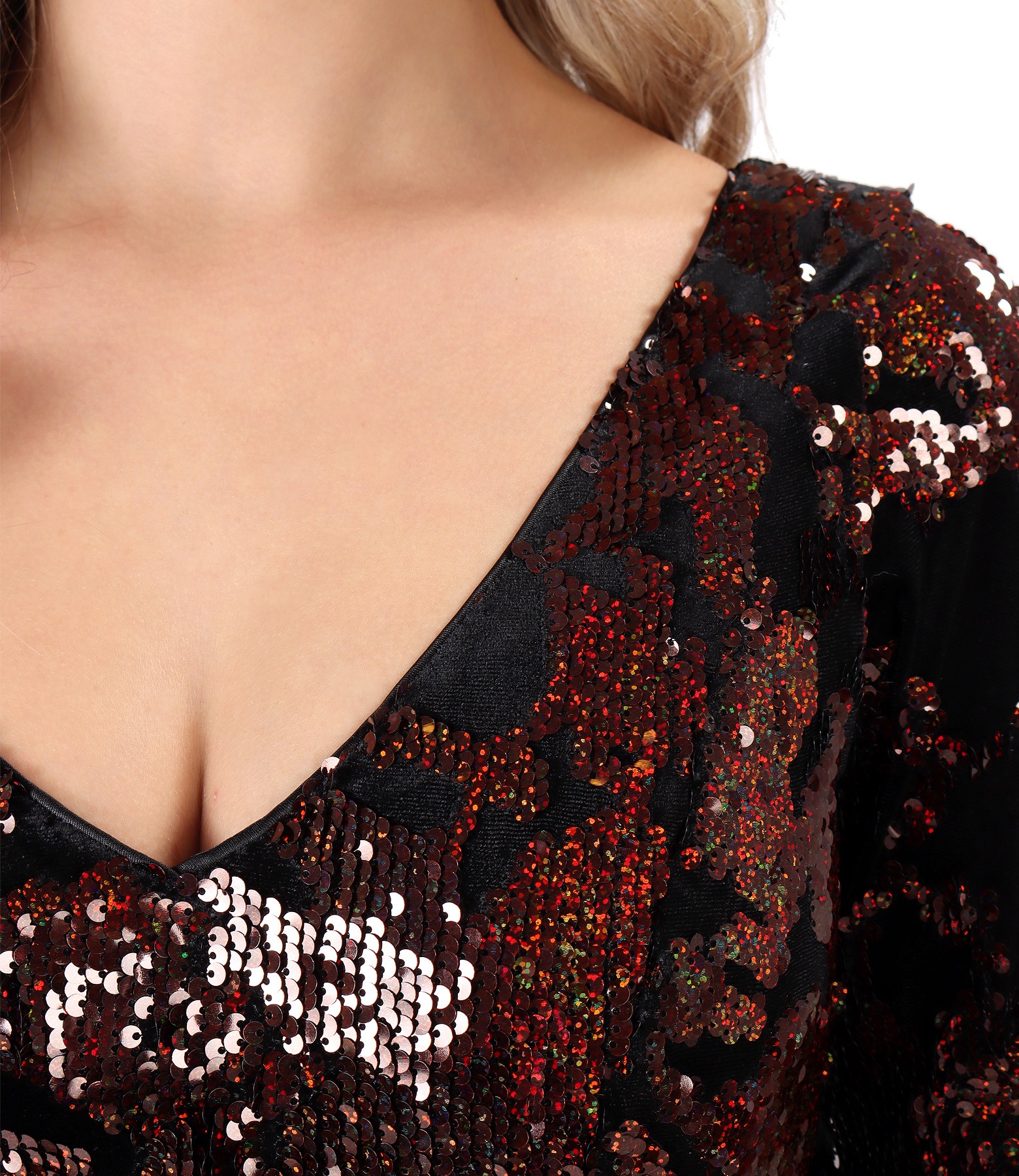 Evening dress, padded with satin, with reversible sequins and V low-cut neck, long sleeves with wristbands and front slits. Closes with hidden zipper on the middlle back.