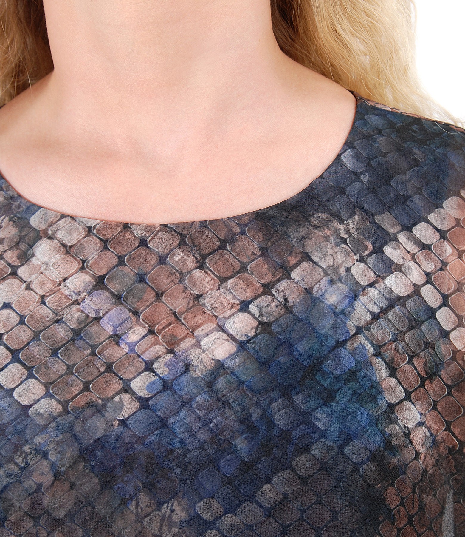 Elegant dress made of elastic velvet, with geometric print, unlined, with printed veil cape. Closes with a® button on the middle back.