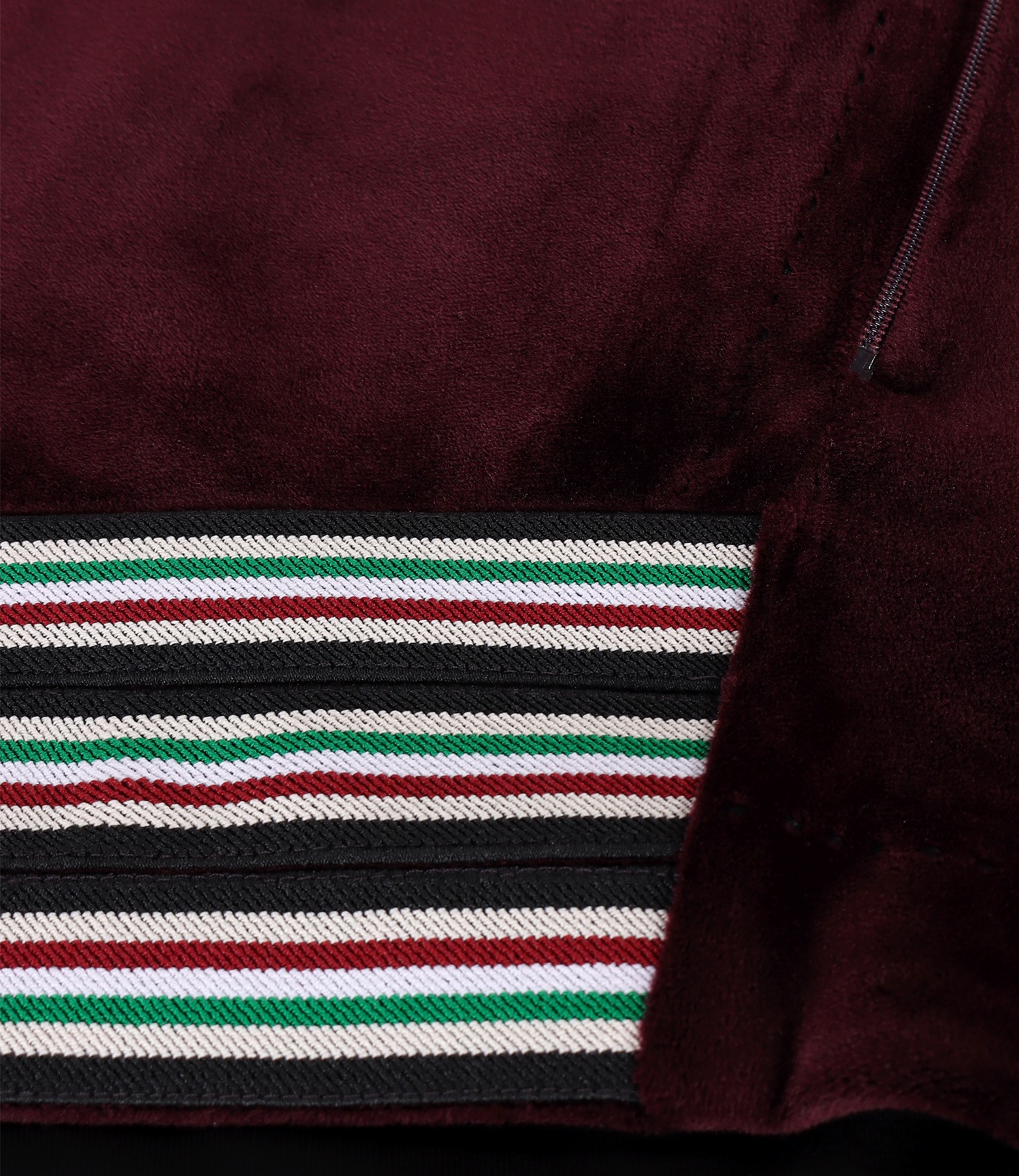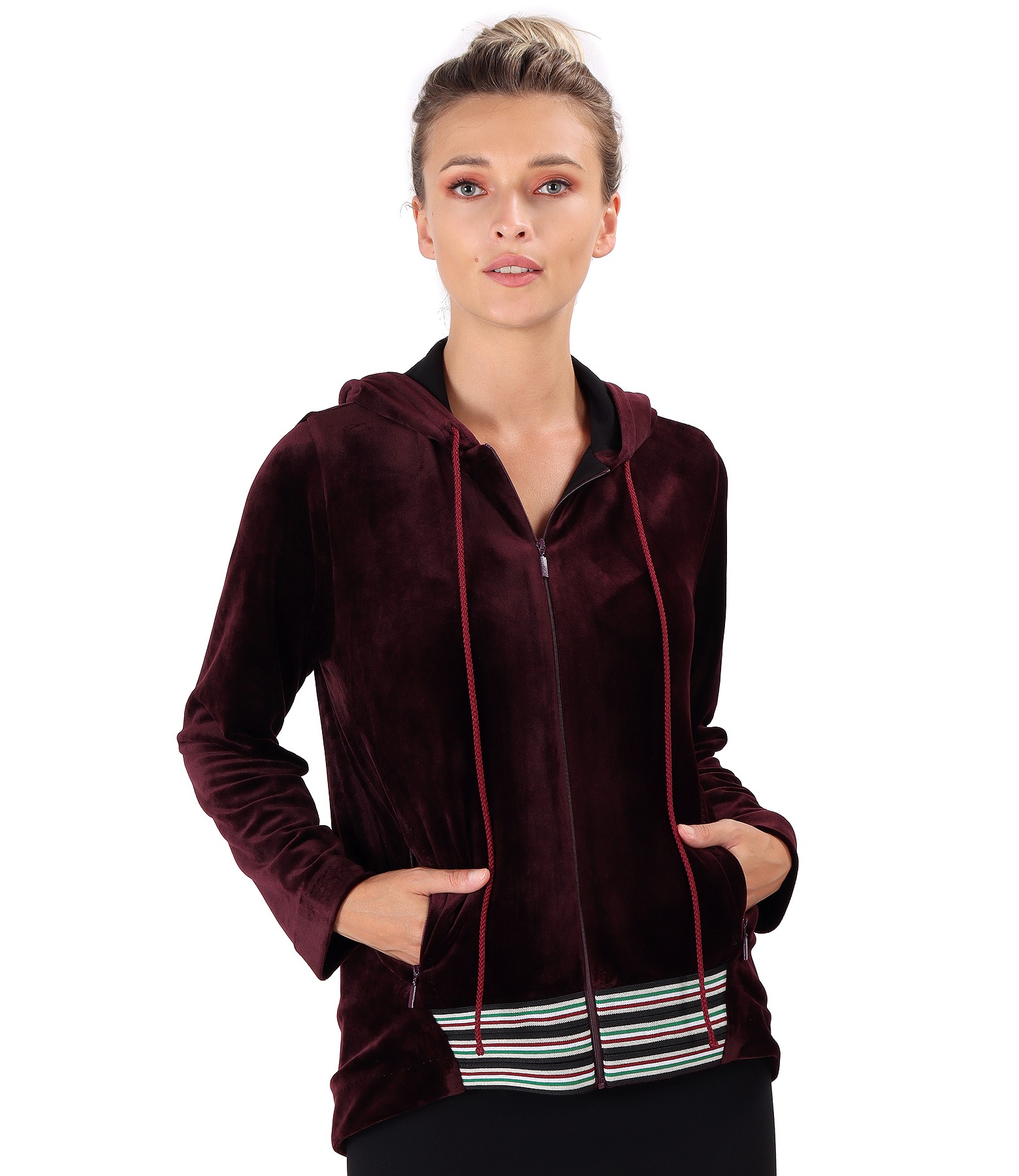 Elastic velvet hoodie, lined with elastic jersey, longer back, with lace hood, with multicolored elastic end trim and zippered side pockets. Closes with a zipper in the middle of the front.