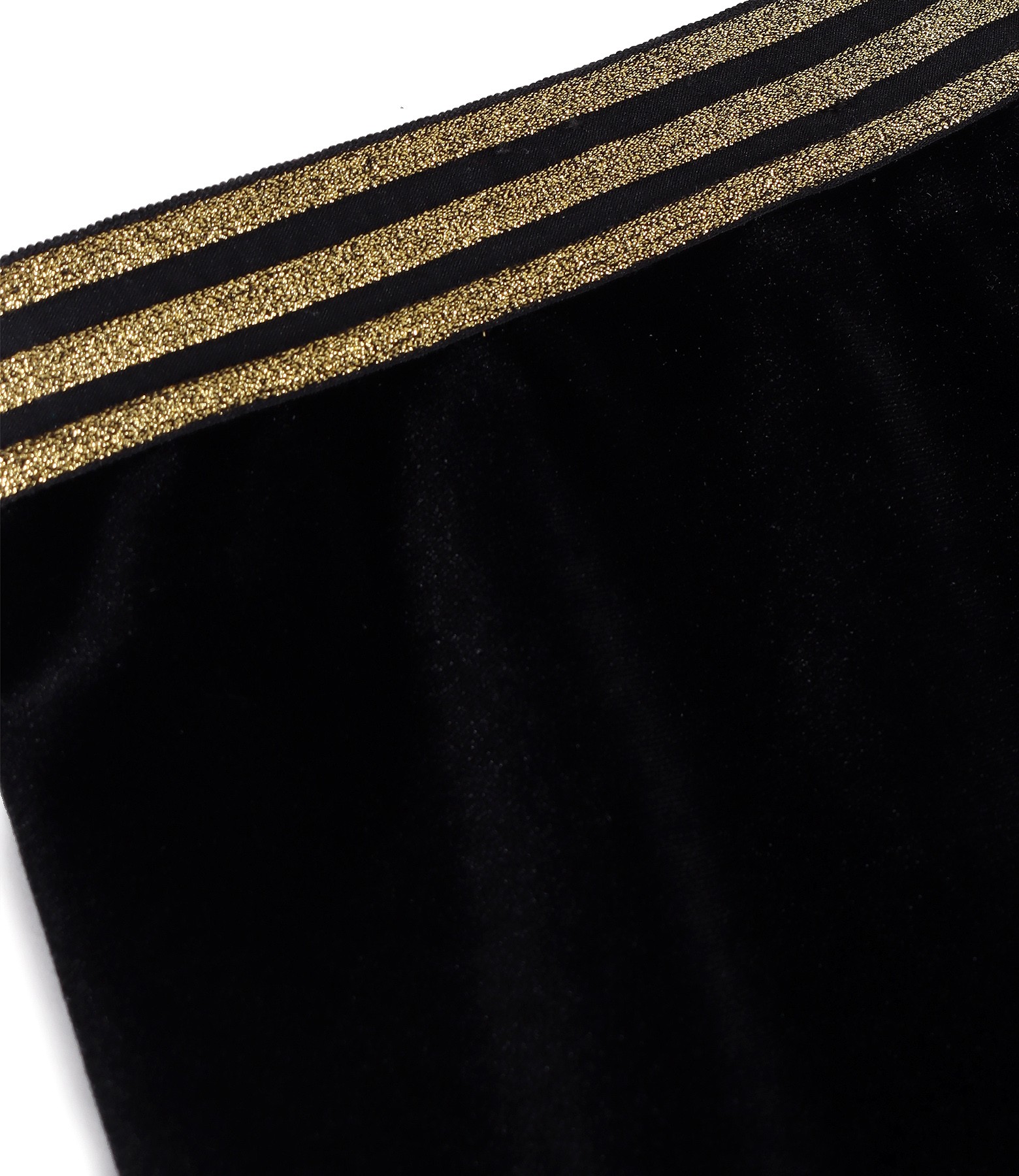 Black elastic velvet tapered skirt, padded, with gold elastic at the waist.