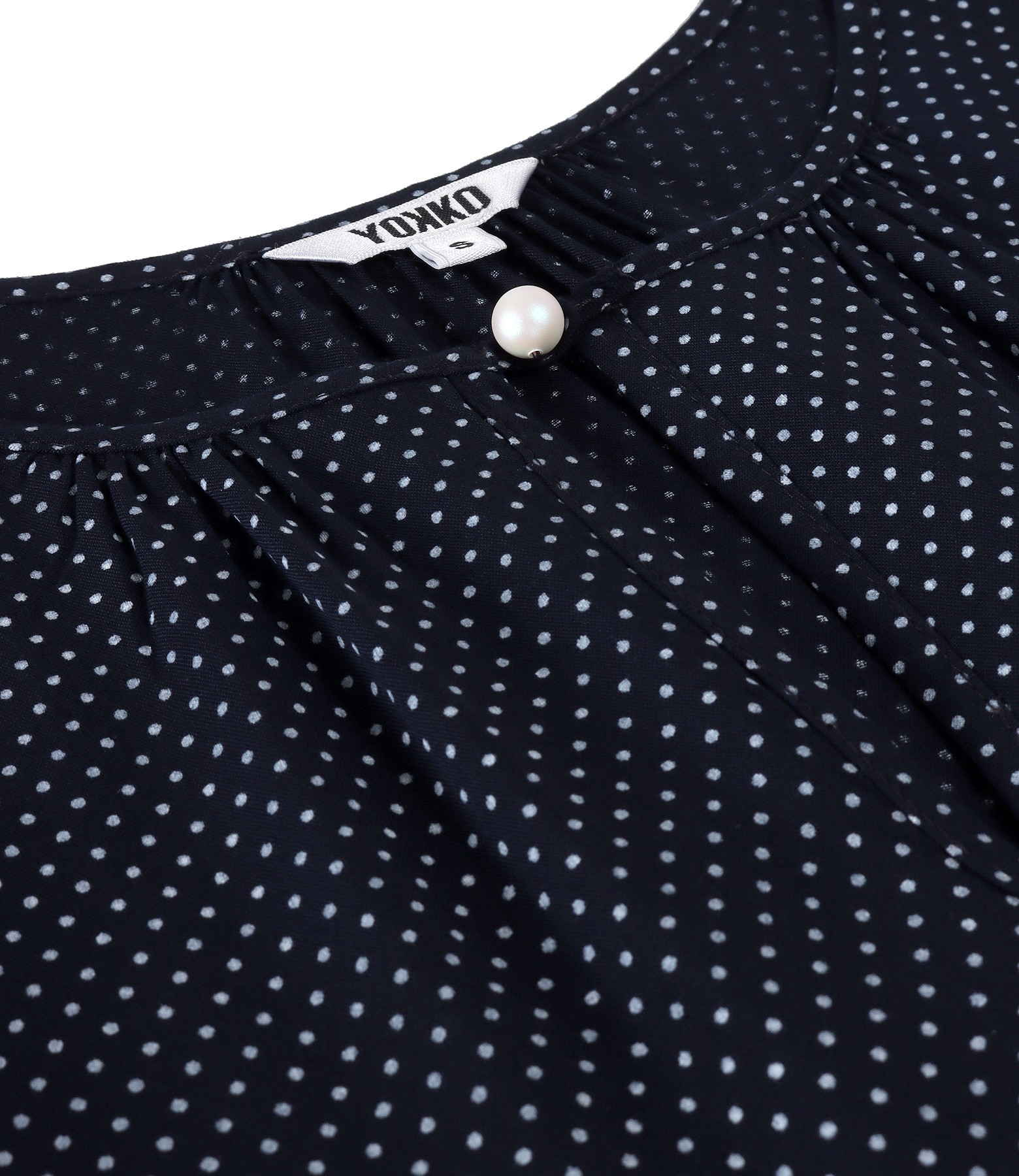 Elegant viscose blouse printed with dots, with long sleeves with elastic, with round neckline and elastic finish at the waist. It closes with a pearl button on the middle of the face.