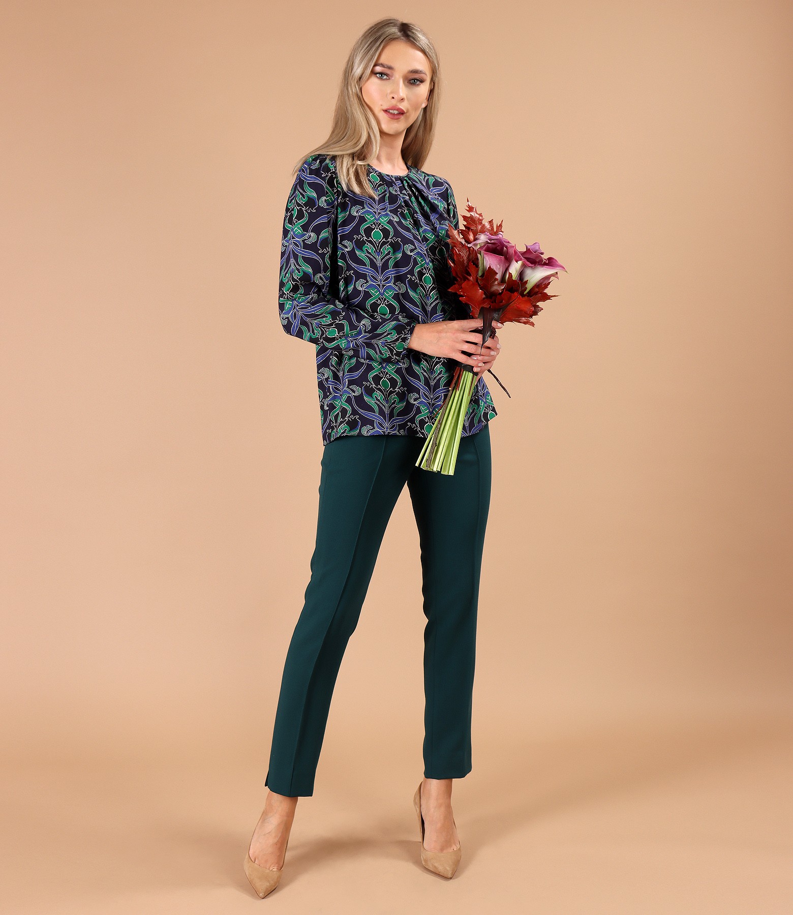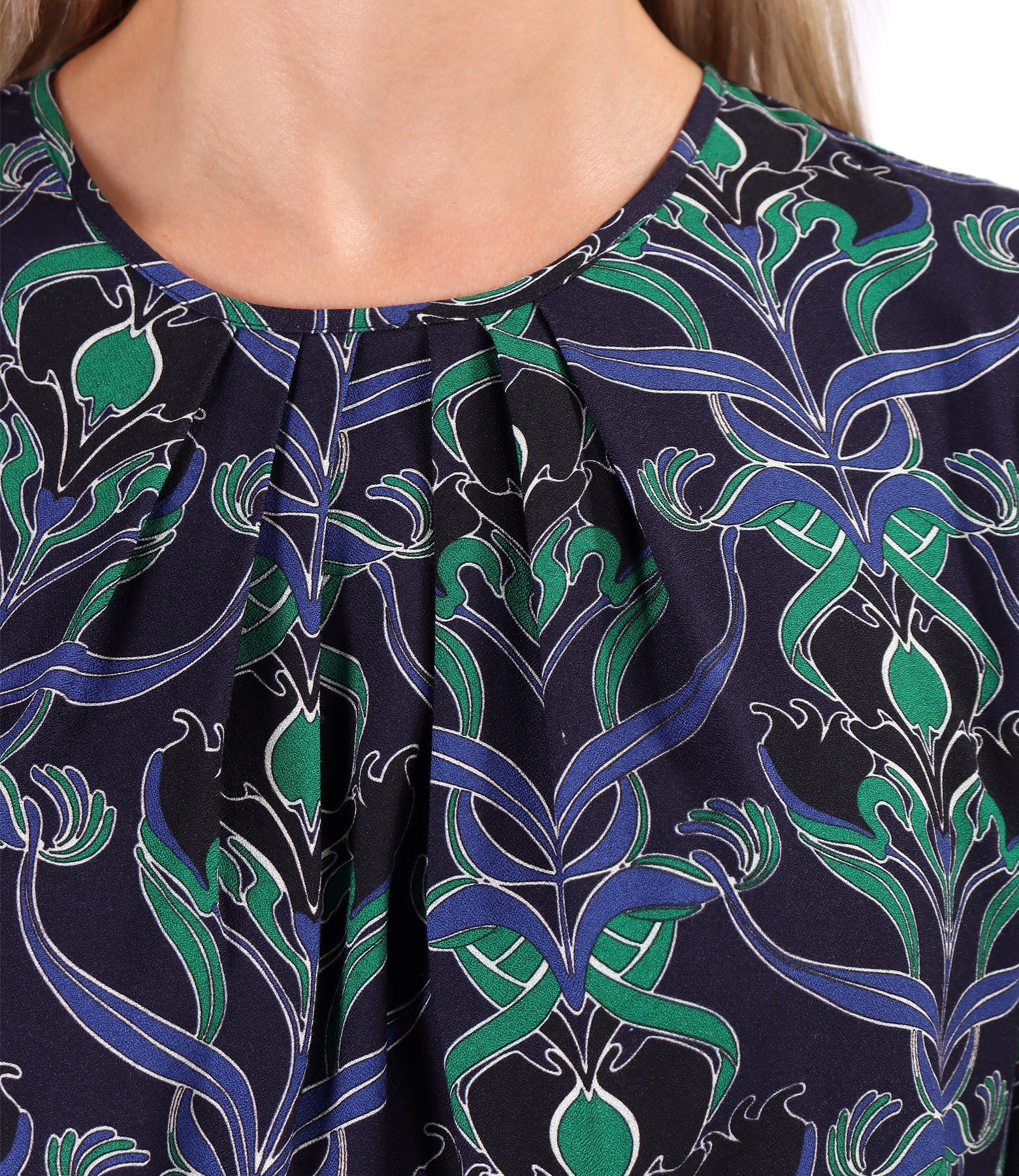 Viscose blouse printed with floral motifs, with pleats at the neckline and long sleeves gathered at the end. It closes with a button on the middle back.