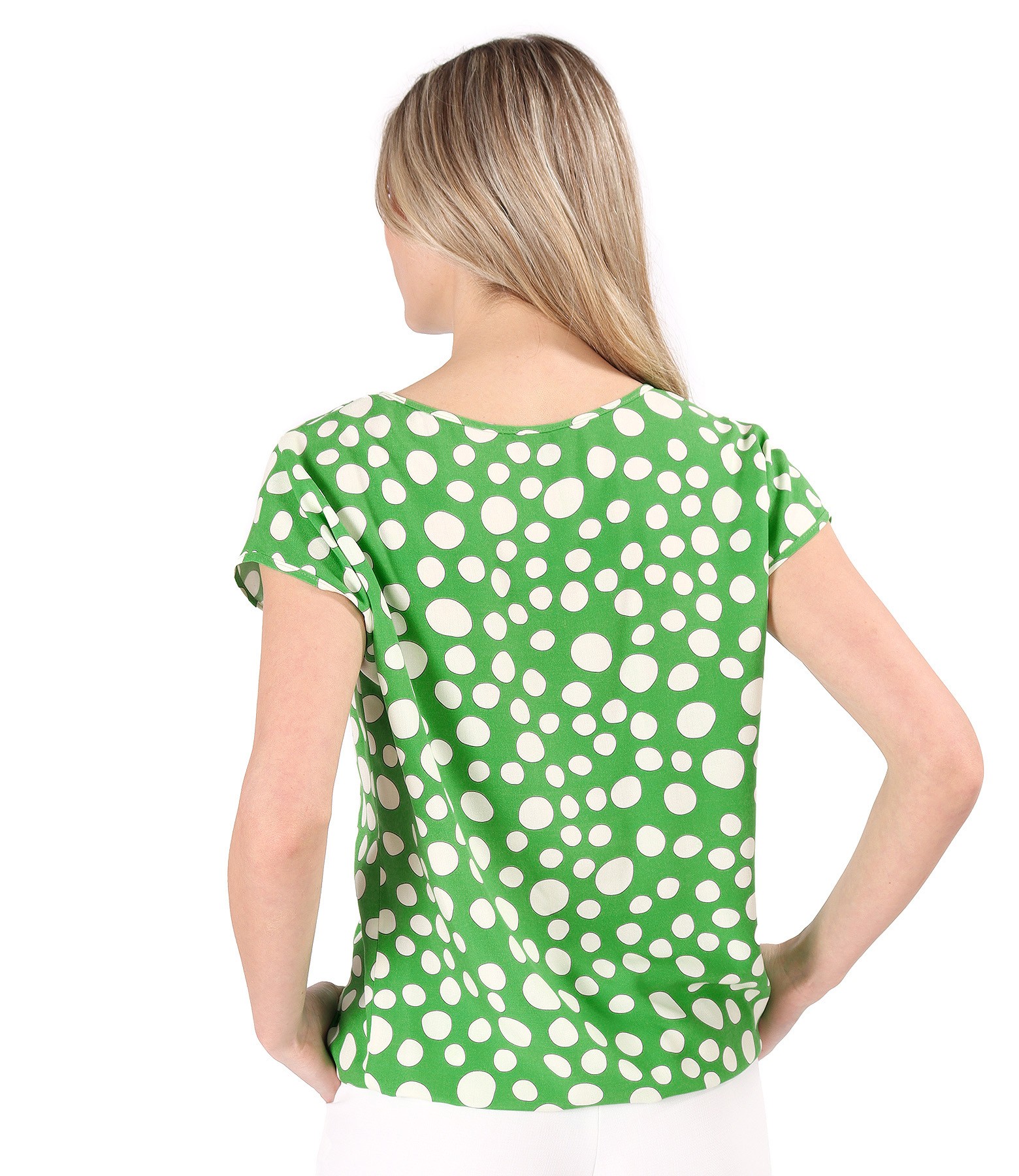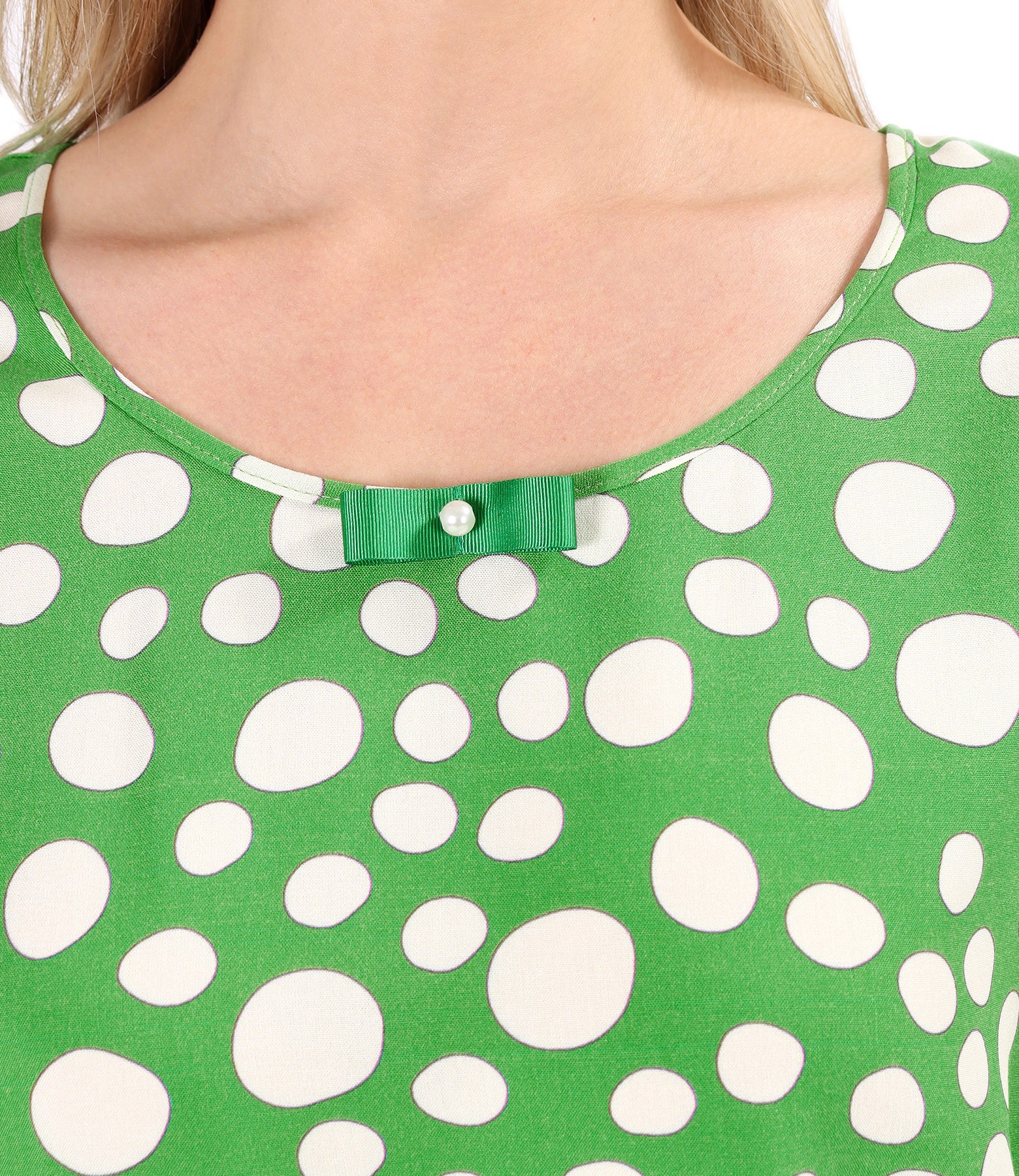 Viscose blouse printed with polka dots, with dropped shoulders, elastic at the waist, and a ribbon bow at the neckline.