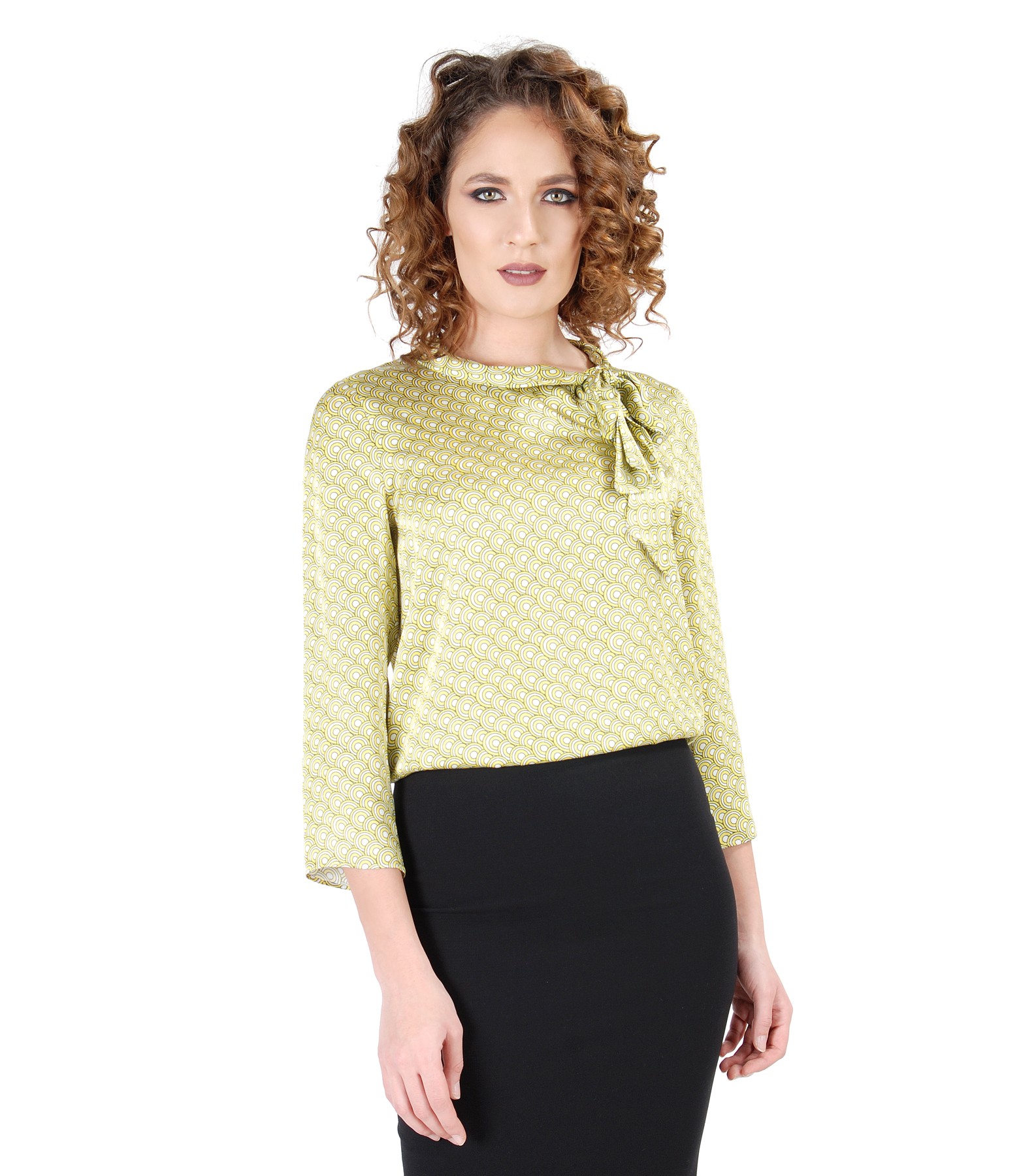 Viscose blouse with digital print, scarf collar and 3/4 sleeves.