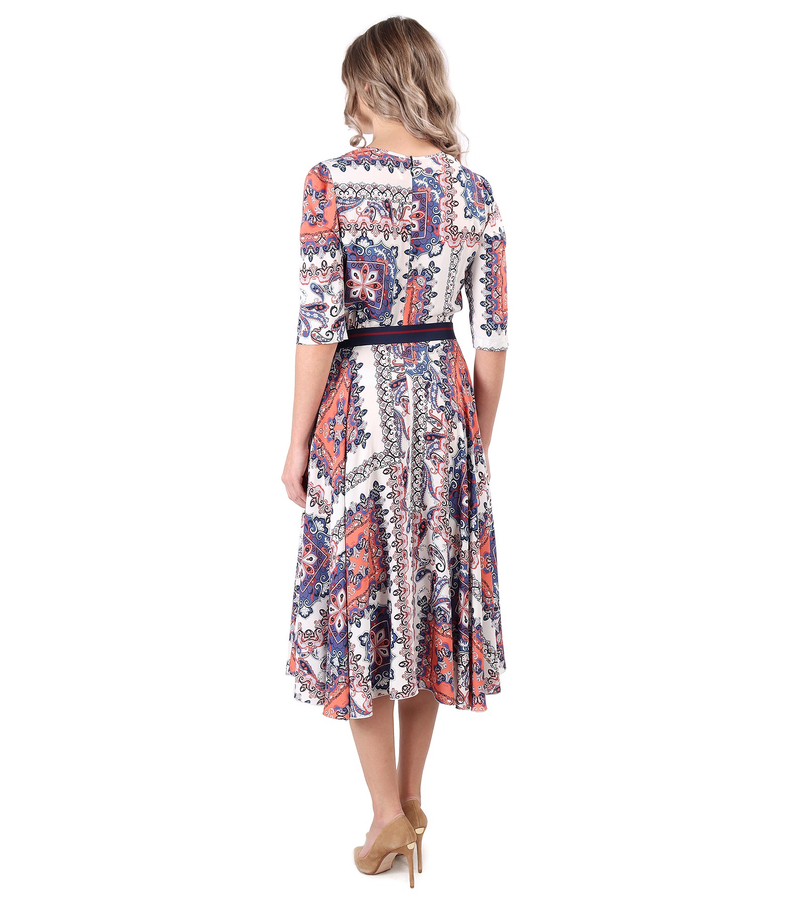 Elegant digitally printed viscose dress with floral motifs, unlined, with 3/4 sleeves, party breasts and rips cord at the waist. It closes with a zipper hidden in the middle of the back. Print position varies per product.