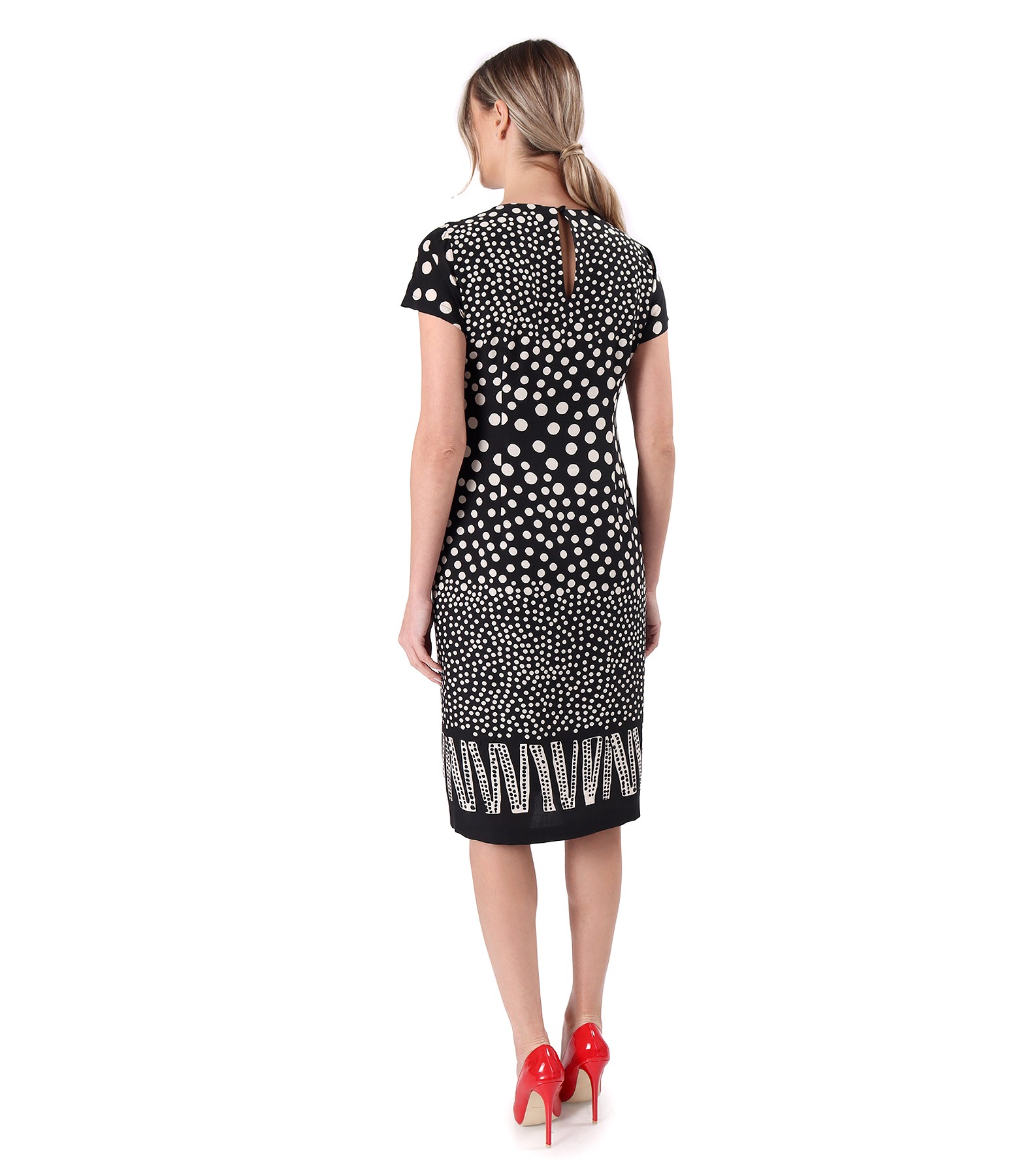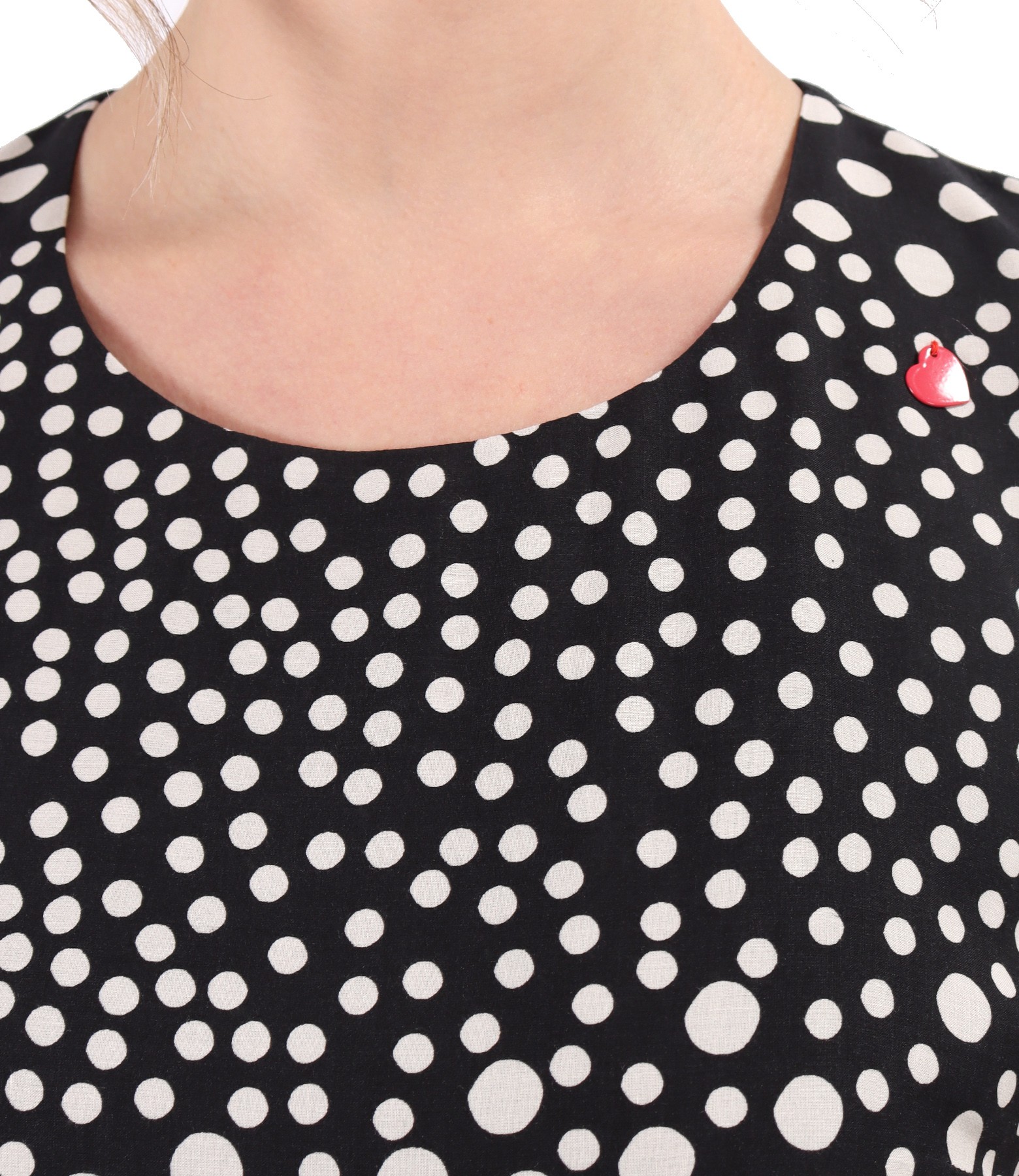 Viscose dress printed with geometric motifs, padded with viscose, with short sleeves, round neckline with decorative heart. It closes with a button on the middle back.