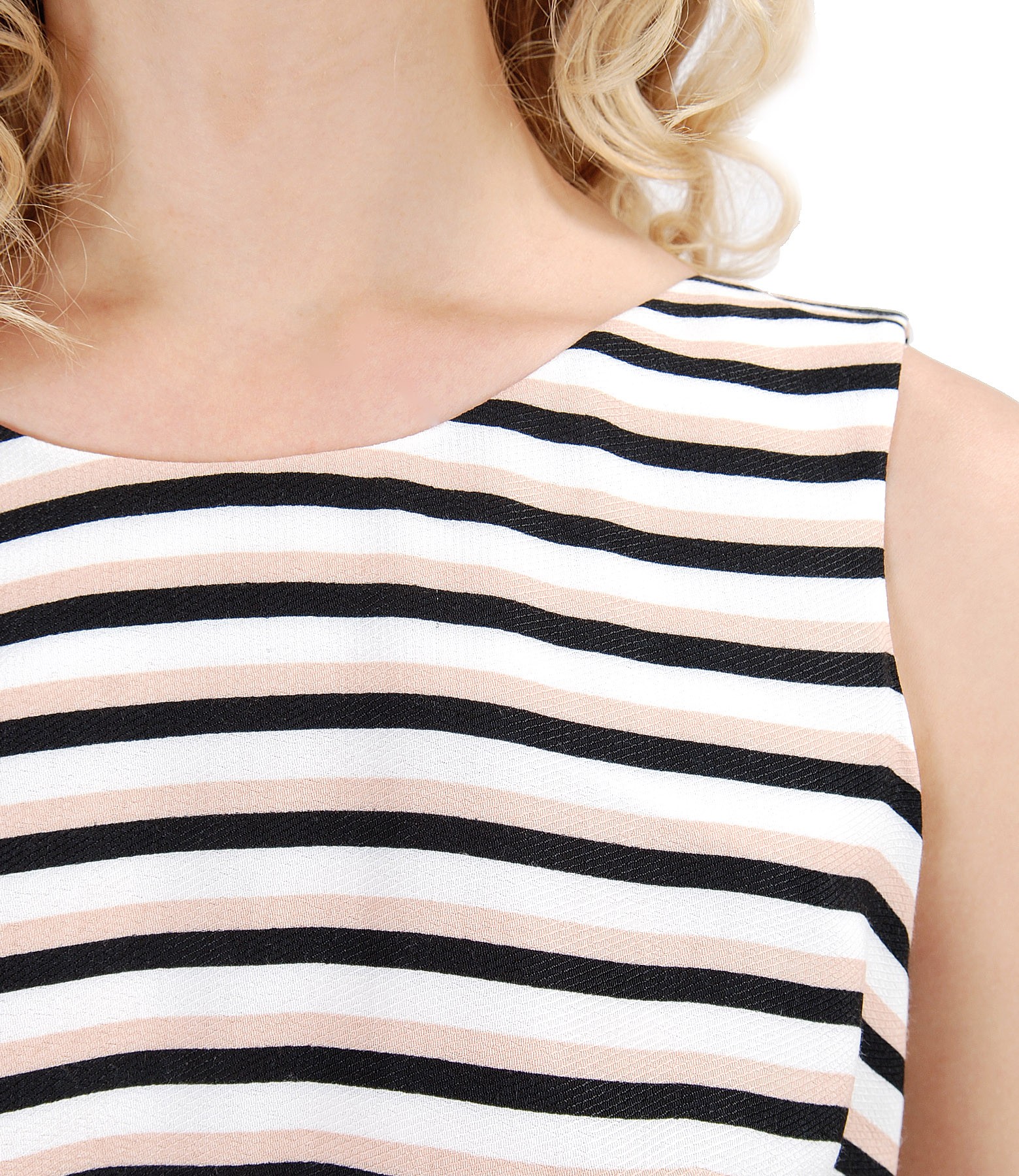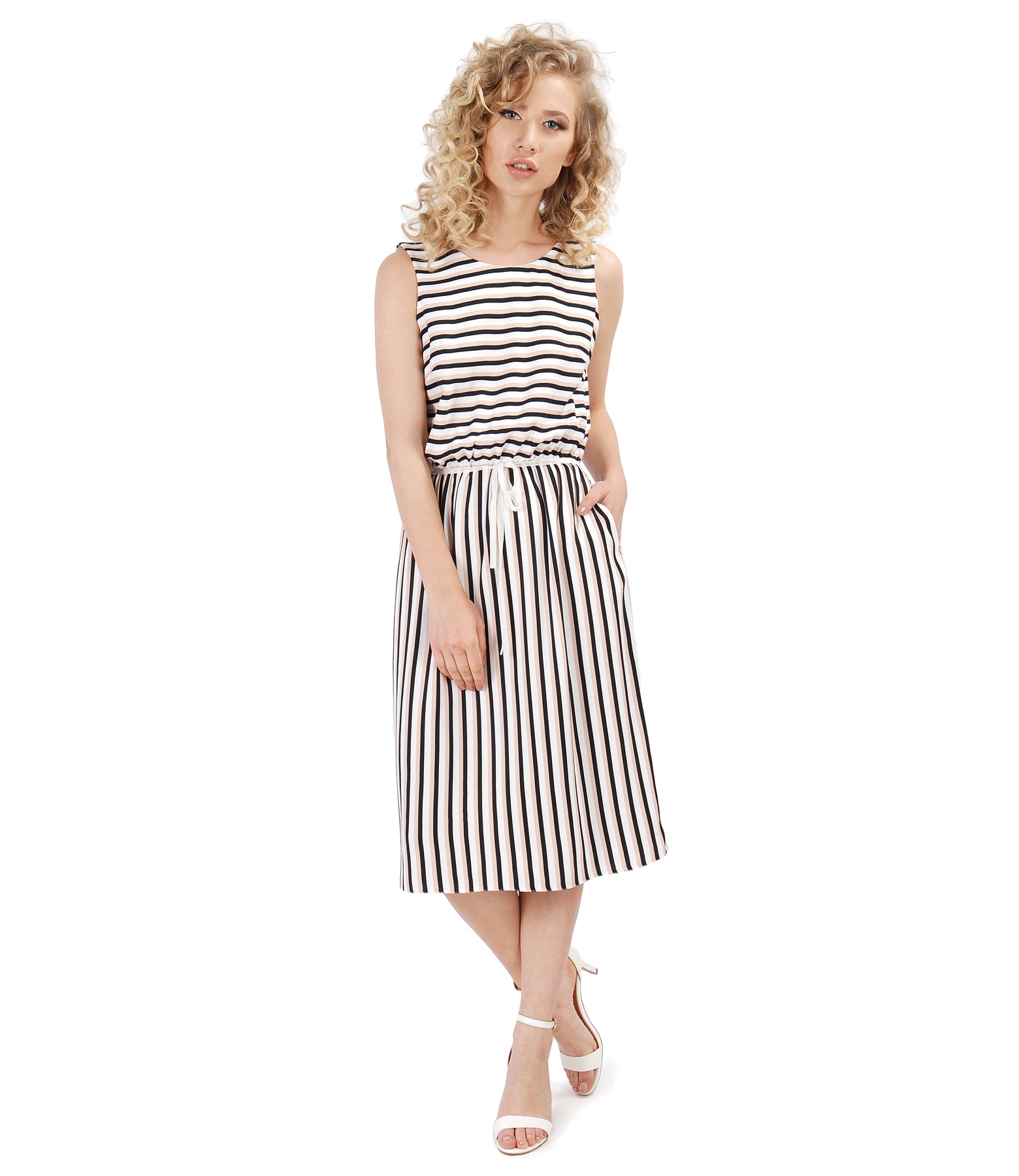 Viscose dress printed with stripes, unlined, with side pockets, round low-cut neck with elastic waist. Have no closing system.