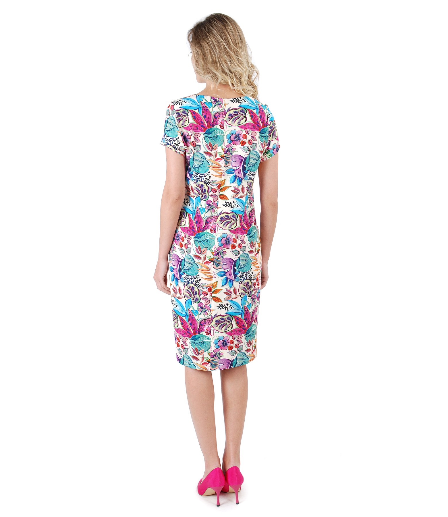 Casual dress, inlay, made of viscose woth floral print, round low-cut neck. Closes with hidden zipper on the middle back.