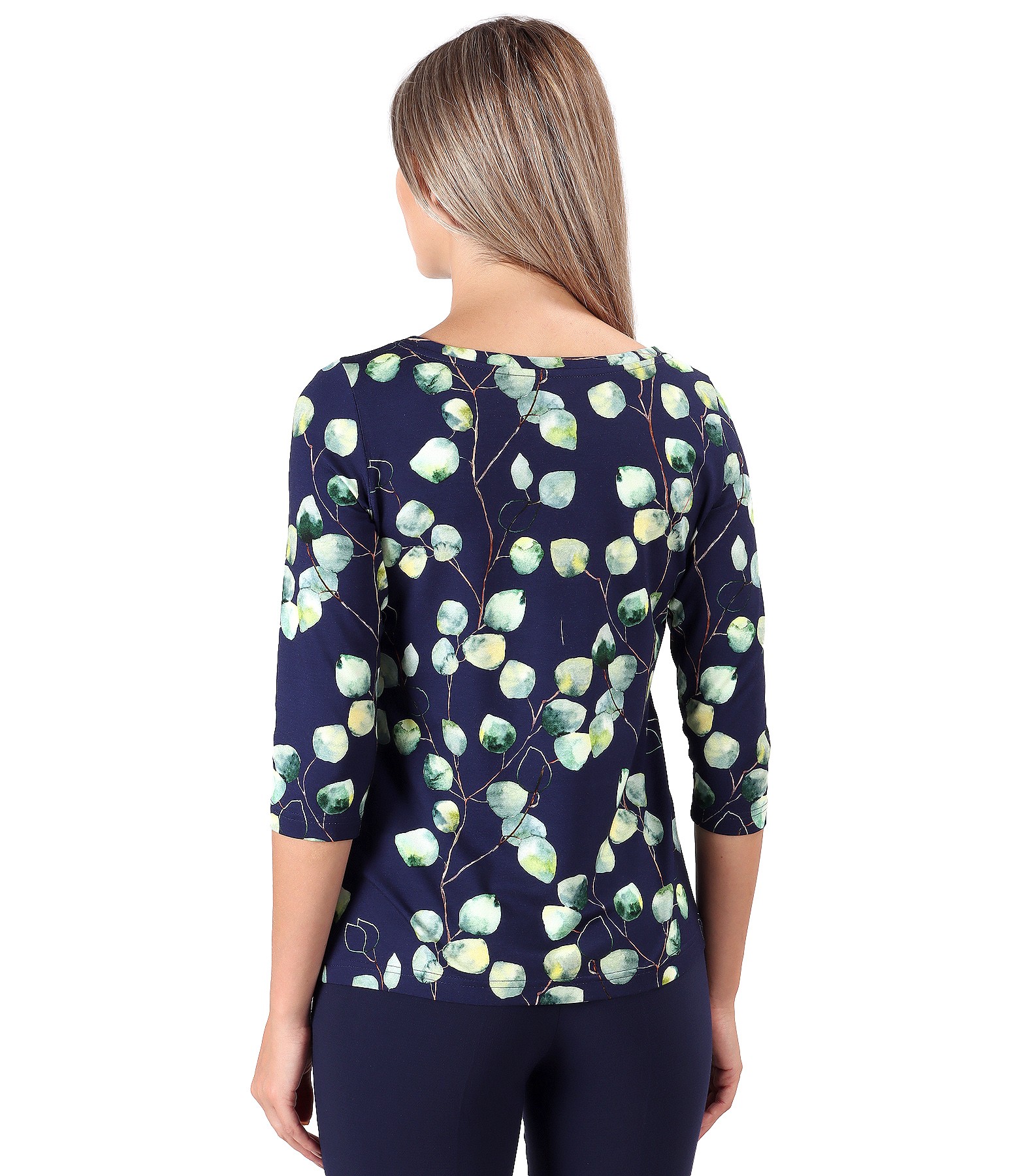Viscose elastic jersey blouse, printed with floral motifs, with round neckline and 3/4 sleeves.