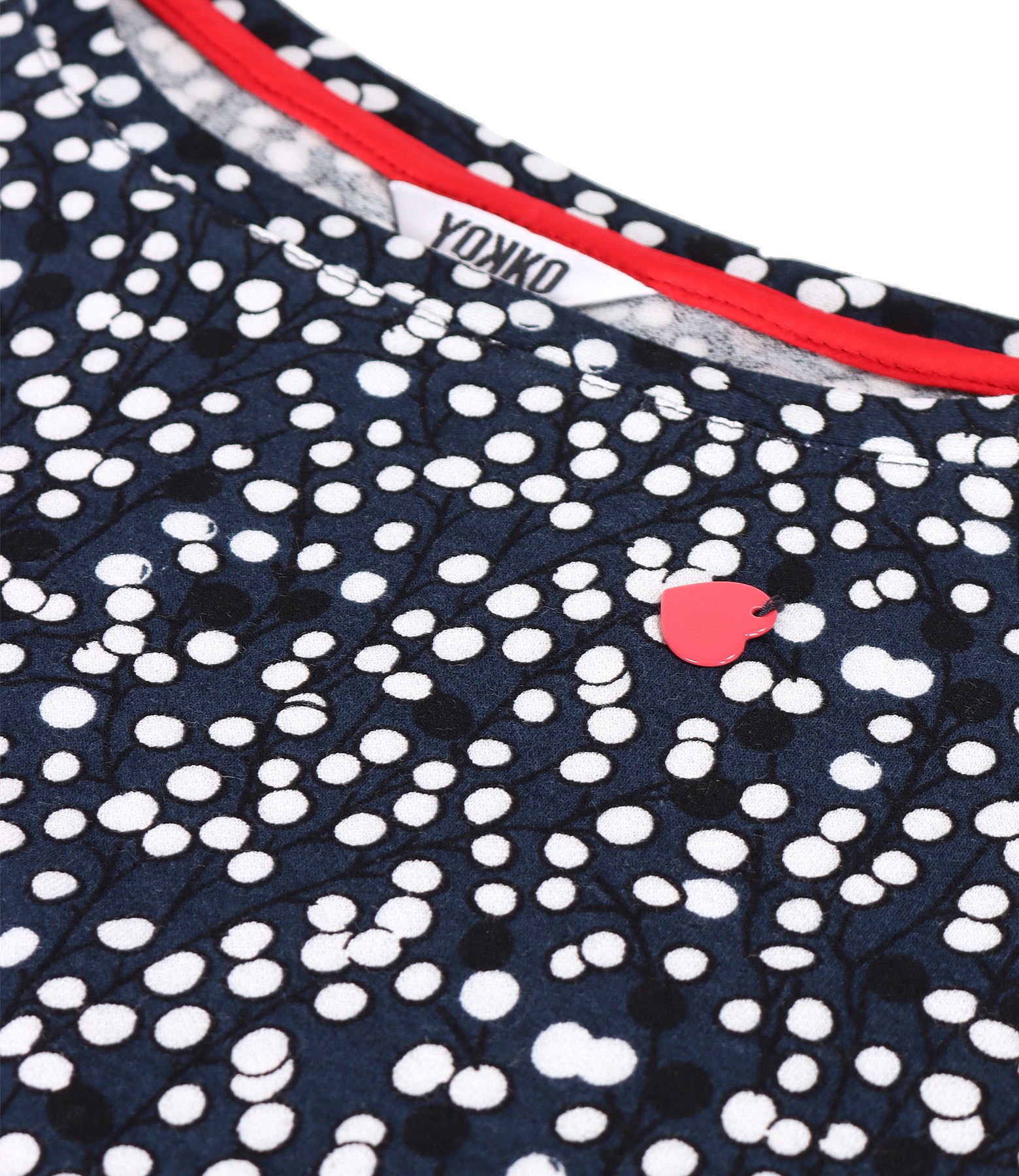 Rochie din jerse elastic de viscoza, imprimat cu picouri si crengute, necaptusita, cu decolteu barcuta cu inima metalica cusuta pe fata si umeri cazuti.