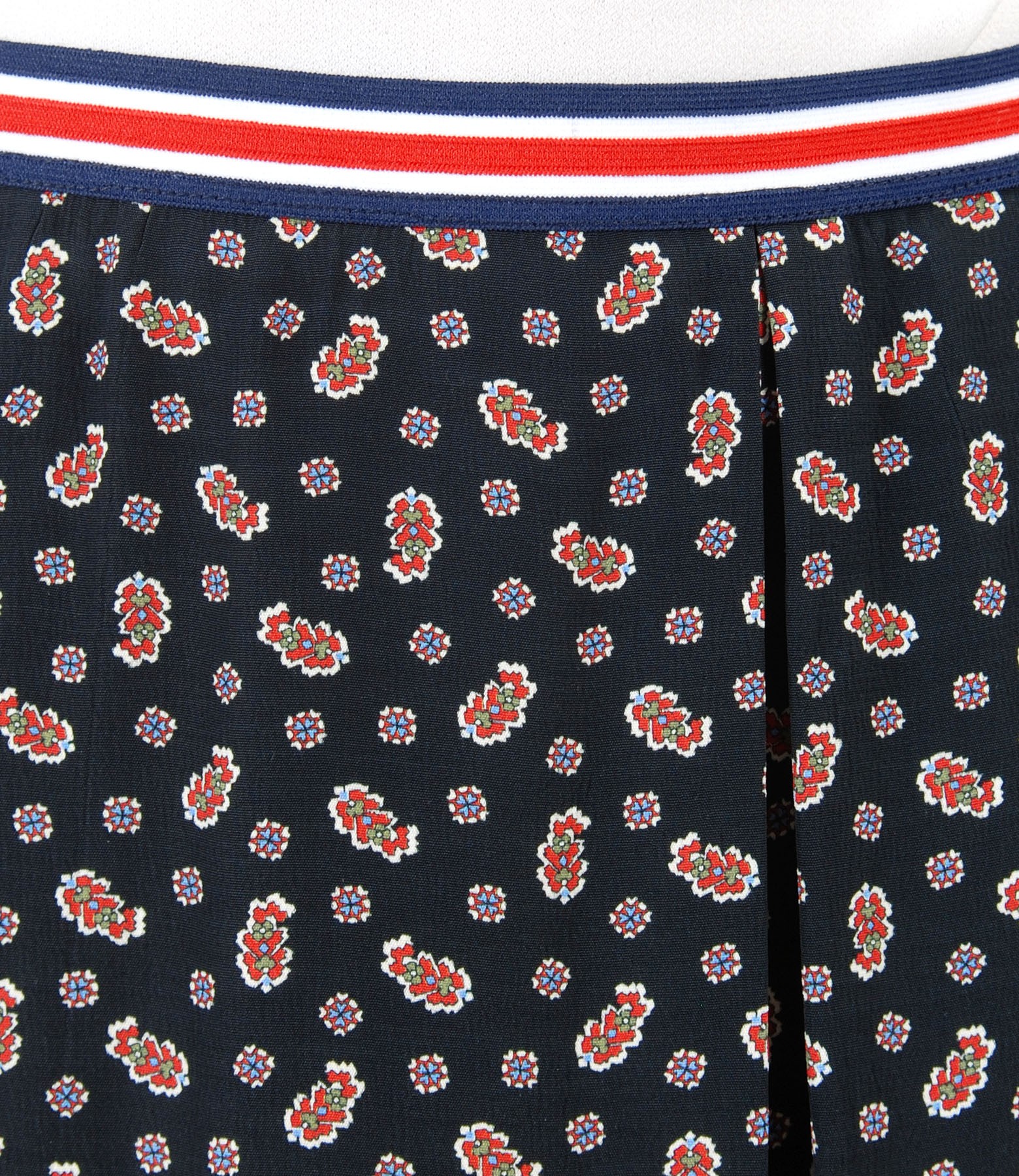 Viscose flaring skirt with floral print, with front and back folds, vertical side pockets and elastic belt. Closes with hidden zipper on the middle back.