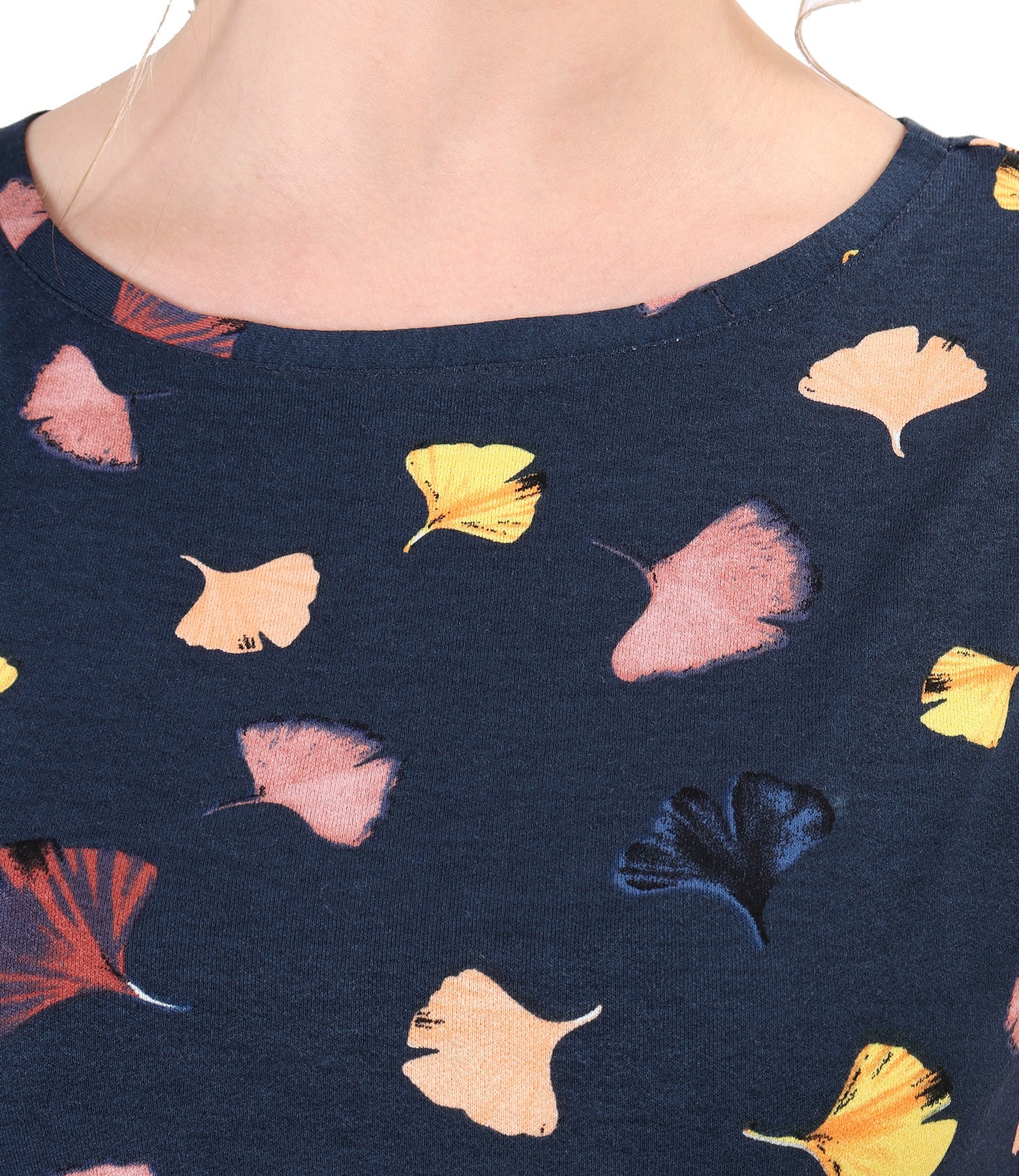 Viscose elastic jersey t-shirt printed with leaves, with a boat neckline, dropped sleeves and veil insert on the left shoulder.