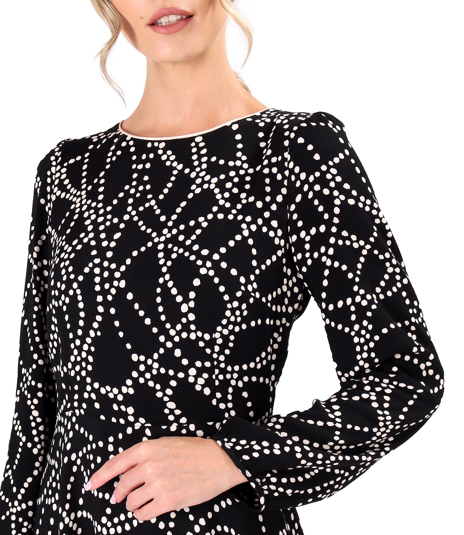 Viscose midi dress printed with geometric motifs, doubled with viscose, with long sleeves and round neckline. It closes with a hidden zipper in the middle of the back.