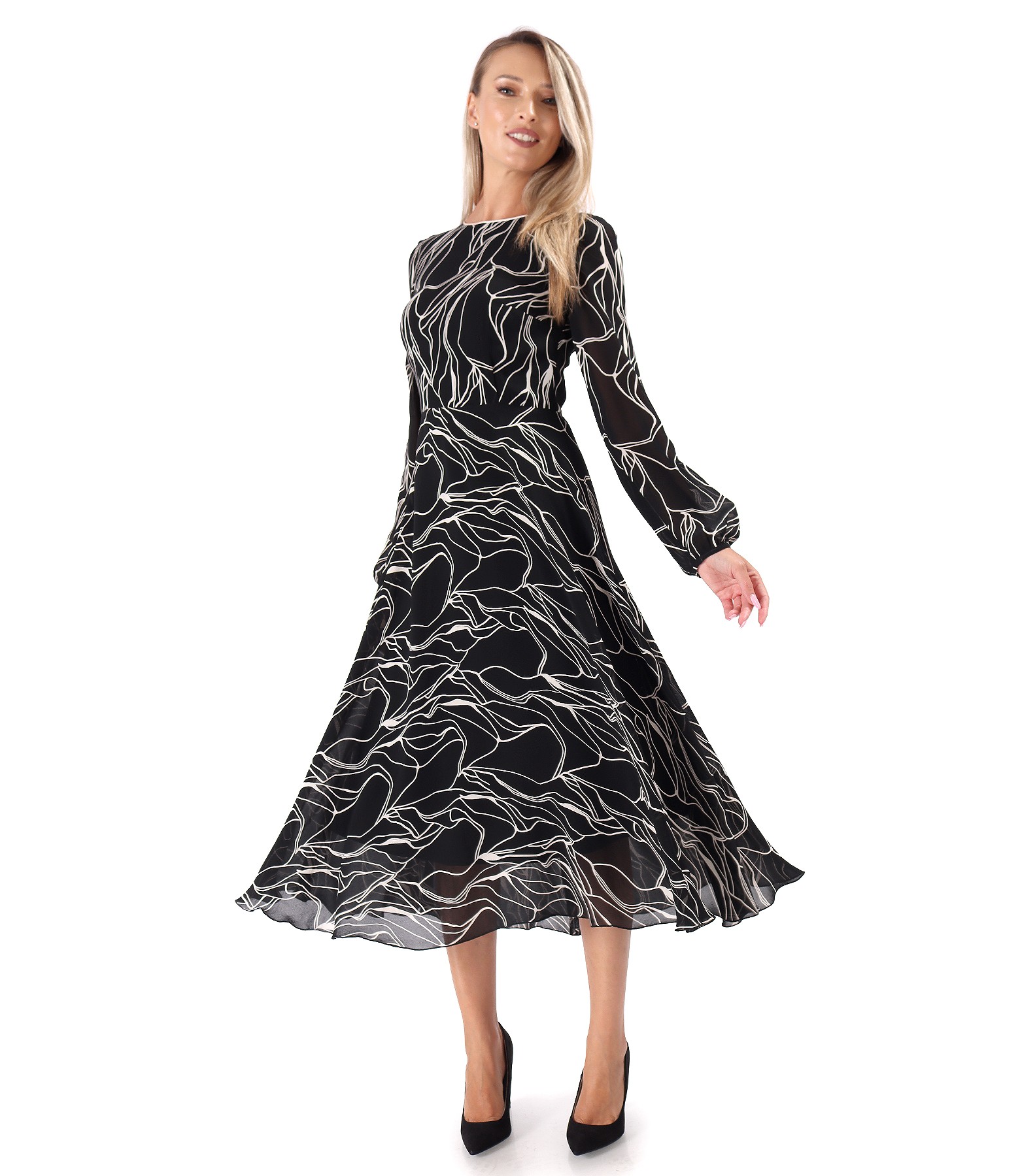 Viscose midi dress printed with geometric motifs, lined with viscose, with a round neckline and long sleeves gathered at the ends. It closes with a hidden zipper in the middle of the back. Braul si floarea se vand separat.