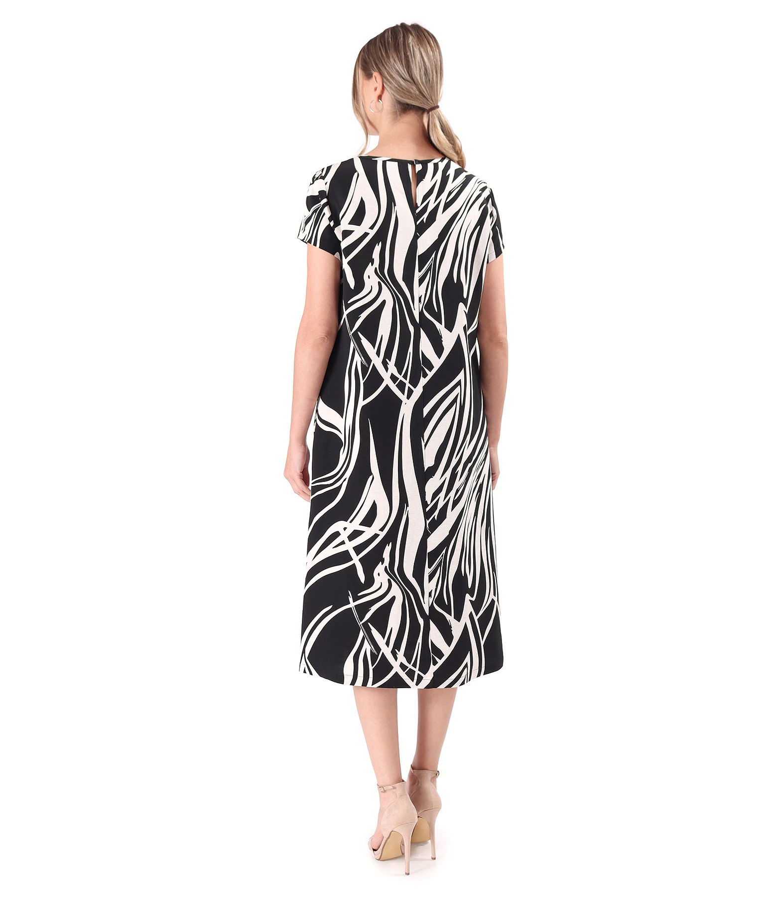 Viscose midi dress with linen, printed with geometric motifs, with short sleeves, a round neckline and side pockets. It closes with a button at the center back.