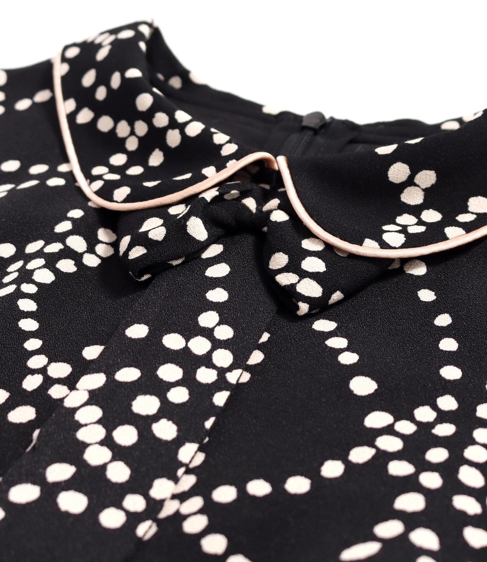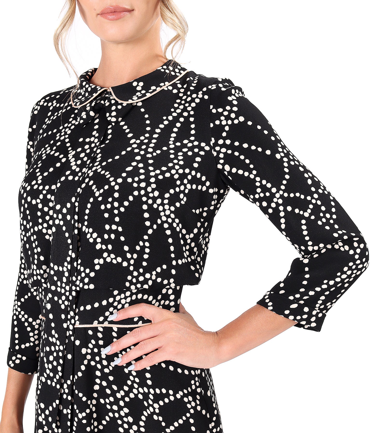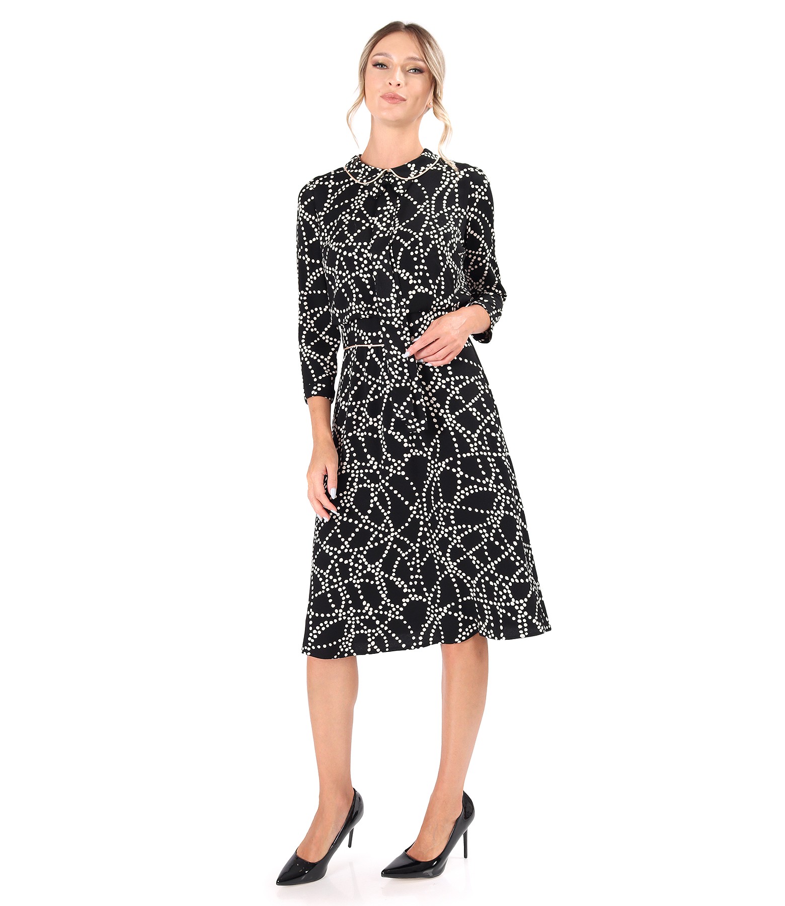 Midi dress in viscose printed with geometric motifs, doubled with viscose, with 3/4 sleeves with cuffs, and a round collar with a bow of the same material. It closes with a hidden zipper in the middle of the back.