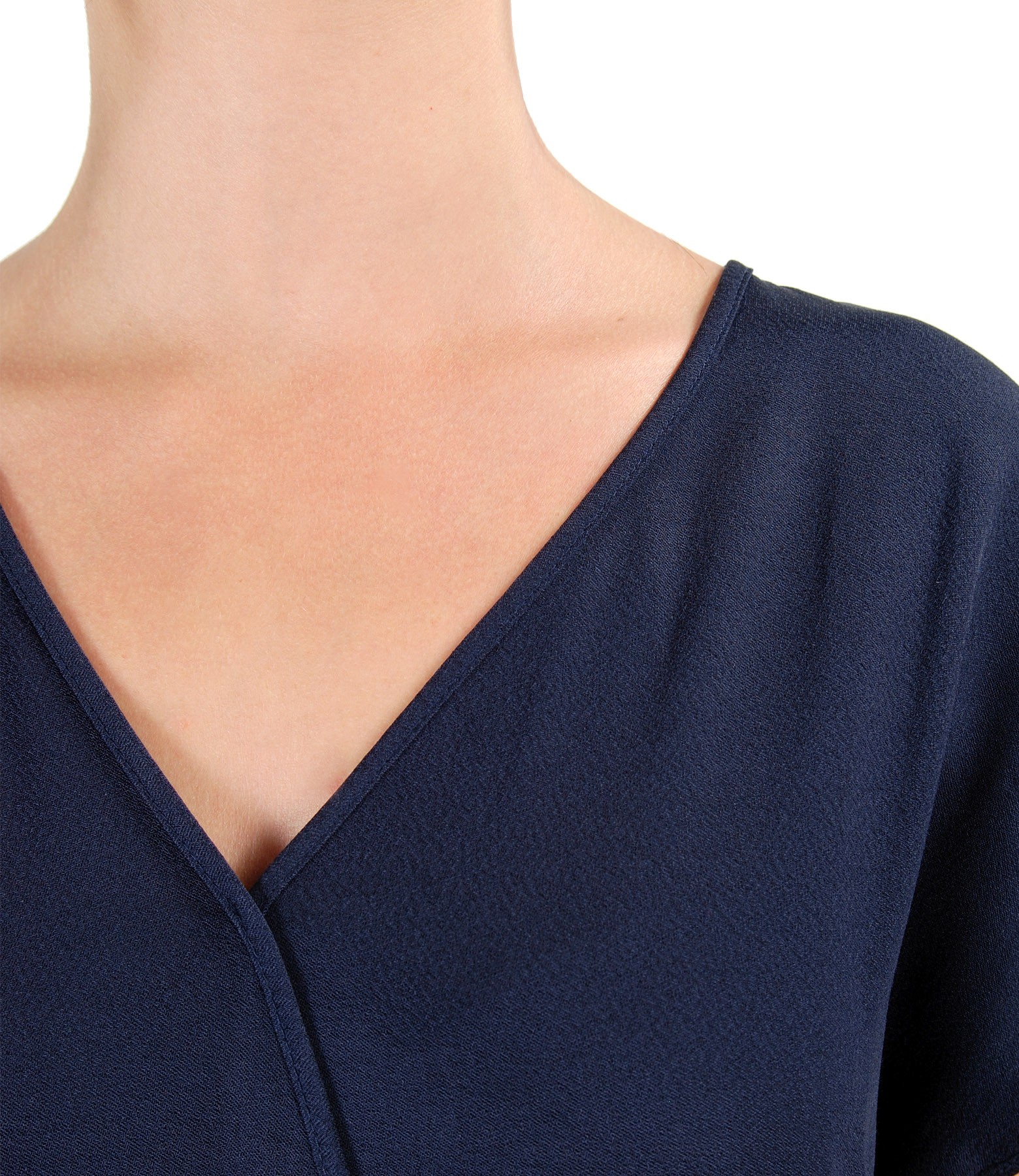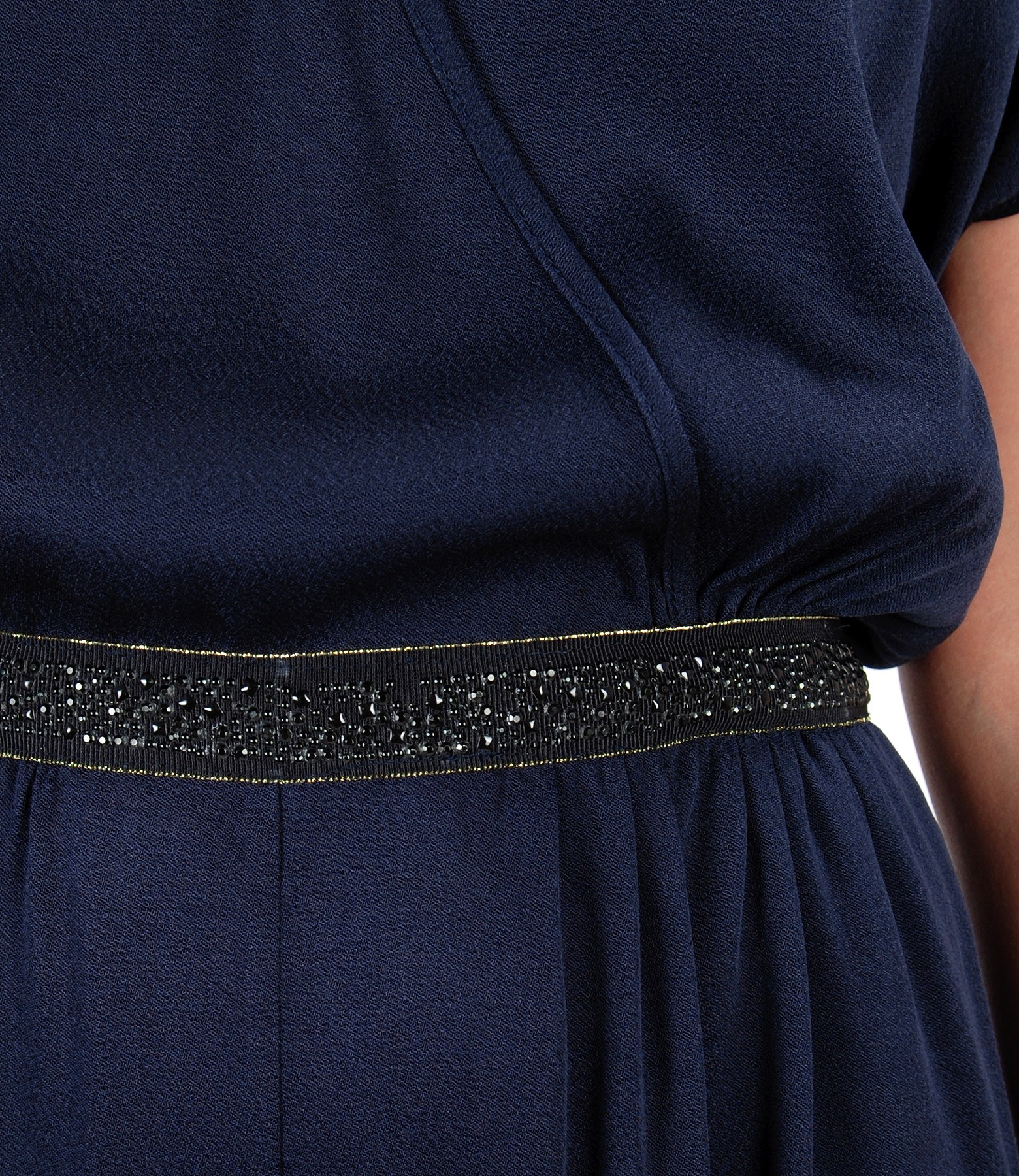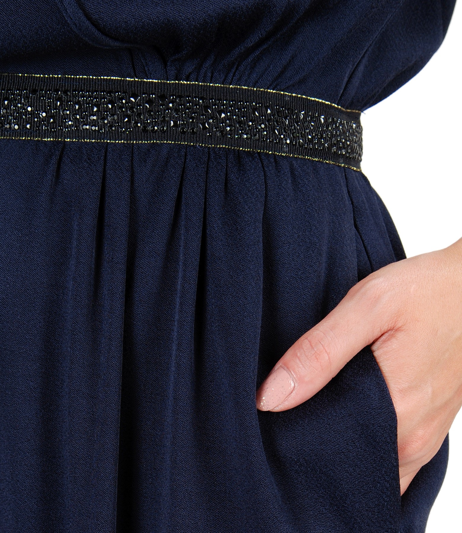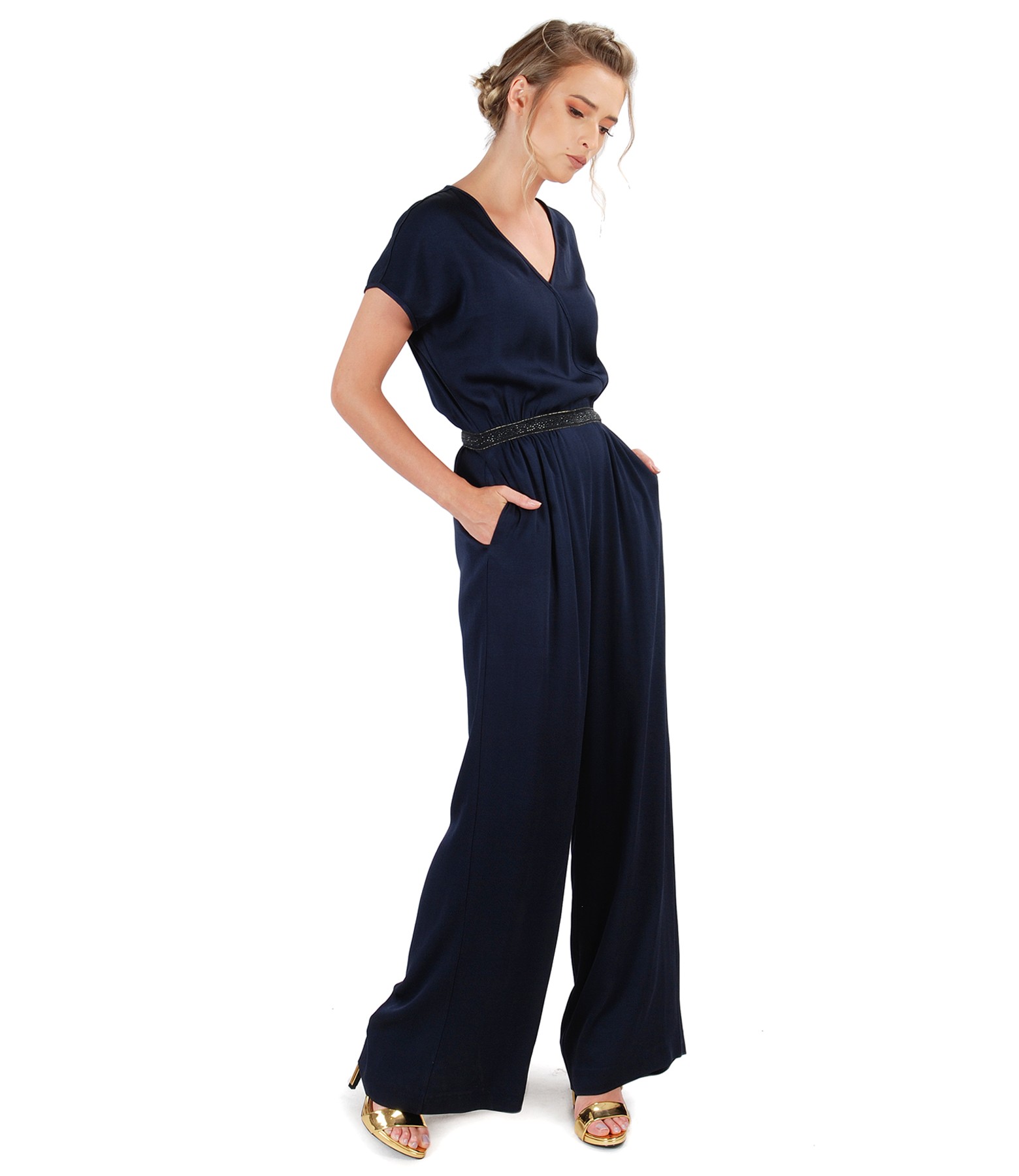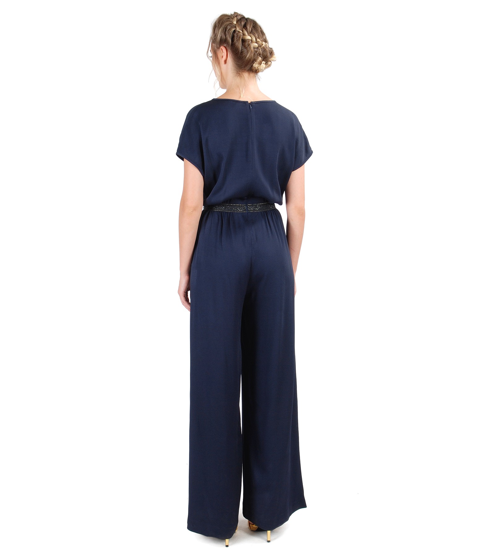 Viscose overall, unlined, with trim, side pockets and draping sleeve. Closes with hidden zipper on the middle back.