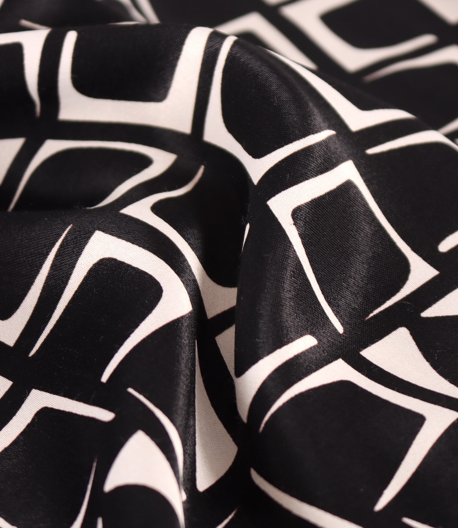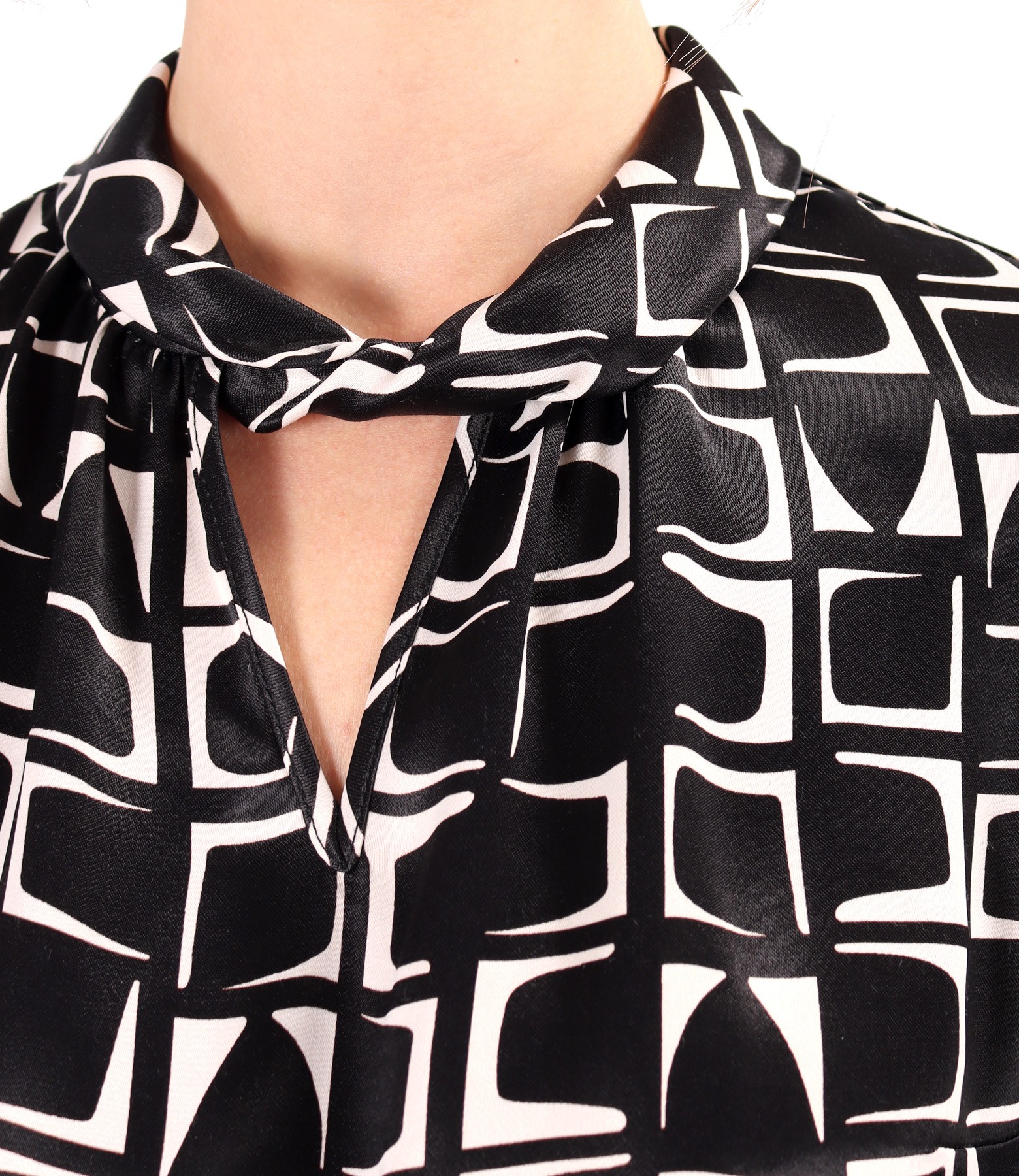 Geometric printed viscose satin blouse with turn-down collar, long sleeves with 2-button cuffs. It closes with a button at the back.
