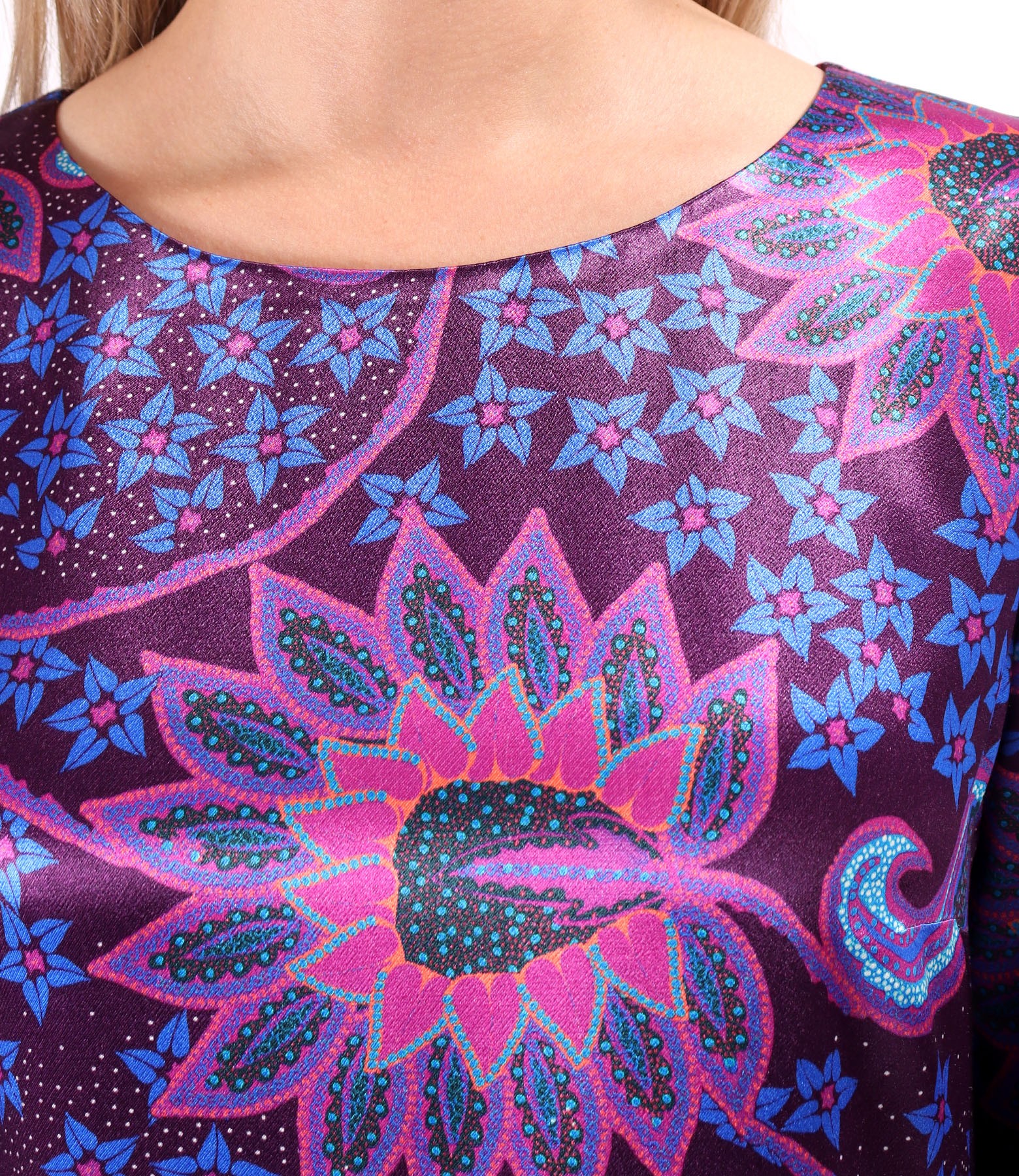Viscose satin dress printed with paisley motifs. featuring 3/4 sleeves, a round neckline, and a zipper closure at the back.