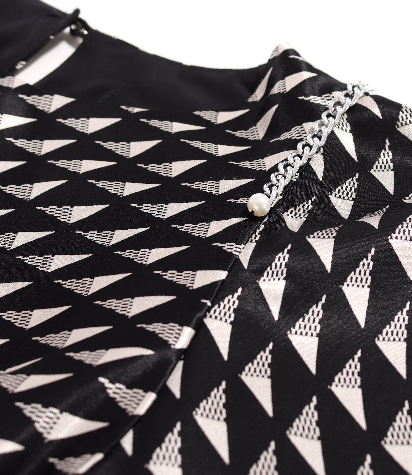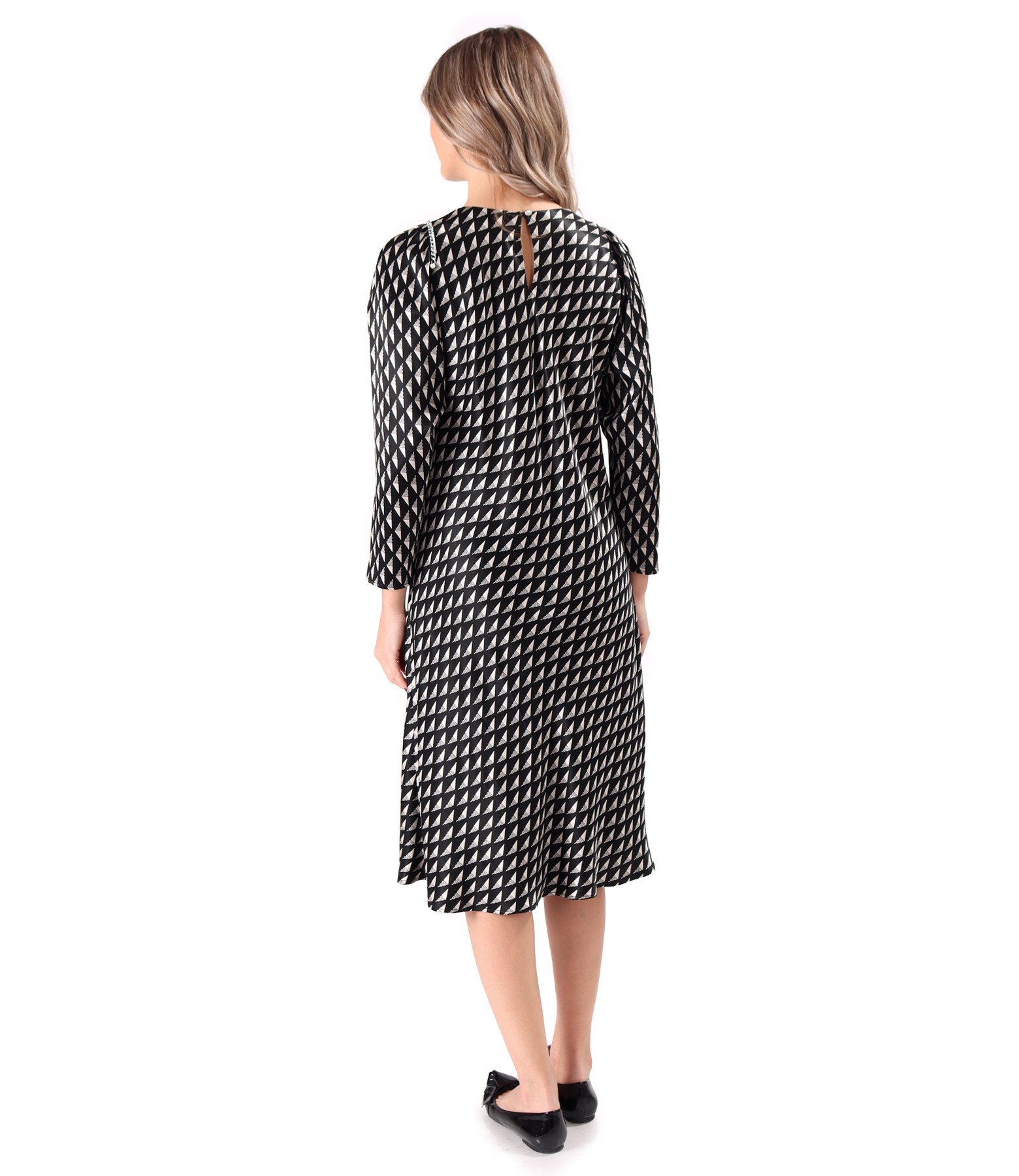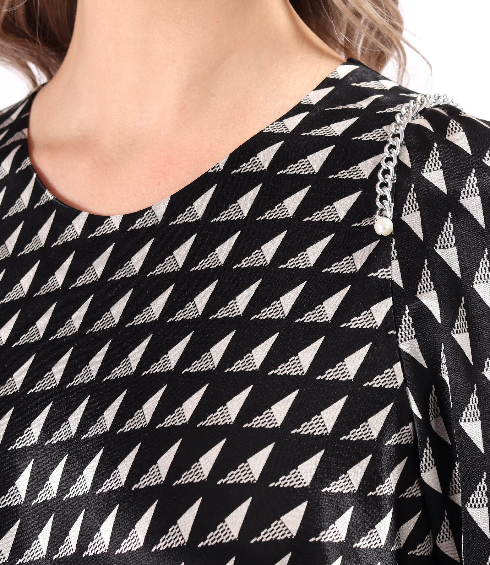 Viscose satin midi dress printed with geometric motifs, lined with viscose, with semi-long sleeves gathered at the shoulder and a decorative chain on the left shoulder. It closes with a button at the center back.