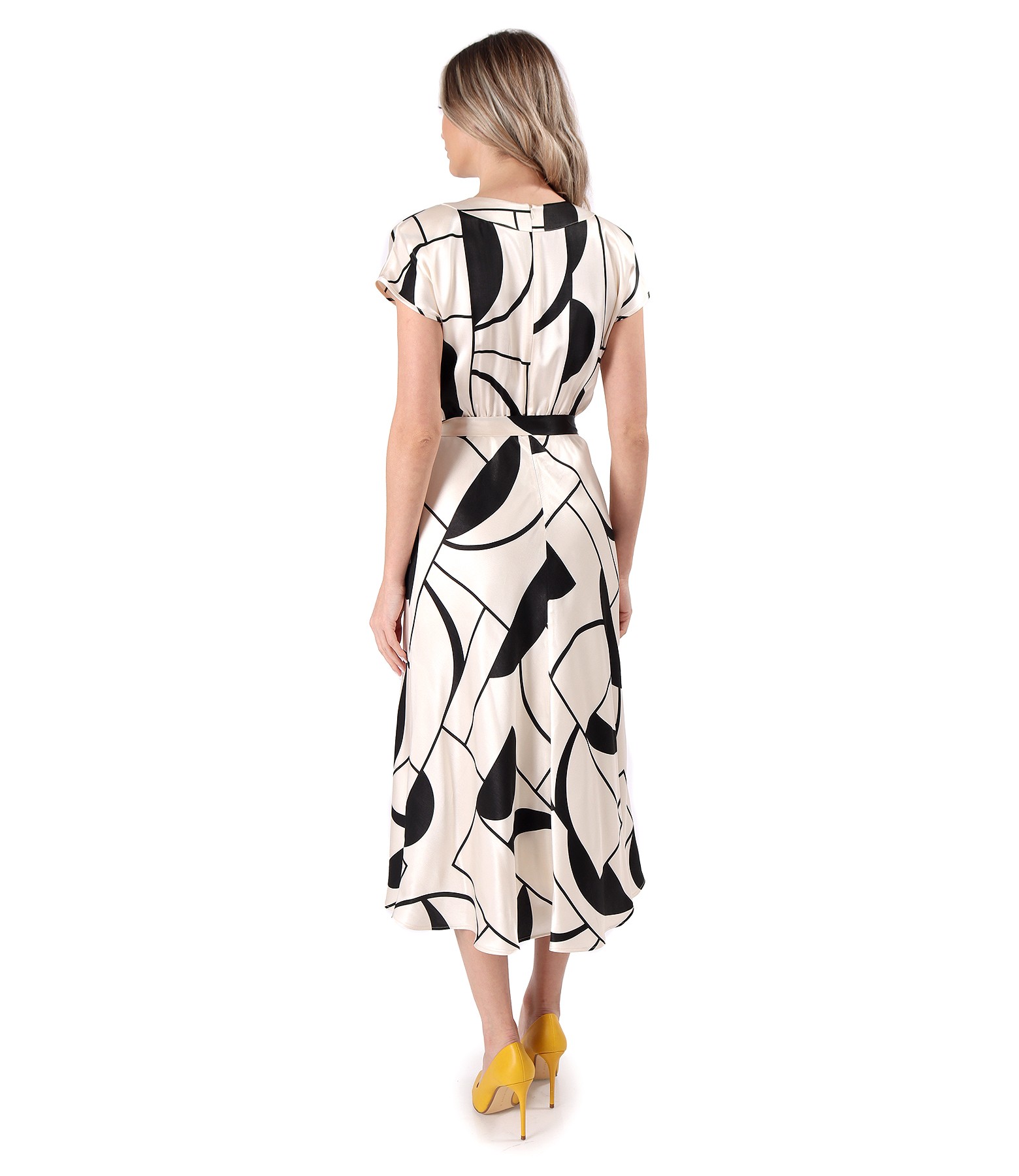 Midi dress made of viscose satin printed with geometric motifs, wrapped bust, a waist belt, and short sleeves. It is doubled with viscose at the bottom part.