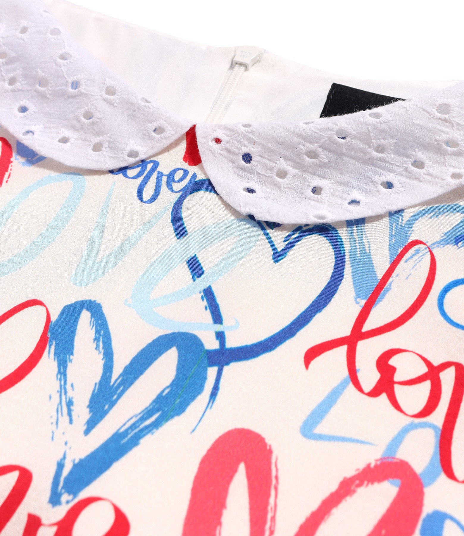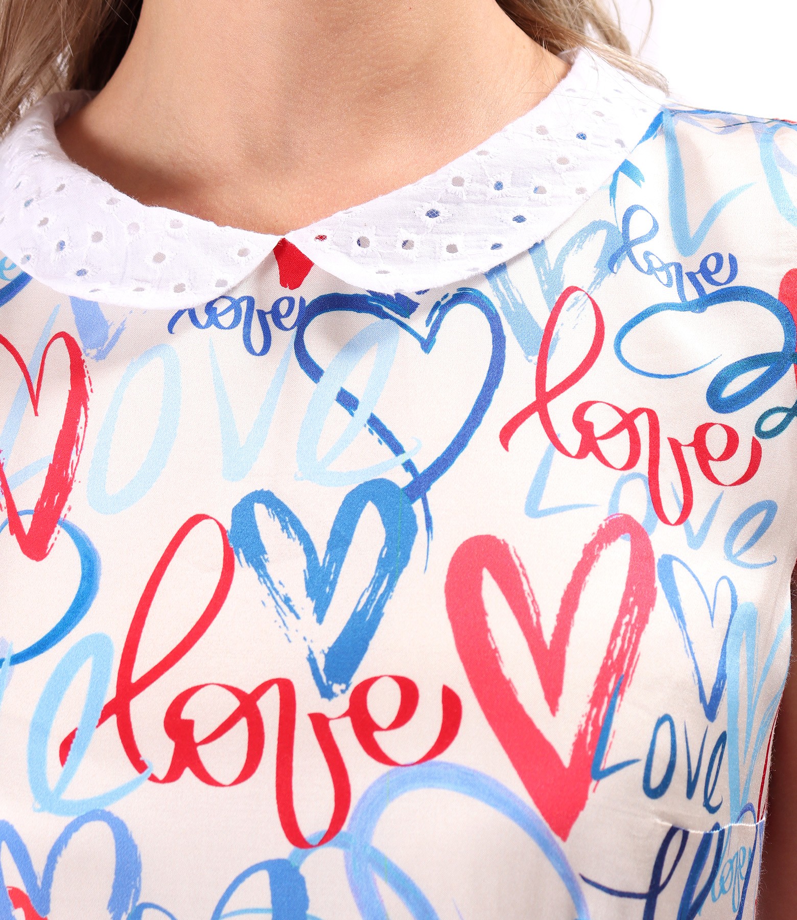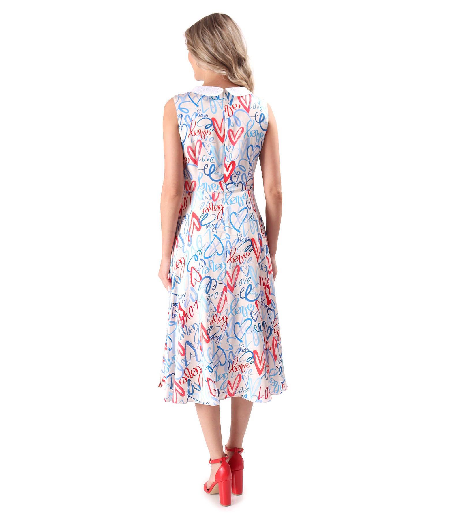 Midi dress in viscose satin printed with hearts, with lace collar, sleeveless. It closes with a hidden zipper at the center back.