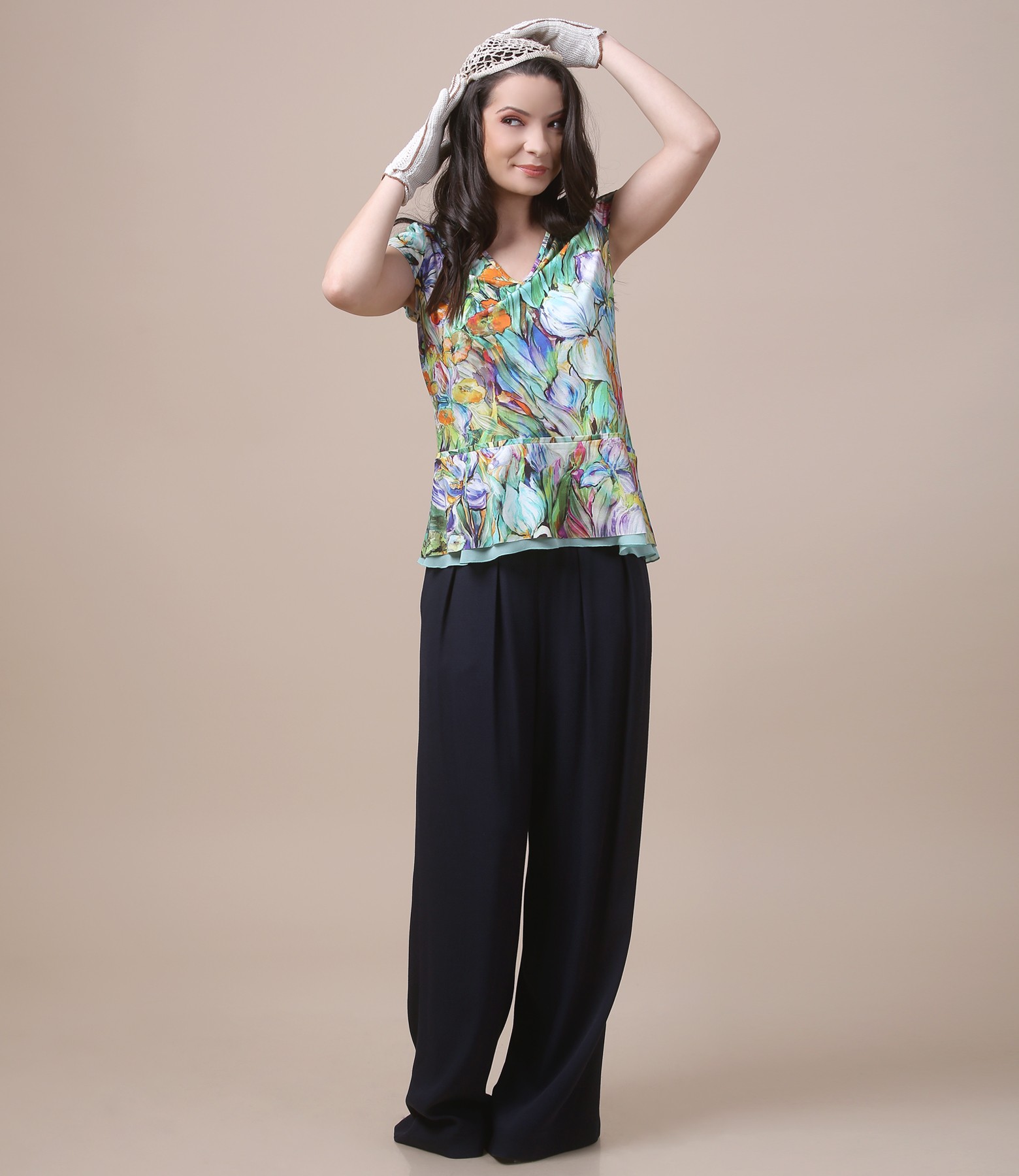 Viscose wide pants, with front and back folds and side pockets. Closes with hidden zipper on the side.