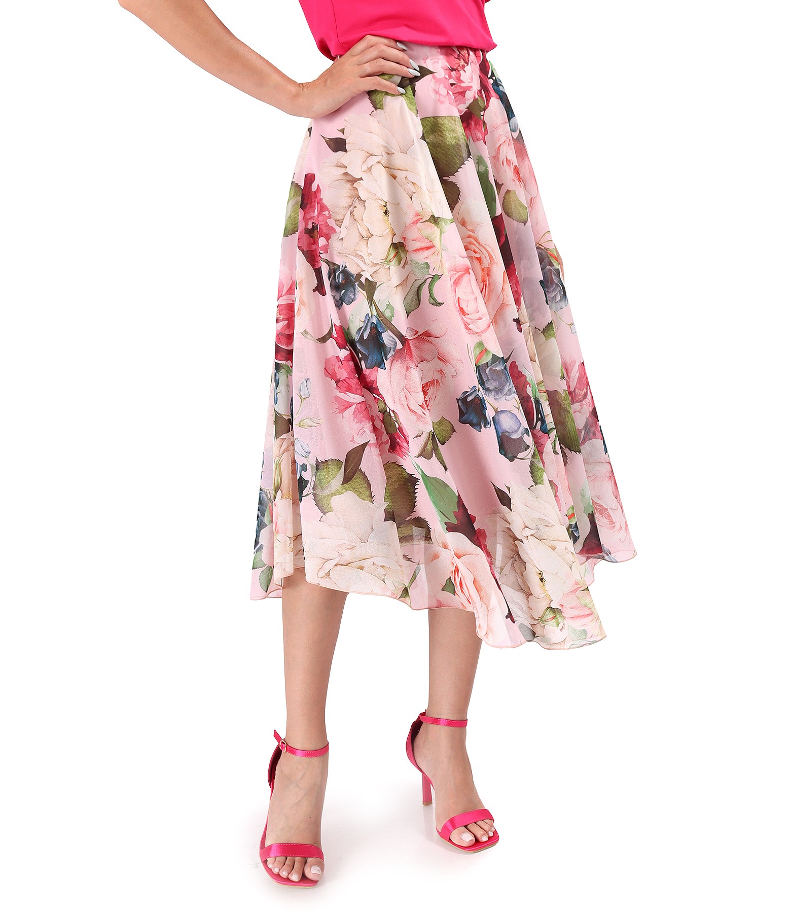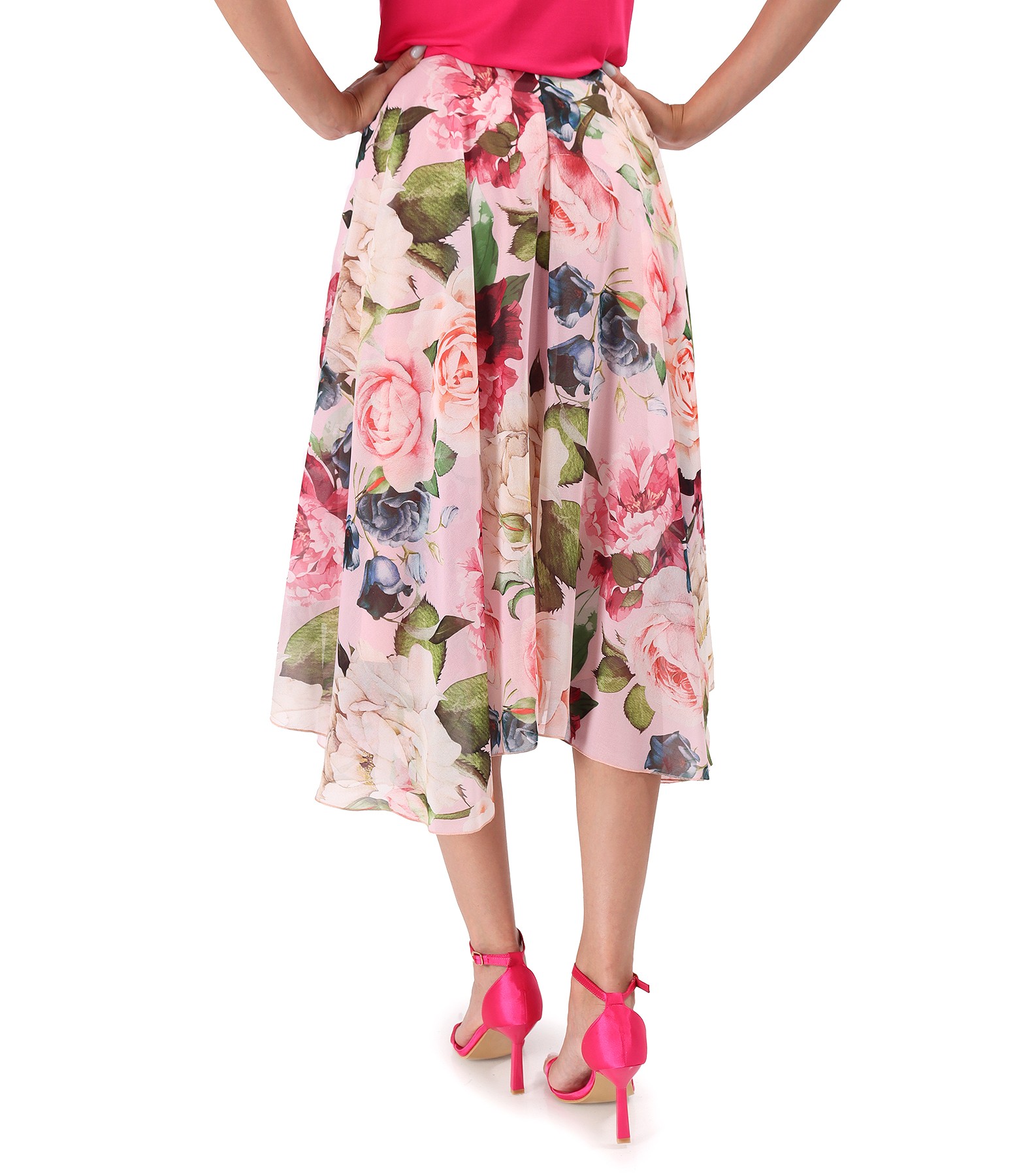 Voile skirt printed with floral motifs doubled with viscose. It closes with a hidden zipper in the middle of the back.