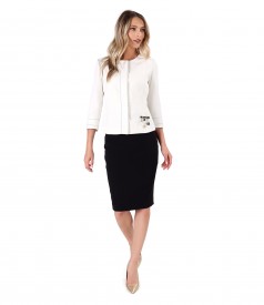 Womens office suit with tapered skirt and jacket with a brooch at the waist