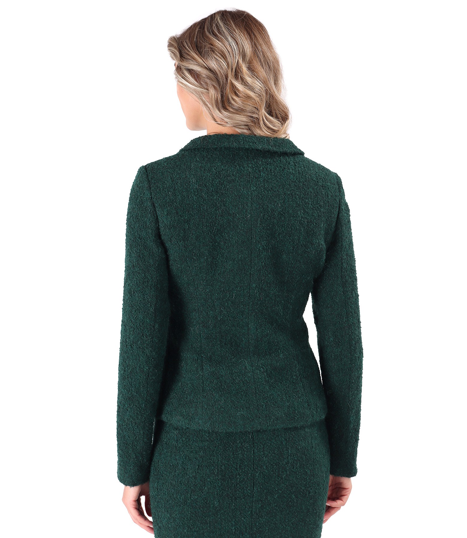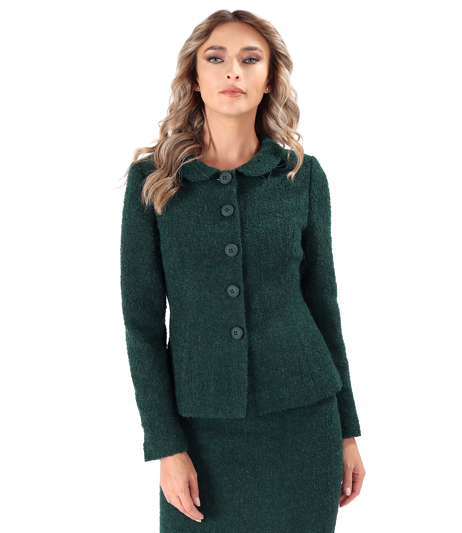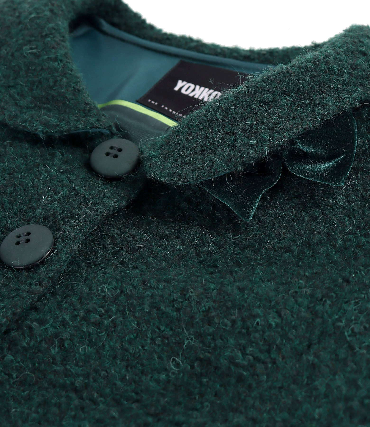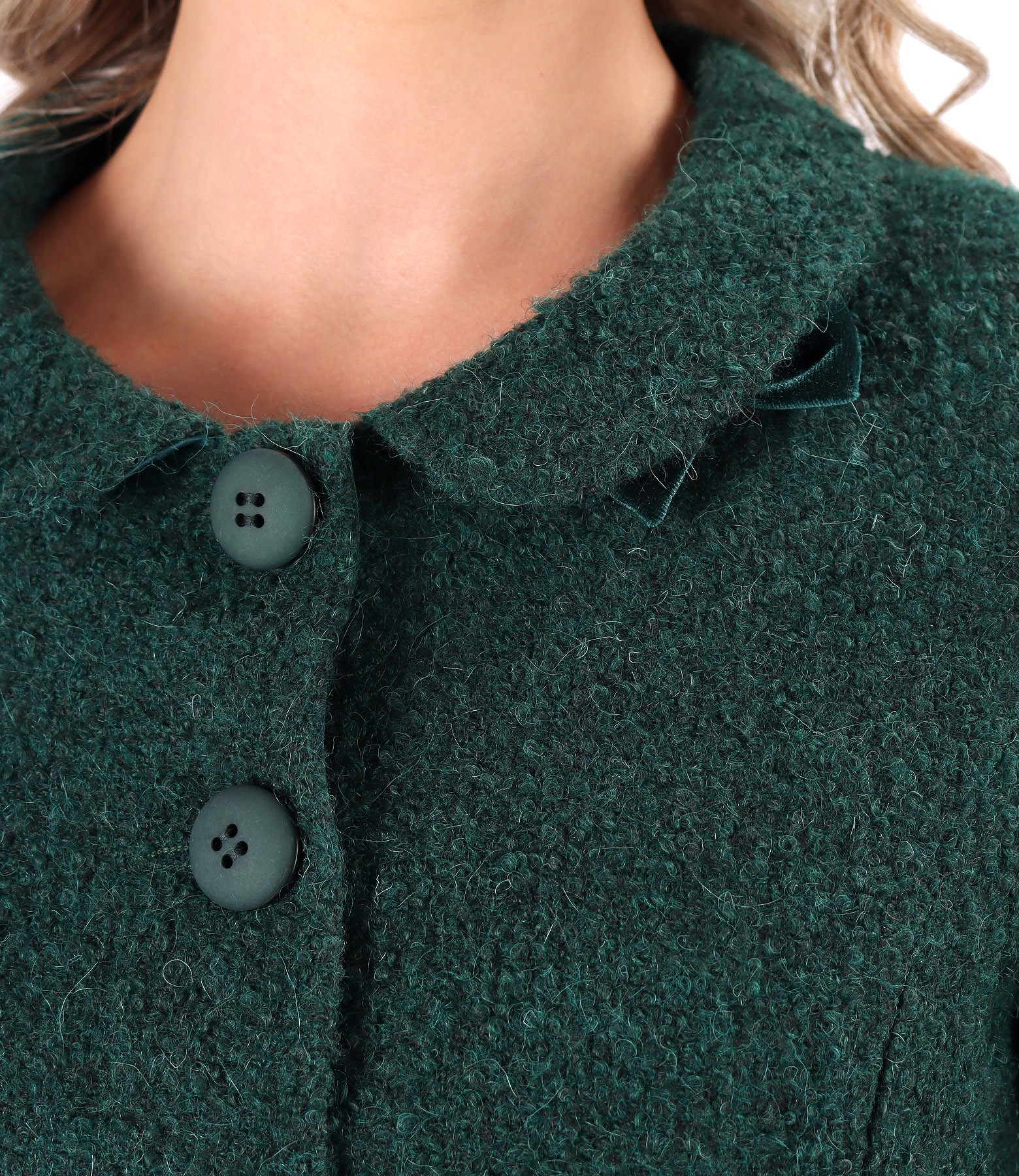 Wool and alpaca jacket with round collar and detachable velvet bow. Closes with 5 buttons.